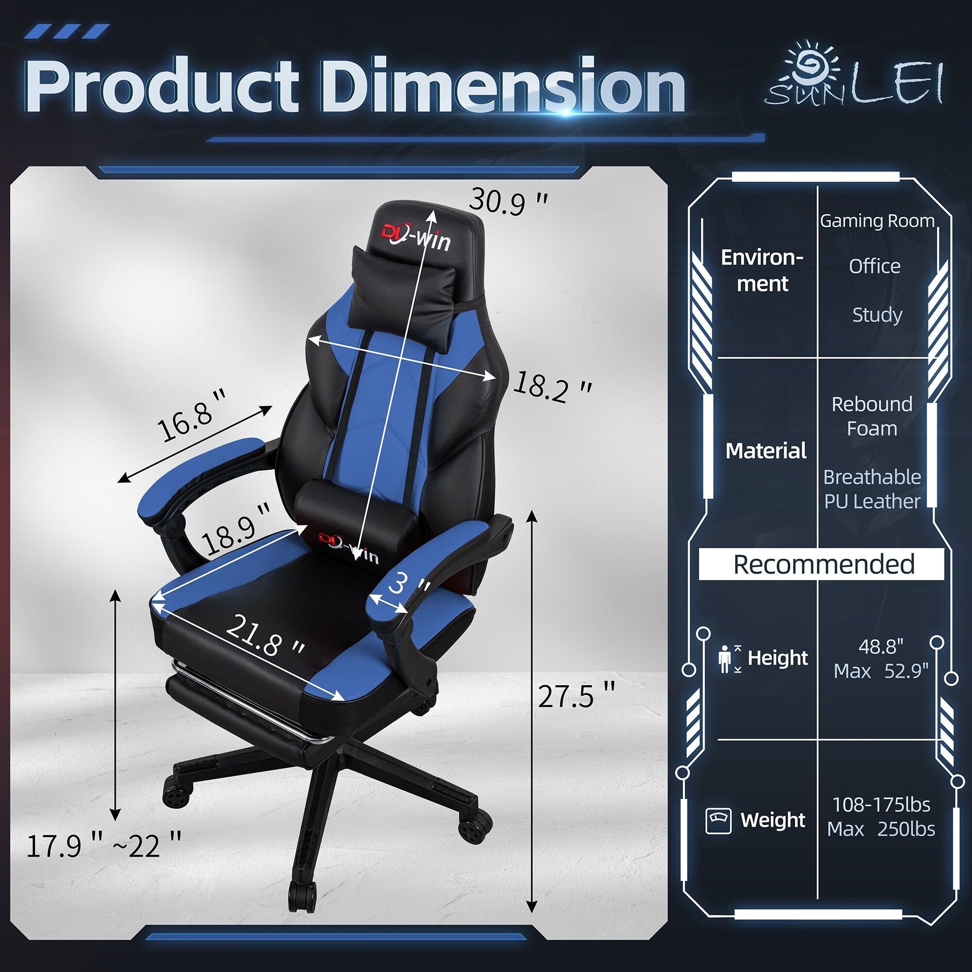 【Ergonomic Gaming Chair】This gaming office chair comes with a soft headrest and massaging lumbar support, a body-hugging high backrest that relieves neck and back fatigue for an ergonomic sitting experience while you play games, as well as a footstool to allow you to sit more comfortably, relax and enjoy your games in a more laid-back position.