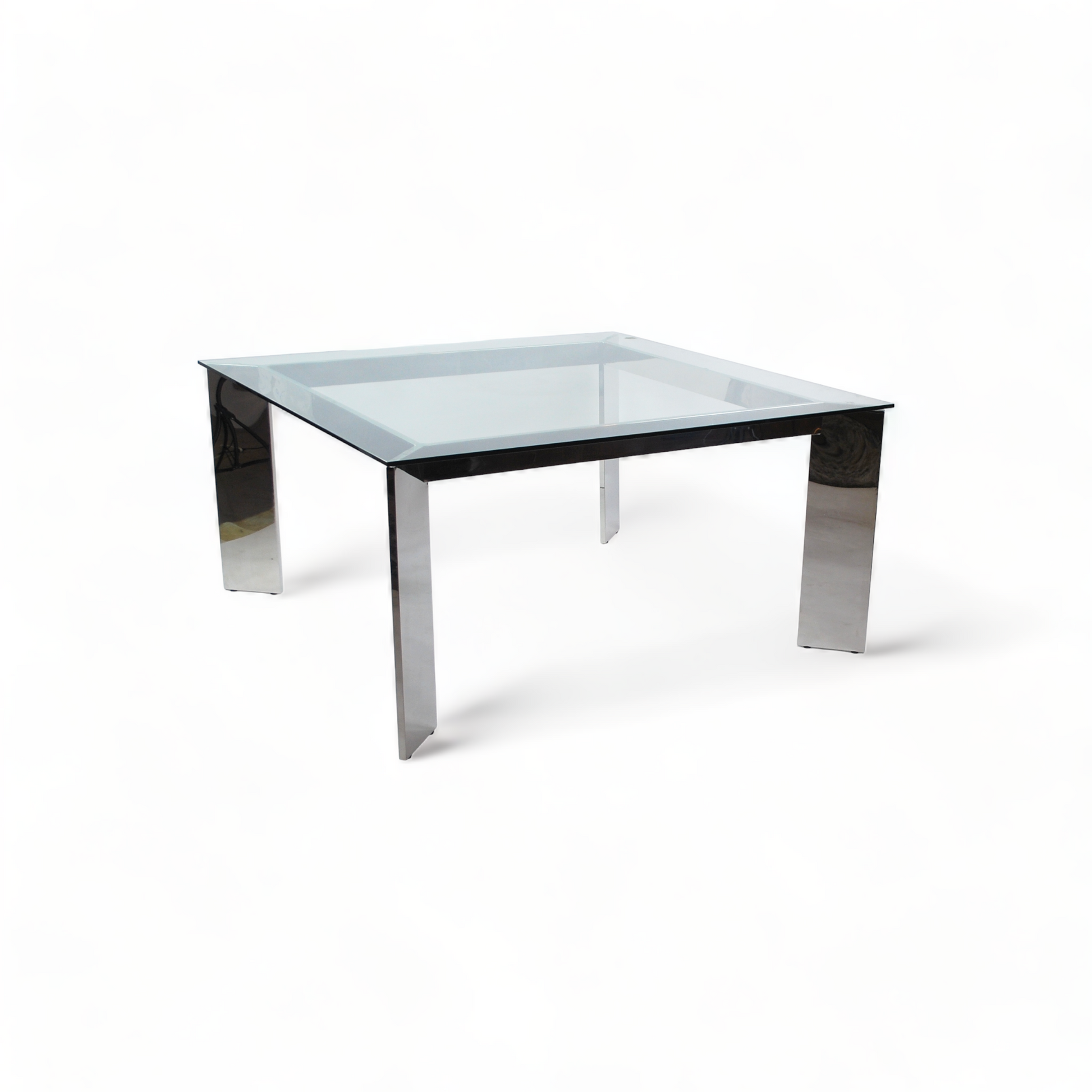 moderne et sophistiqué look élégant et léger de forme carrée, elle peut accueillir 8 personnes. plateau en verre trempé transparent base en acier inoxydable poli |