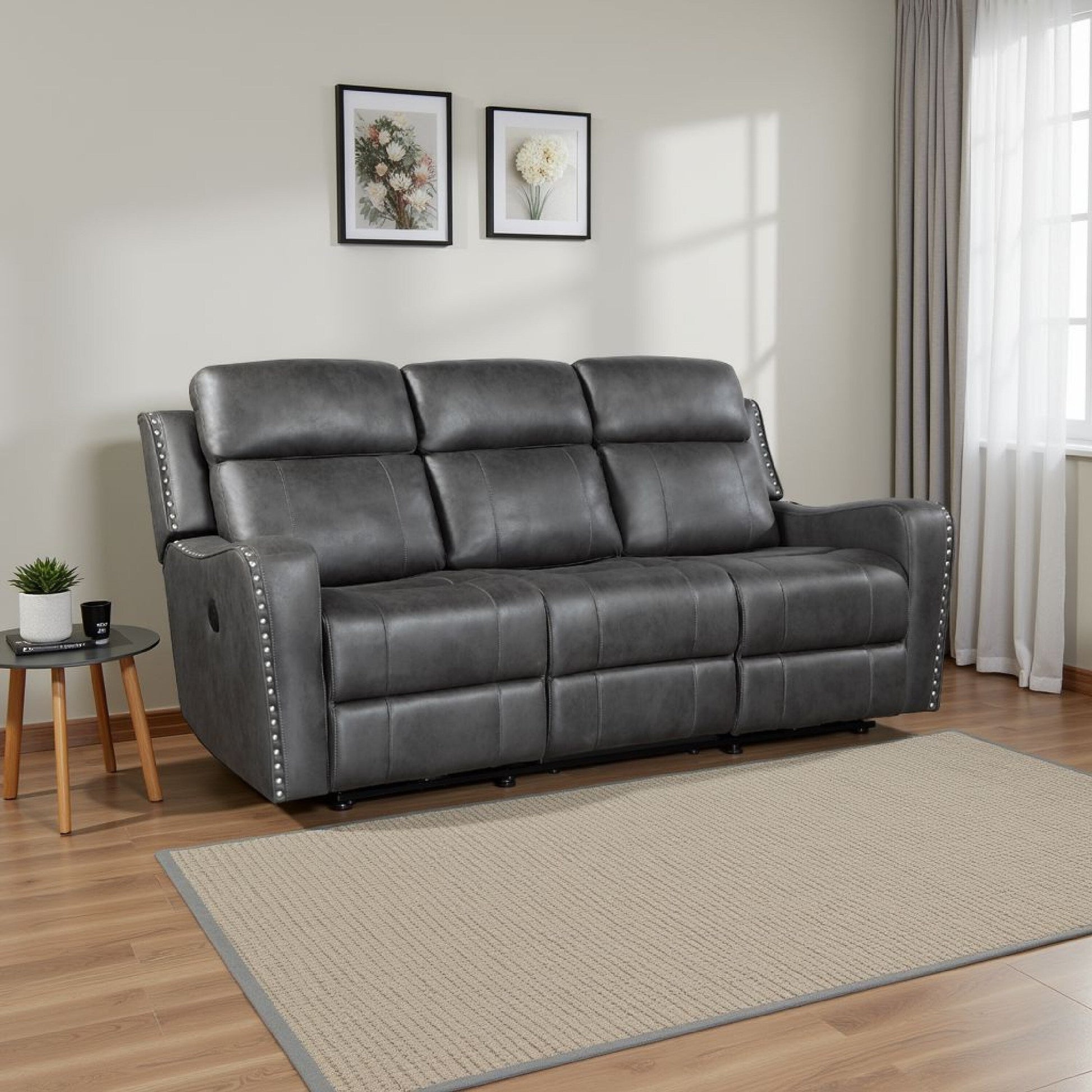 Unwind in refined comfort with this dual recliner sofa. Expertly crafted with a solid wood and plywood frame, it features a Dacron-wrapped high-density foam seat cushion and polished microfiber upholstery in a dark gray finish. Designed with a one touch power recline mechanism and elegant nailhead trim, this piece offers style and support. Explore our Gimo collection for more options.