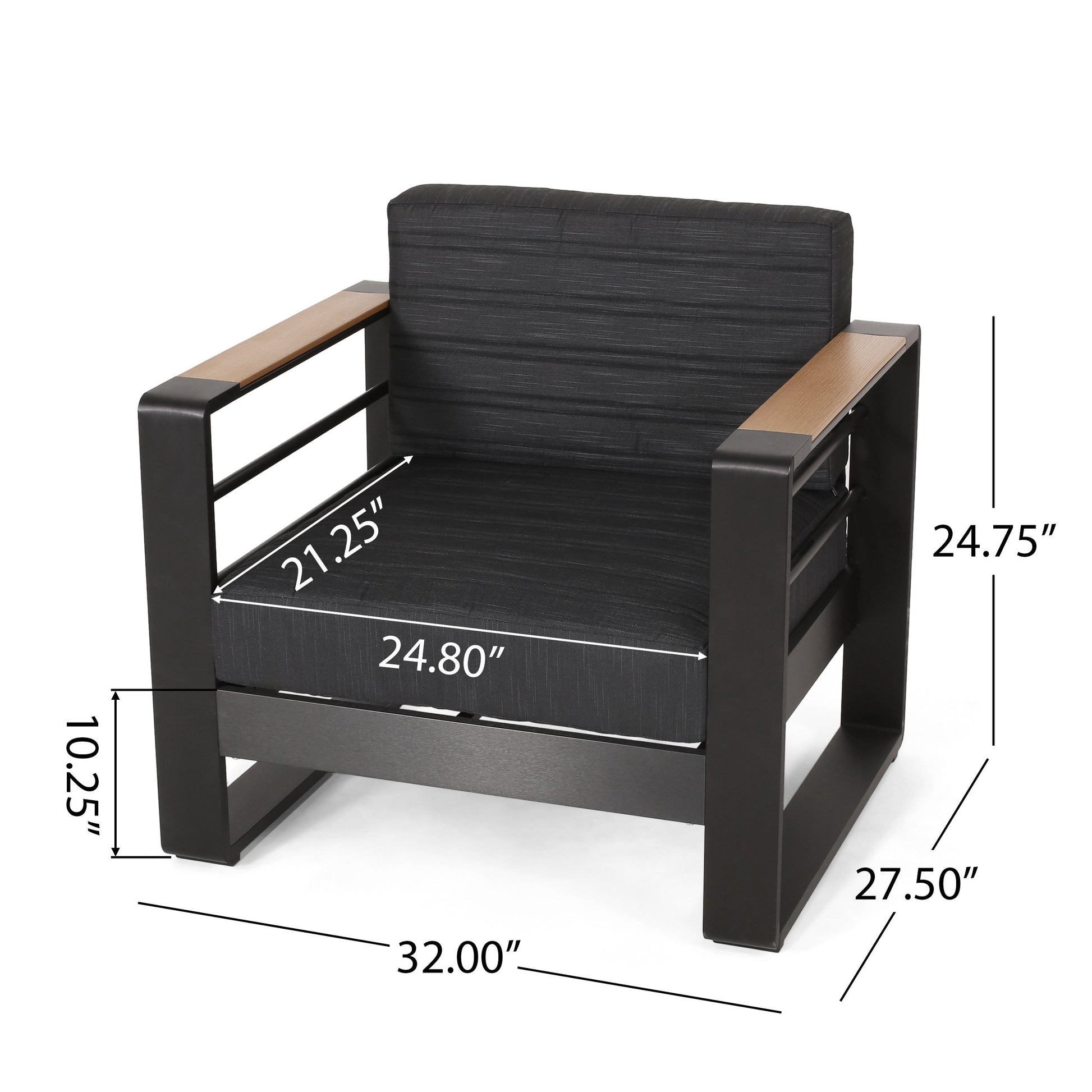 ALUMINUM FRAME WITH ACCENTS: This chat set is built with aluminum, creating a lightweight and stable frame. This material is rust-resistant which will further extend the life of your product. The armrests are finished with stunning wood composite accents for a beautiful natural wood look.