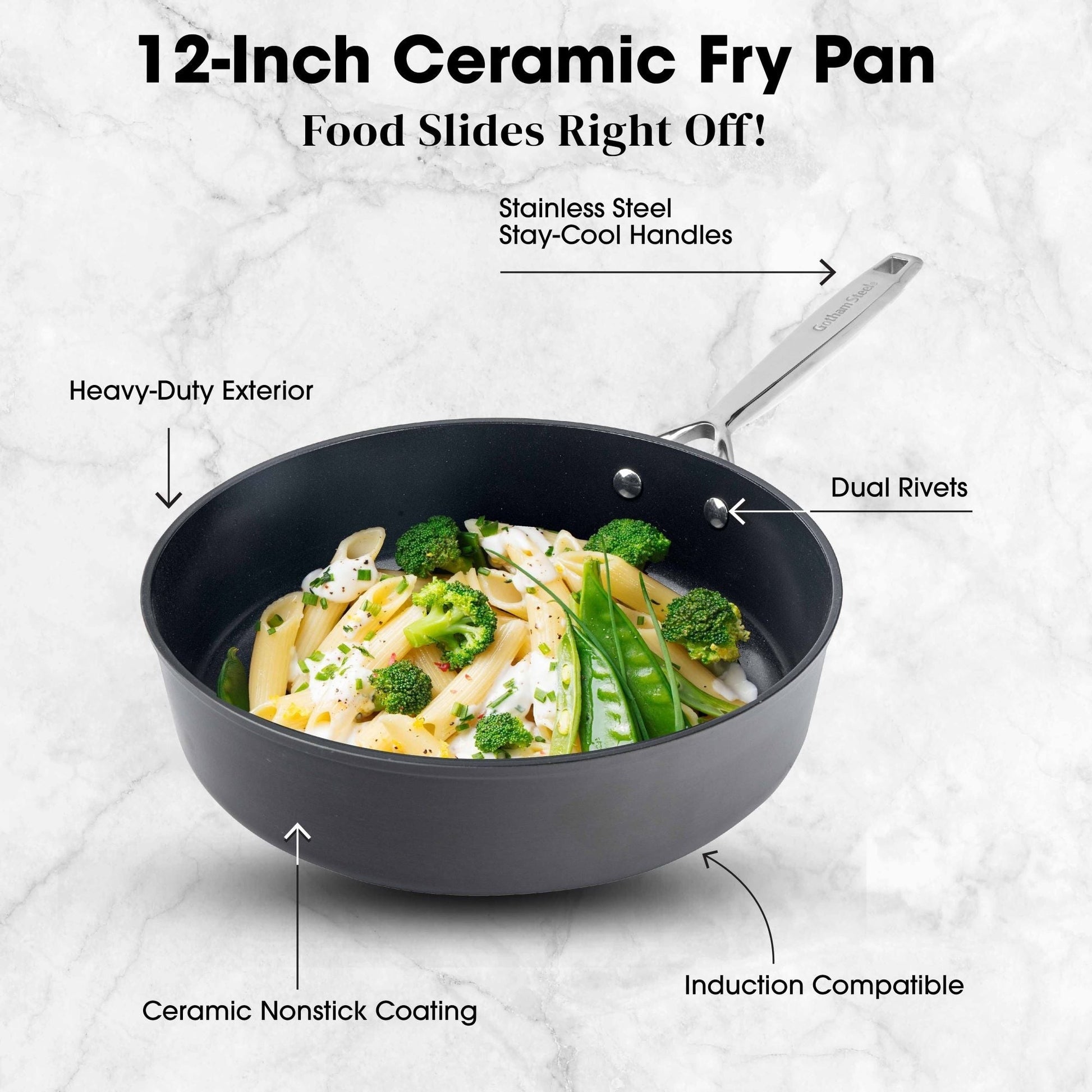 Elevate your cooking with the Gotham Steel Pro Ultra Ceramic 2X 4 Qt Deep Sauté Pan with Lid. This 12-inch deep pan is designed with a durable hard anodized exterior and an ultra-performance nonstick ceramic coating that delivers 2X better food release. Perfect for healthier cooking, it requires minimal to no oil or butter, and is made without PTFE, PFOA, PFOS, or lead. The stay-cool ergonomic stainless steel handles provide maximum comfort and safety while cooking. Its superior heat retention ensures even cooking with no hot spots, making it ideal for sautéing, frying, or simmering. Compatible with gas, electric, ceramic, and halogen stovetops, this pan is also oven safe up to 500°F and dishwasher safe for hassle-free cleanup.
