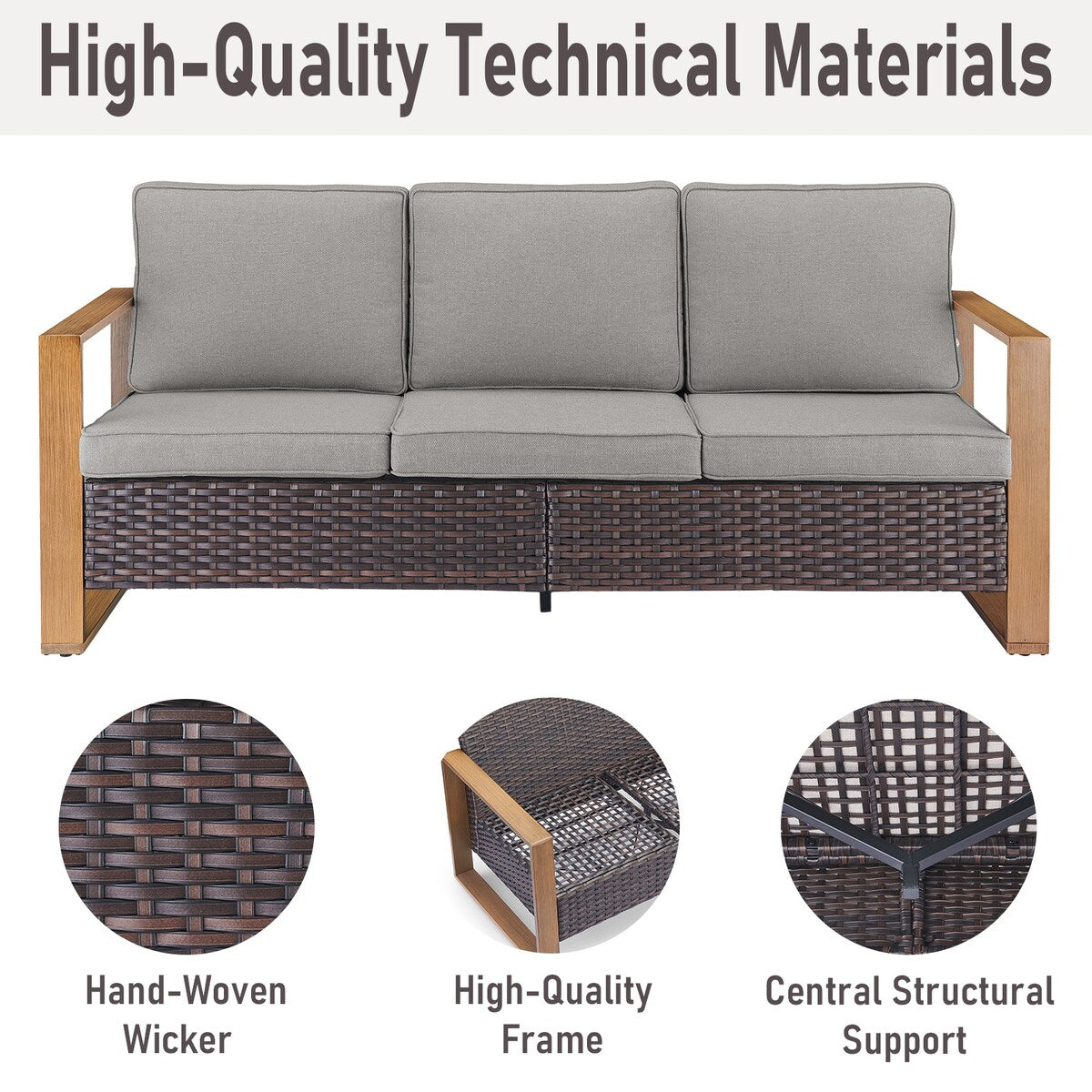 The patio furniture set is elegant and spacious. It transforms the touch of life into a meticulous taste, which is in line with the human scale. The comfy and luxurious ?high-density cushion seat cushions and thick sponge back cushion, give people strong lumbar support for better comfort. You could enjoy your 3-person rattan sofa with your family or friends on the front porch, poolside, garden, or backyard. For green life, our wicker patio sofa set is a good choice for you.