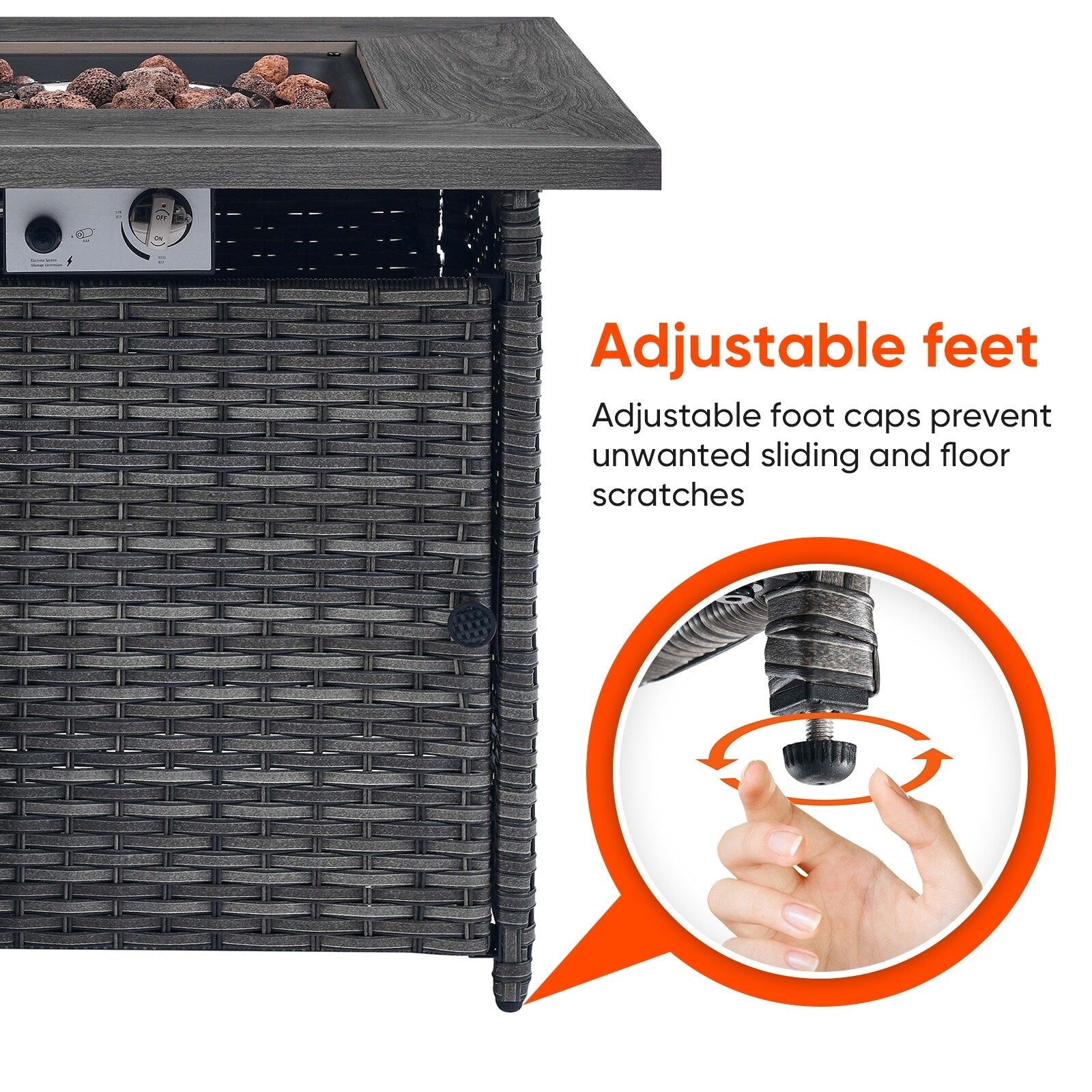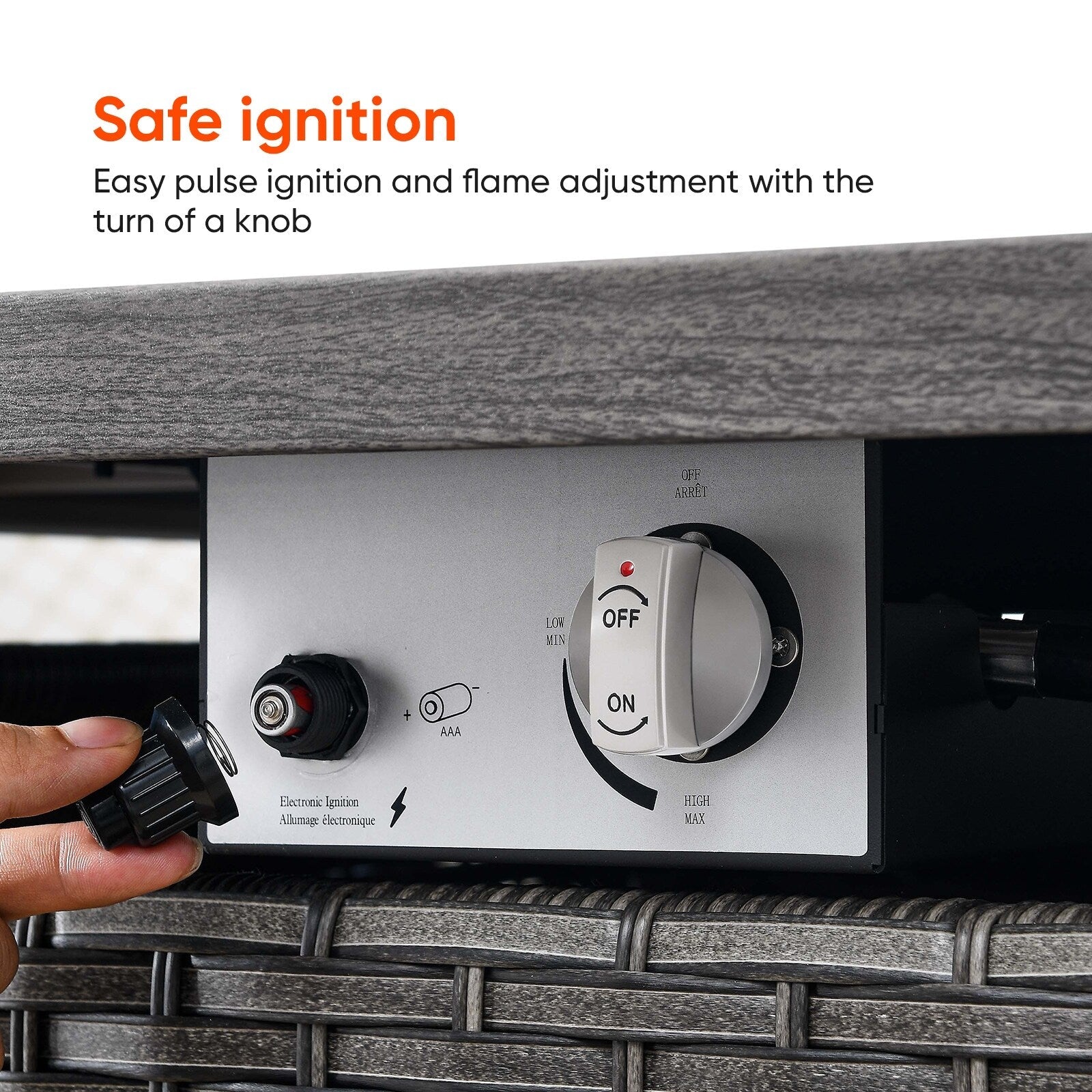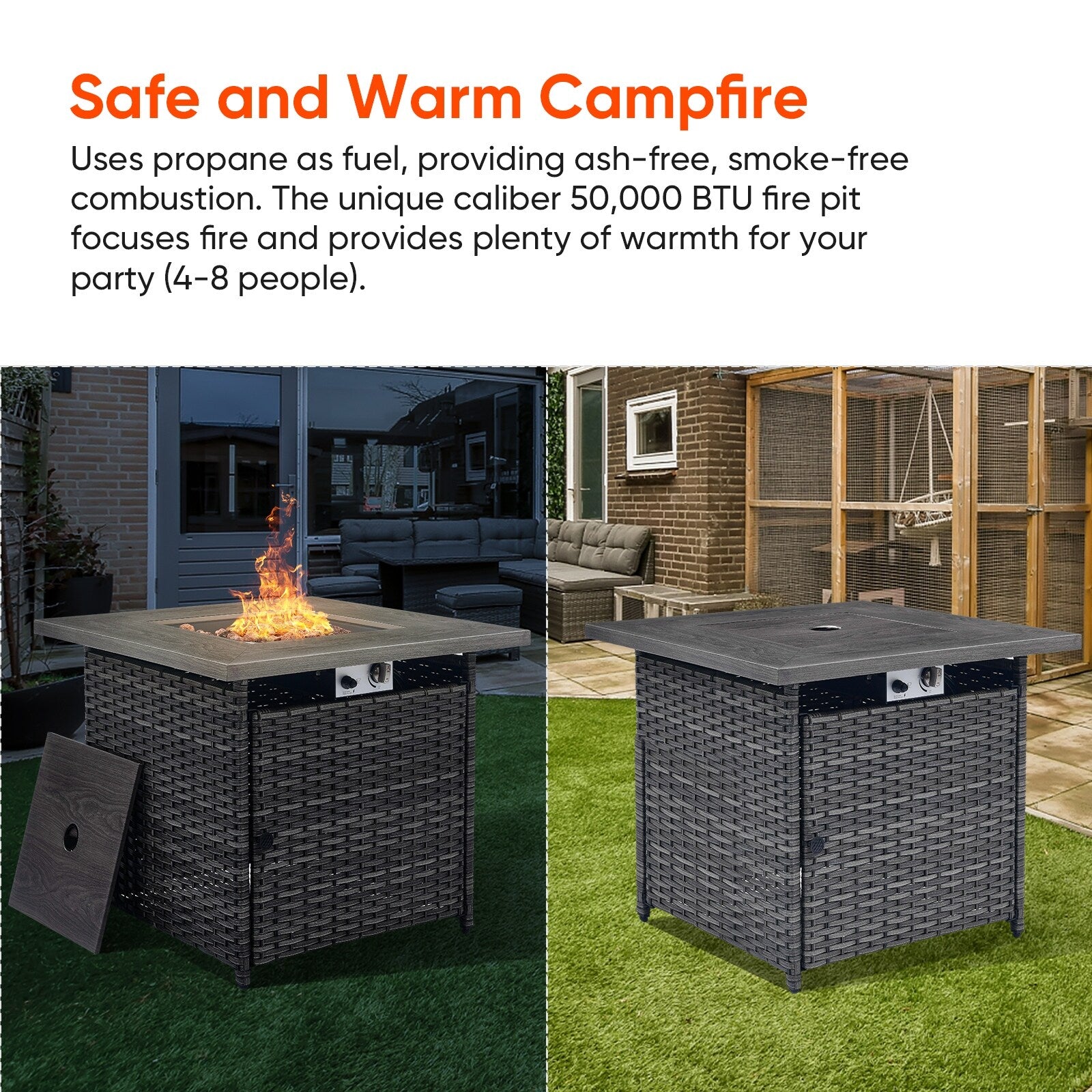 - 50000 BTU FIRE PIT TABLE: This patio fire pit table made of stainless steel frame.The heat output is 50,000 BTU after ignition, which keeps stable and fully burned, providing sufficient warmth. Propane fuel allows you to no longer suffer from ash and smoke.