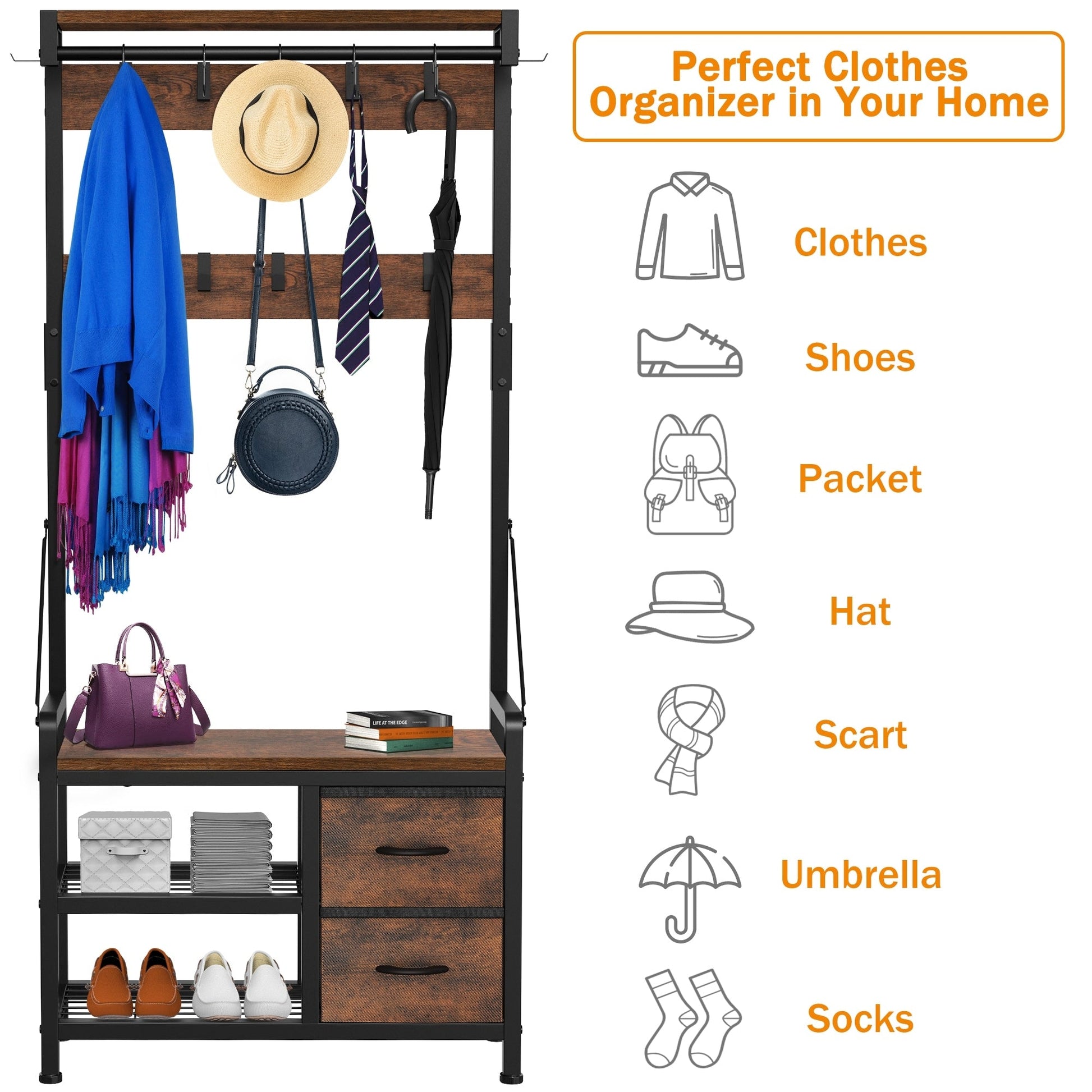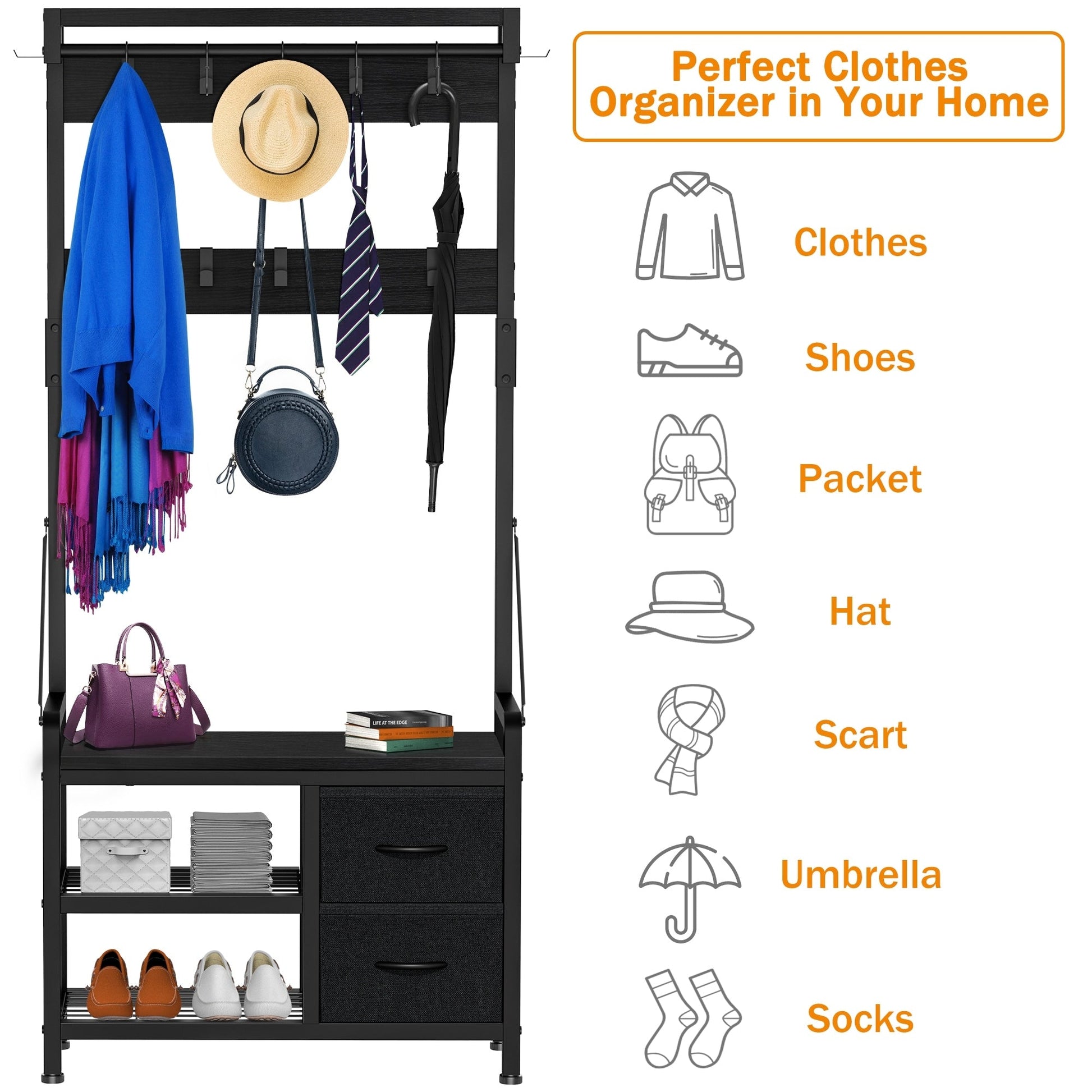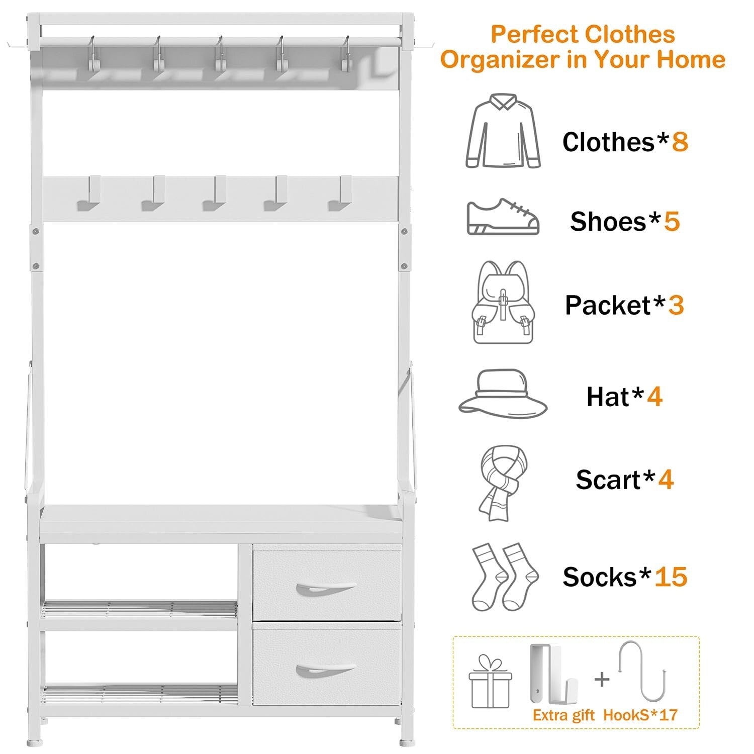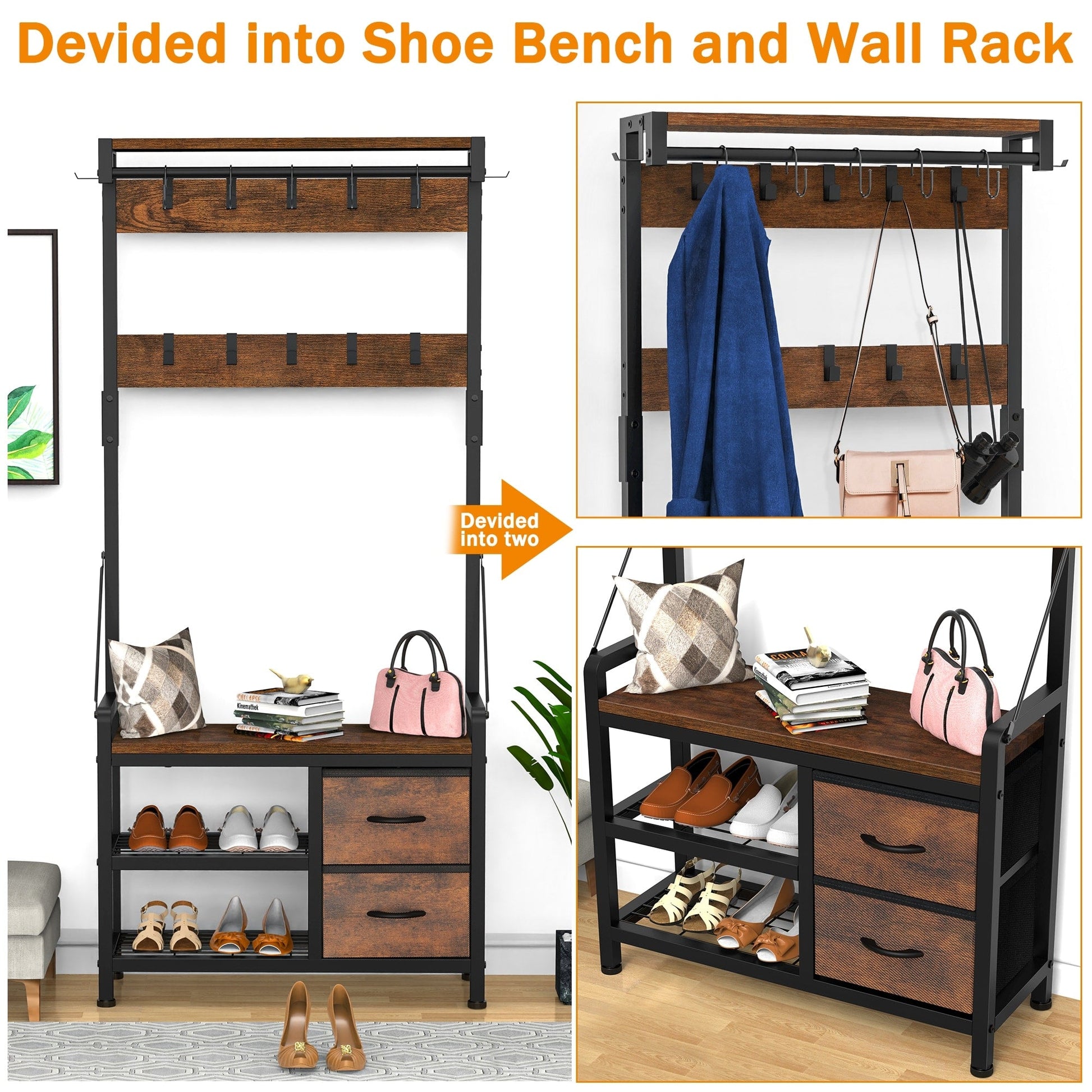 4 In 1 Design: Design with 2 shoe storage shelves,2 storage drawers, 1 bench, and 17 hooks gives you a space-saving entryway storage solution.