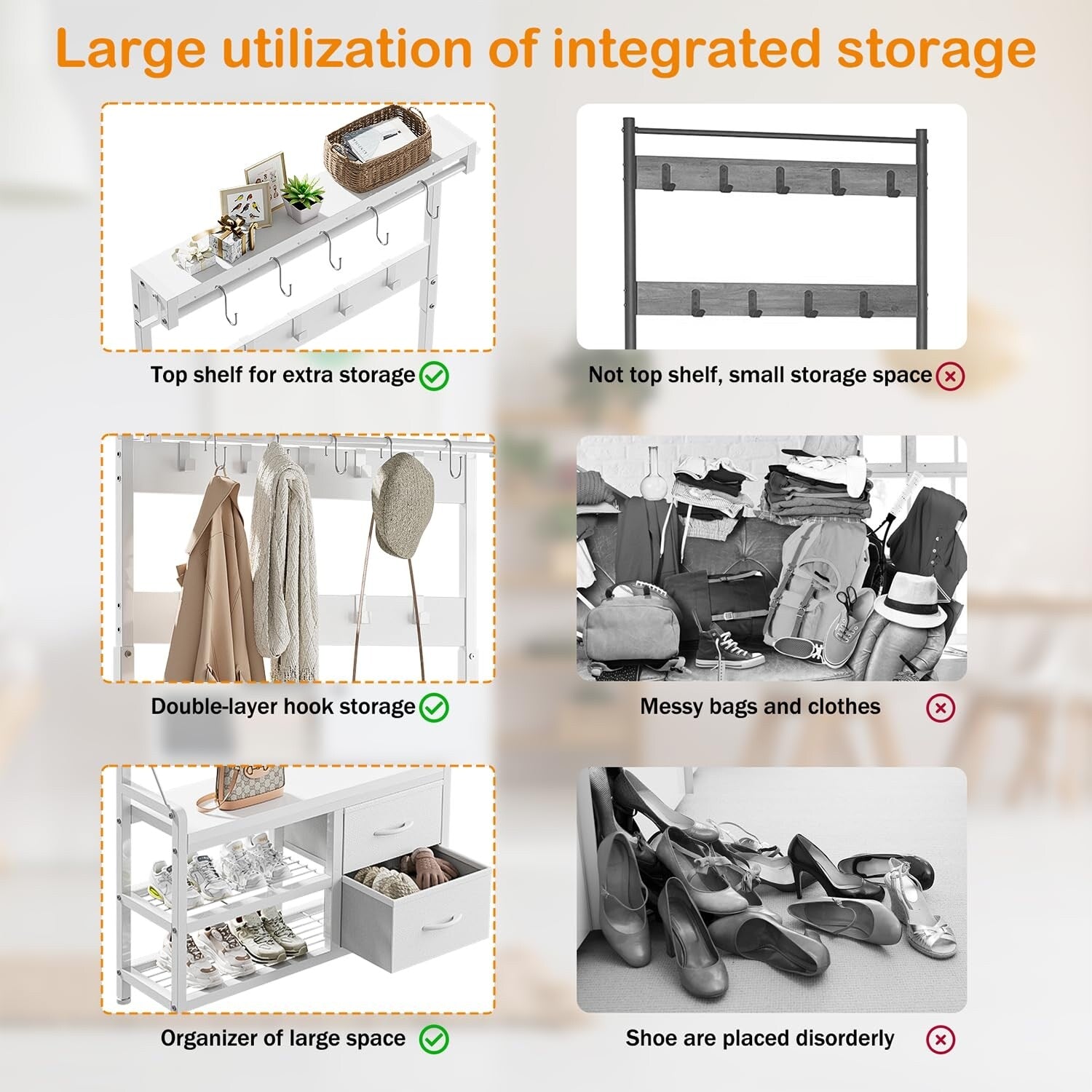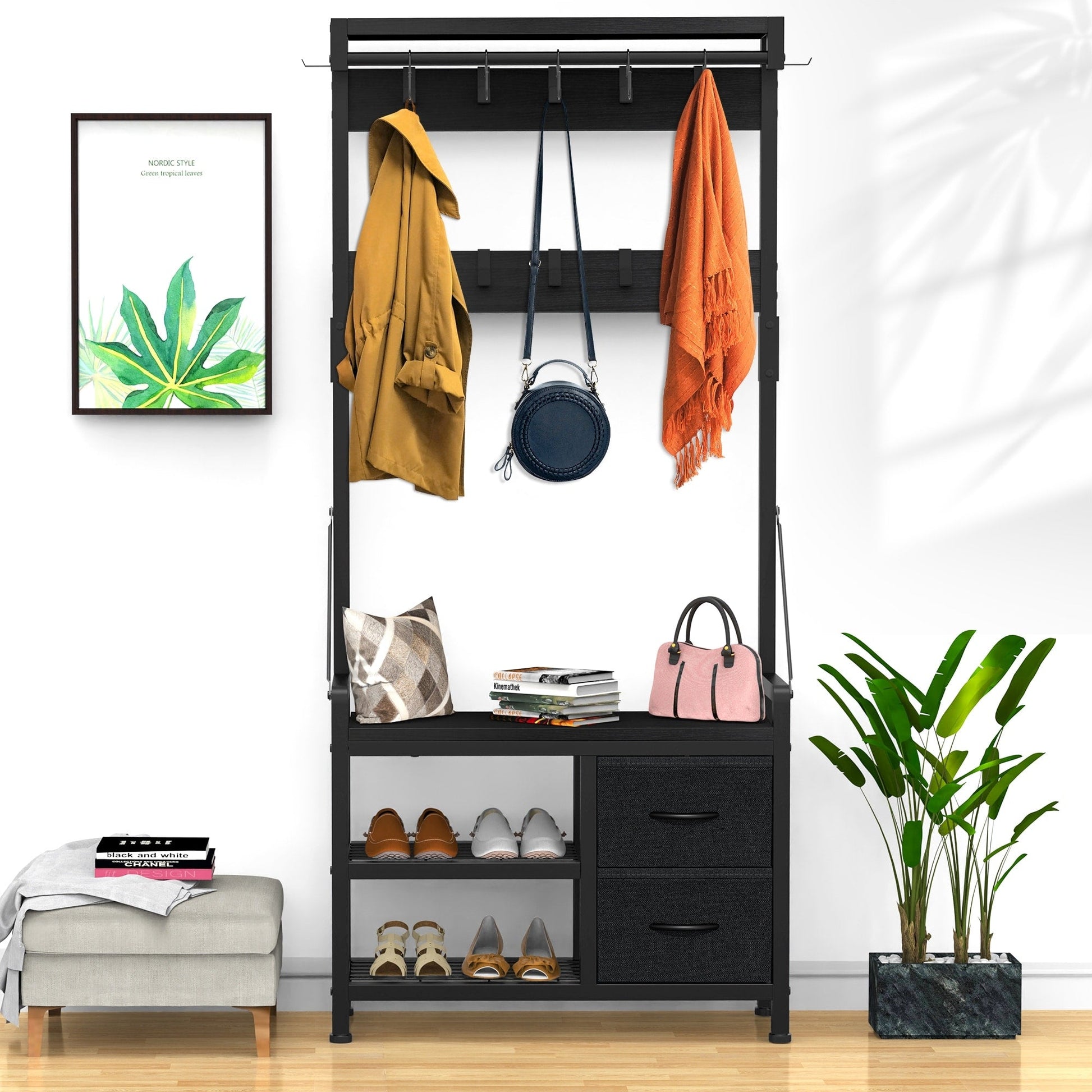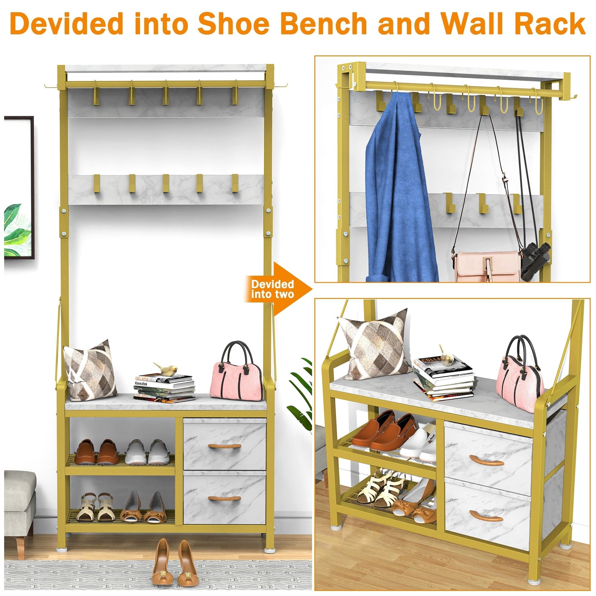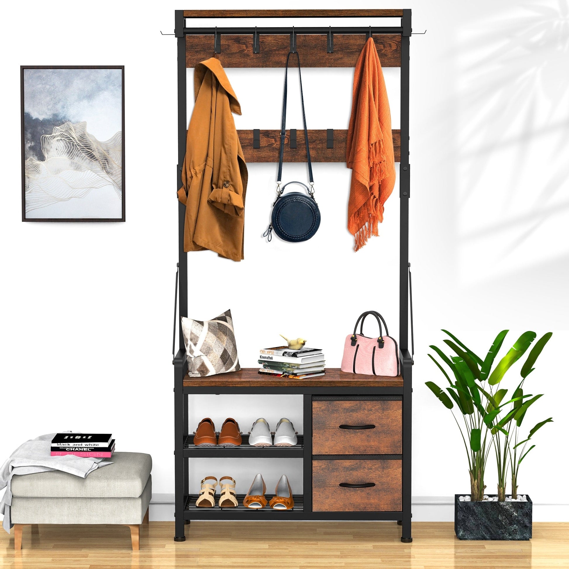 4 In 1 Design: Design with 2 shoe storage shelves,2 storage drawers, 1 bench, and 17 hooks gives you a space-saving entryway storage solution.