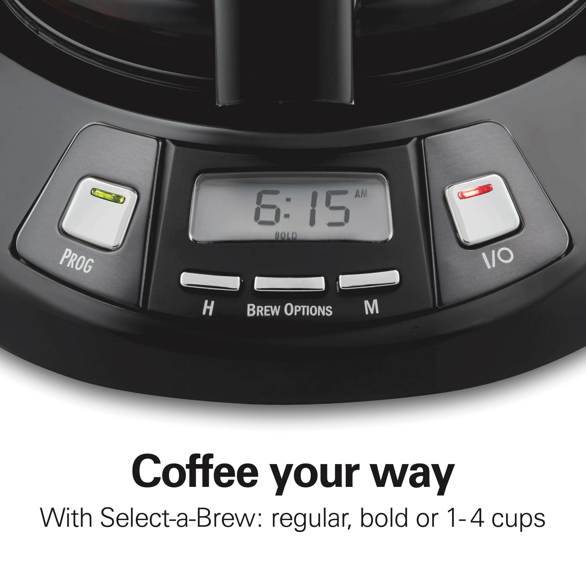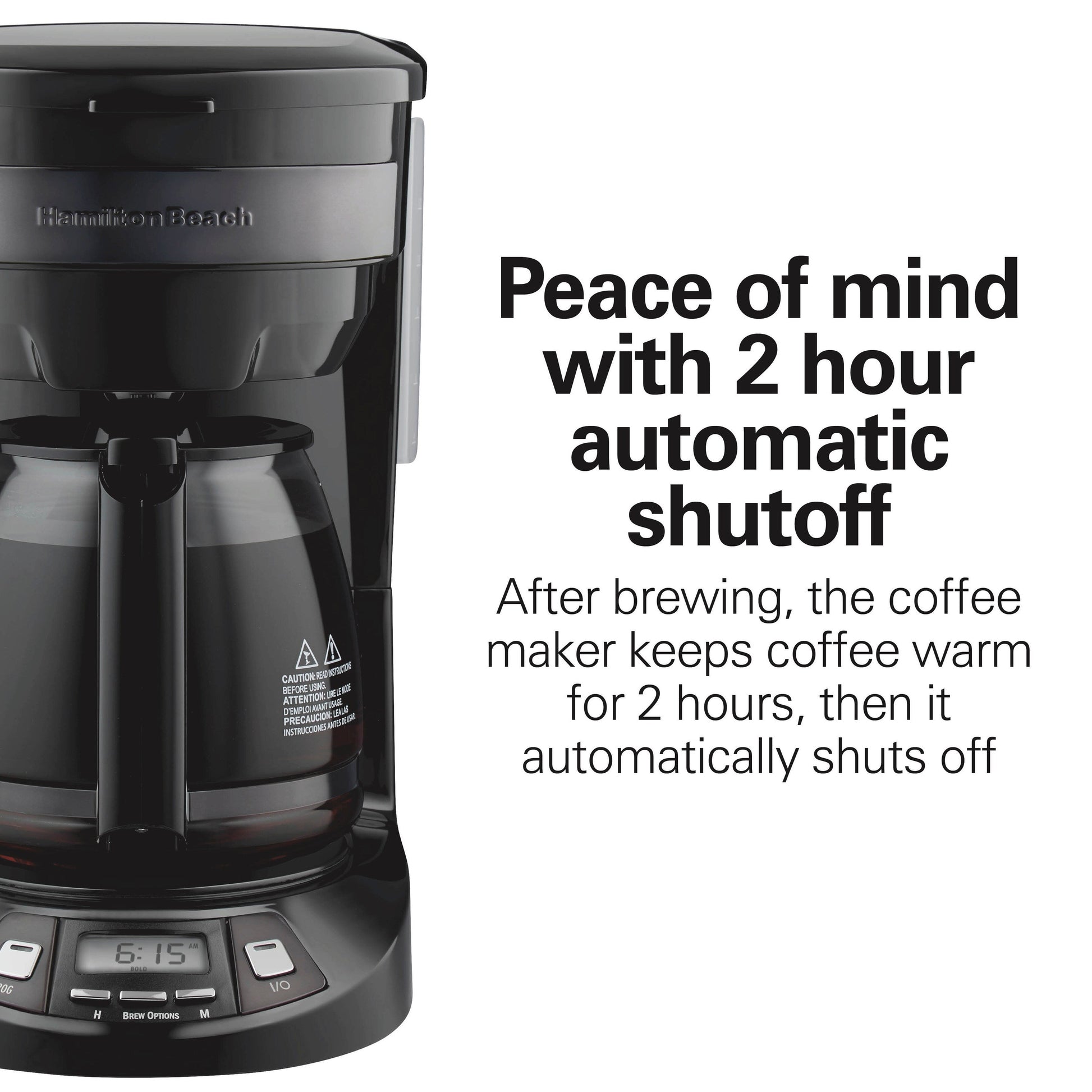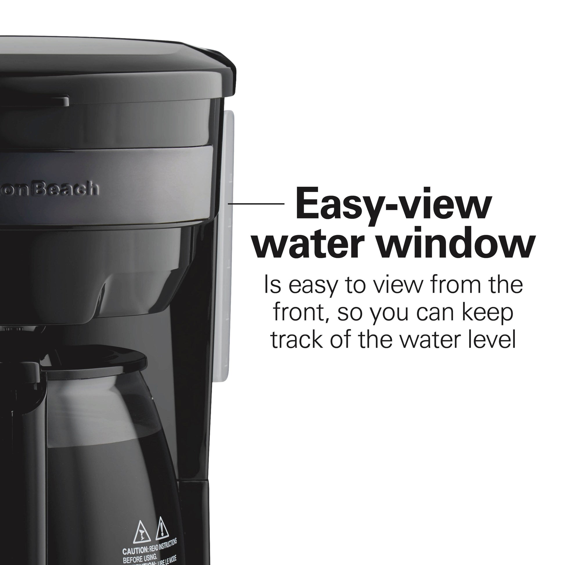 The Hamilton Beach® Black Stainless Coffee Maker comes in classic black and has stylish black stainless steel accents, so it looks great in every kitchen. The Easy-Touch programming lets you program the coffee maker the night before and wake up to piping hot coffee every morning. The Auto Pause & Pour feature briefly delays the flow of coffee so you can sneak a cup before brewing stops without making a mess. Each brew is flavorful and can be customized to suit your taste. Choose from three Select-a-Brew options: regular, bold and 1-4 cups for brewing smaller servings. After brewing, coffee stays warm in the carafe for 2 hours, then the power automatically shuts off for your peace of mind. The Hamilton Beach Black Stainless Coffee Maker is easy to fill and features an easy-view water window that makes it easy to view the precise water level from the front of the machine. For easy cleanup after brewing, the 12 cup glass carafe and removable brew basket are dishwasher safe.