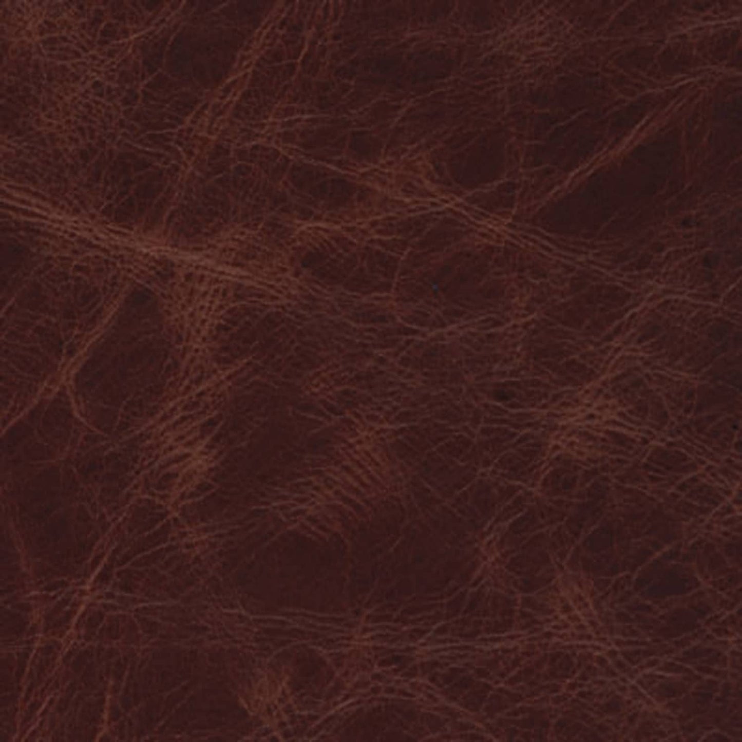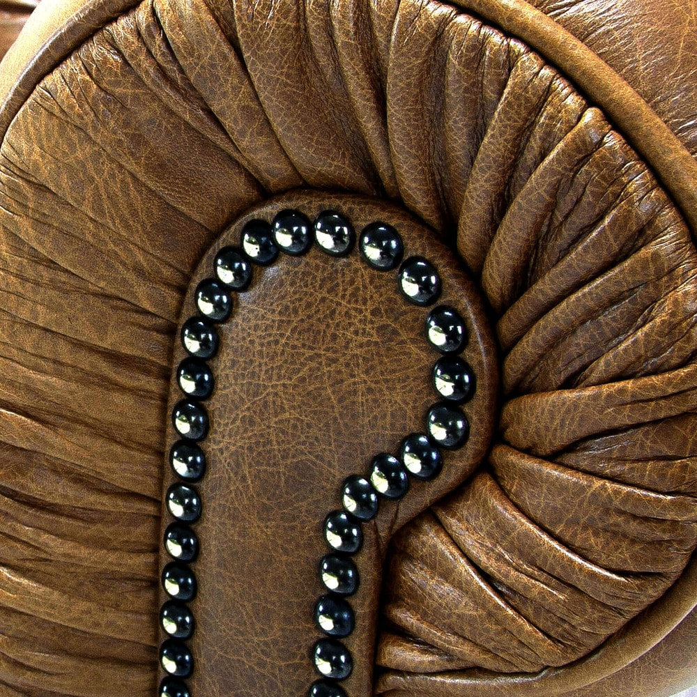 - Distressed ranch brown leather, brass finish studs, walnut stained wood legs