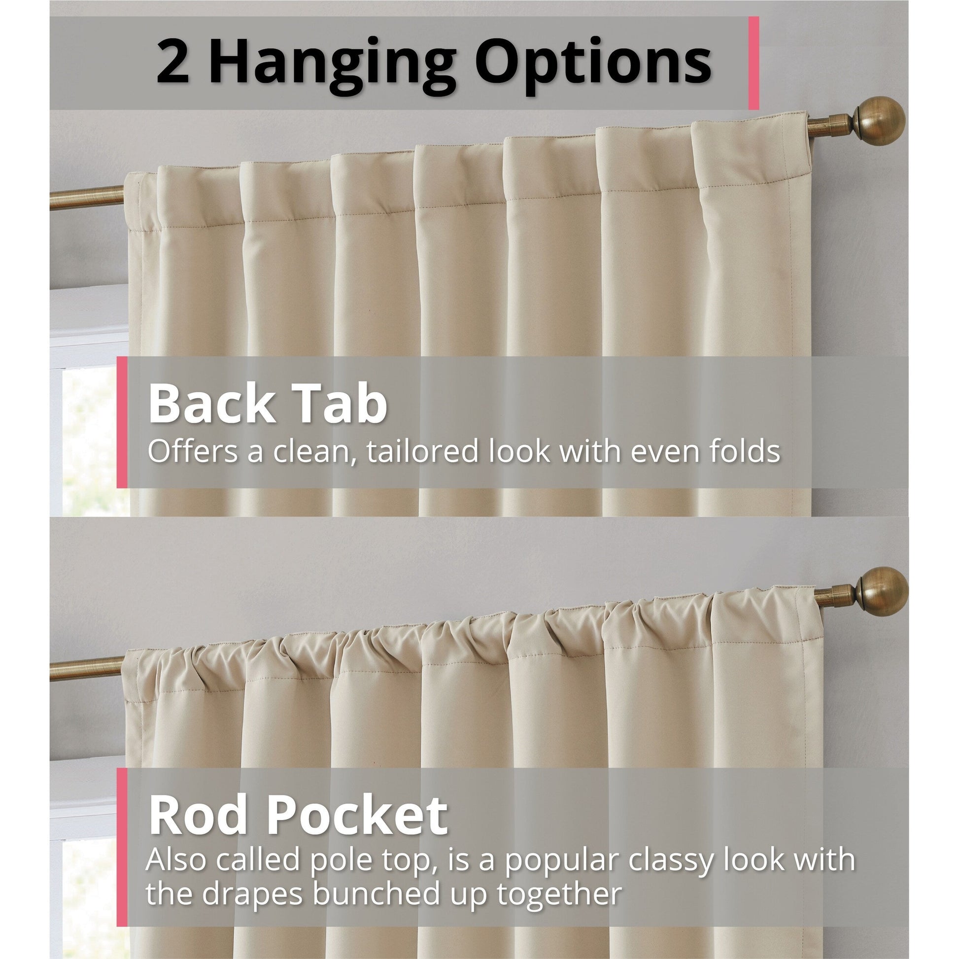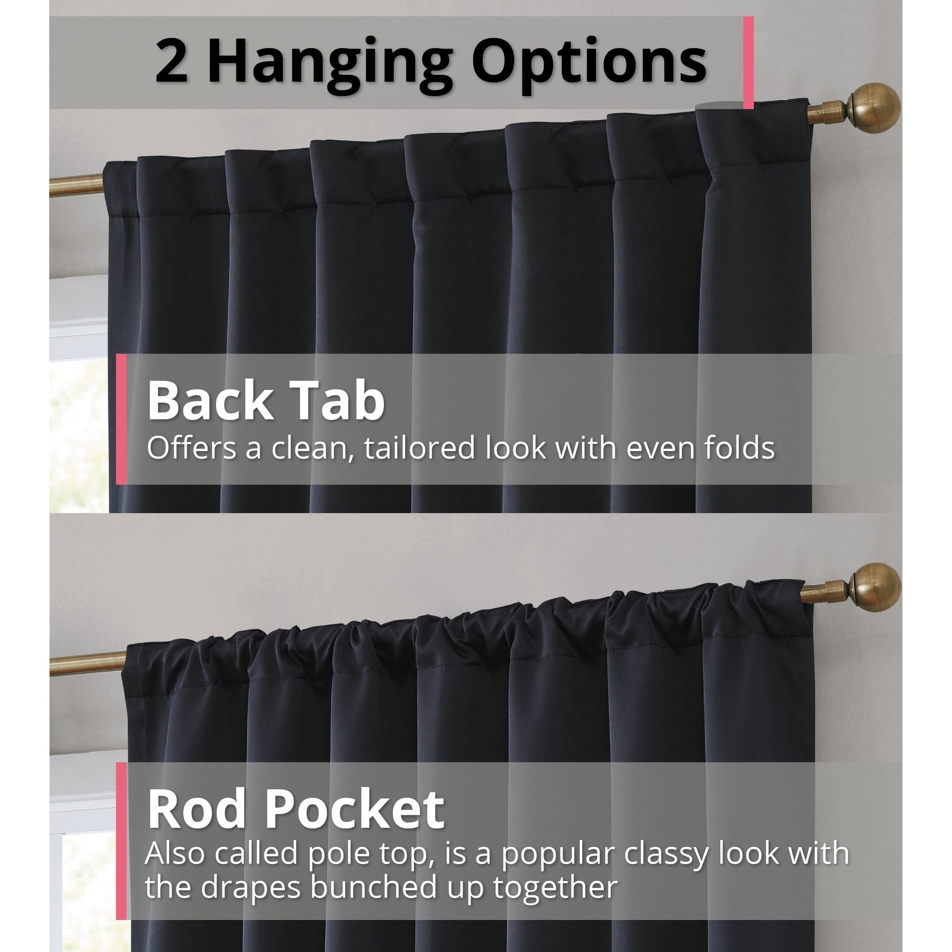 Two Hanging options: Rod Pocket or Back Tab