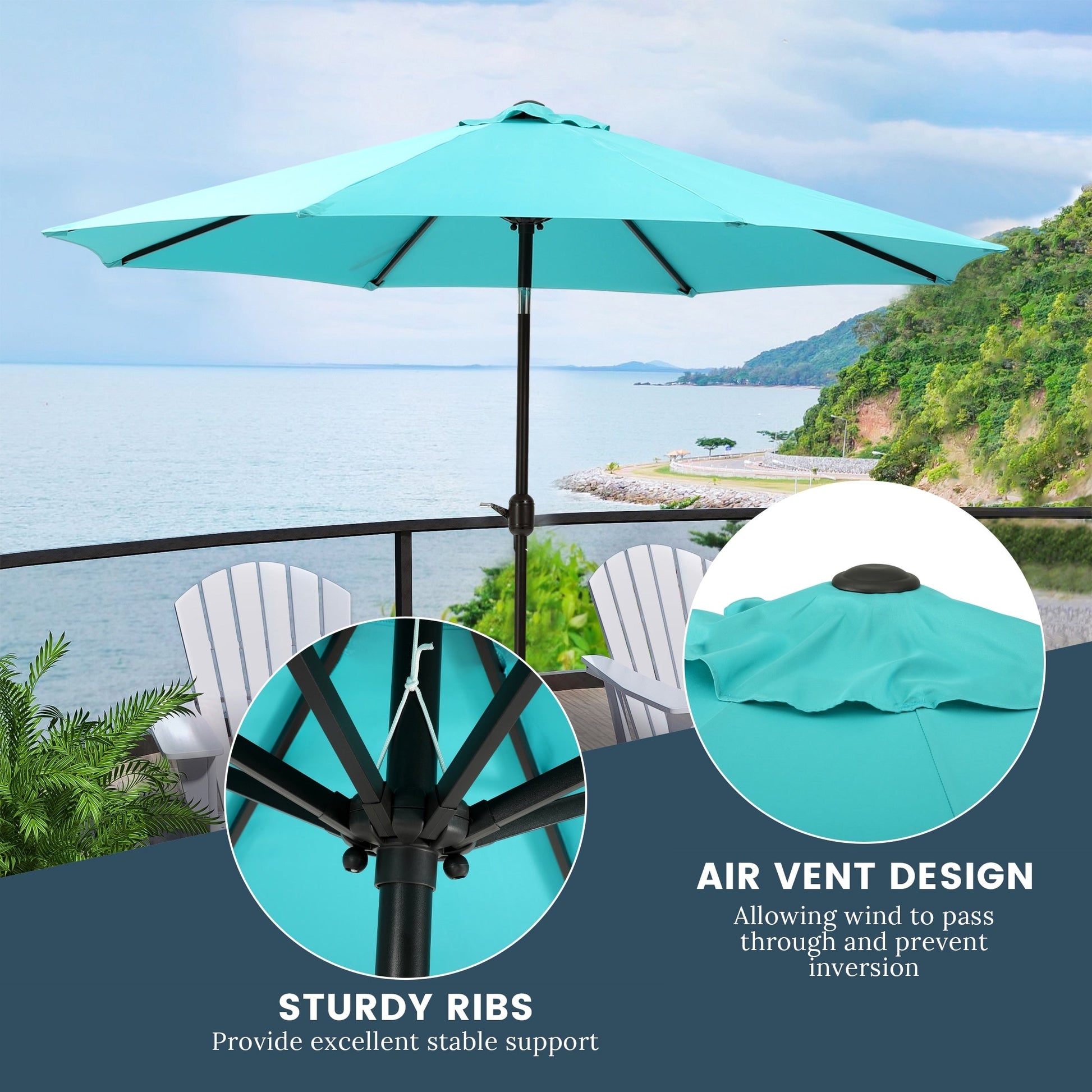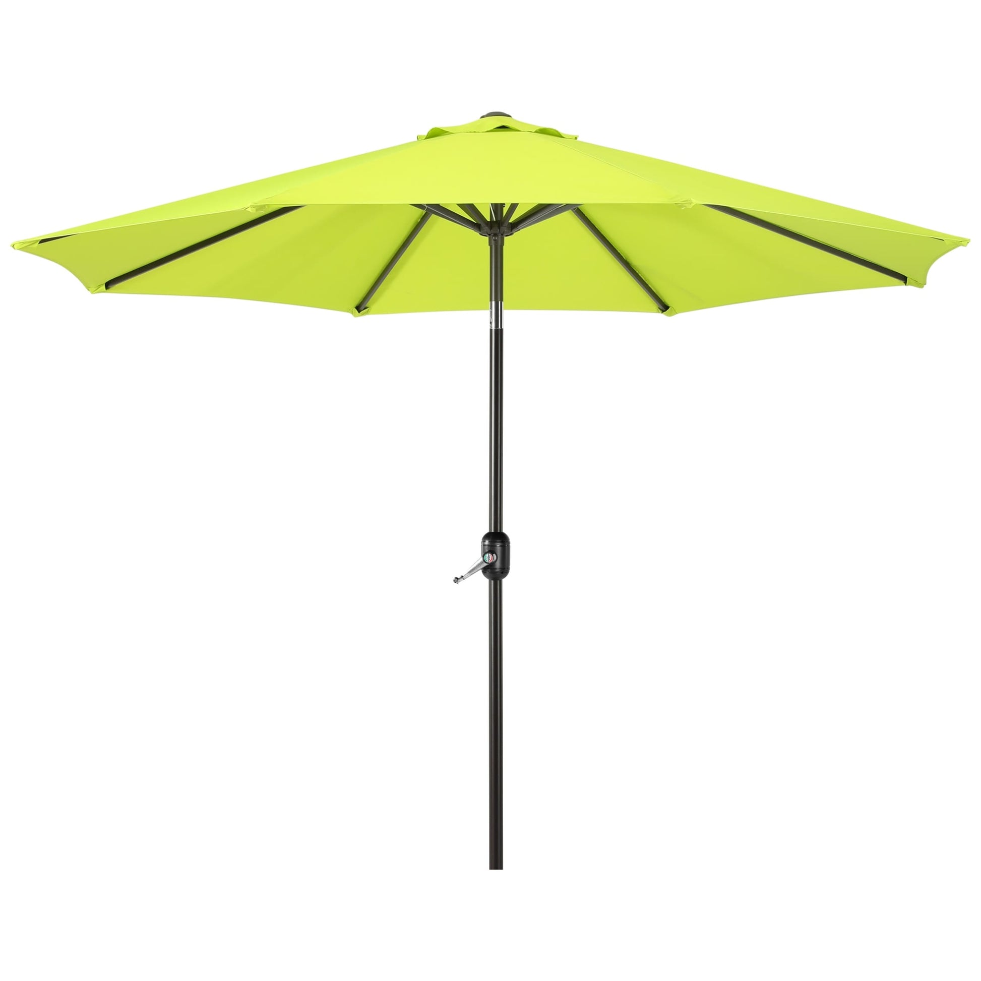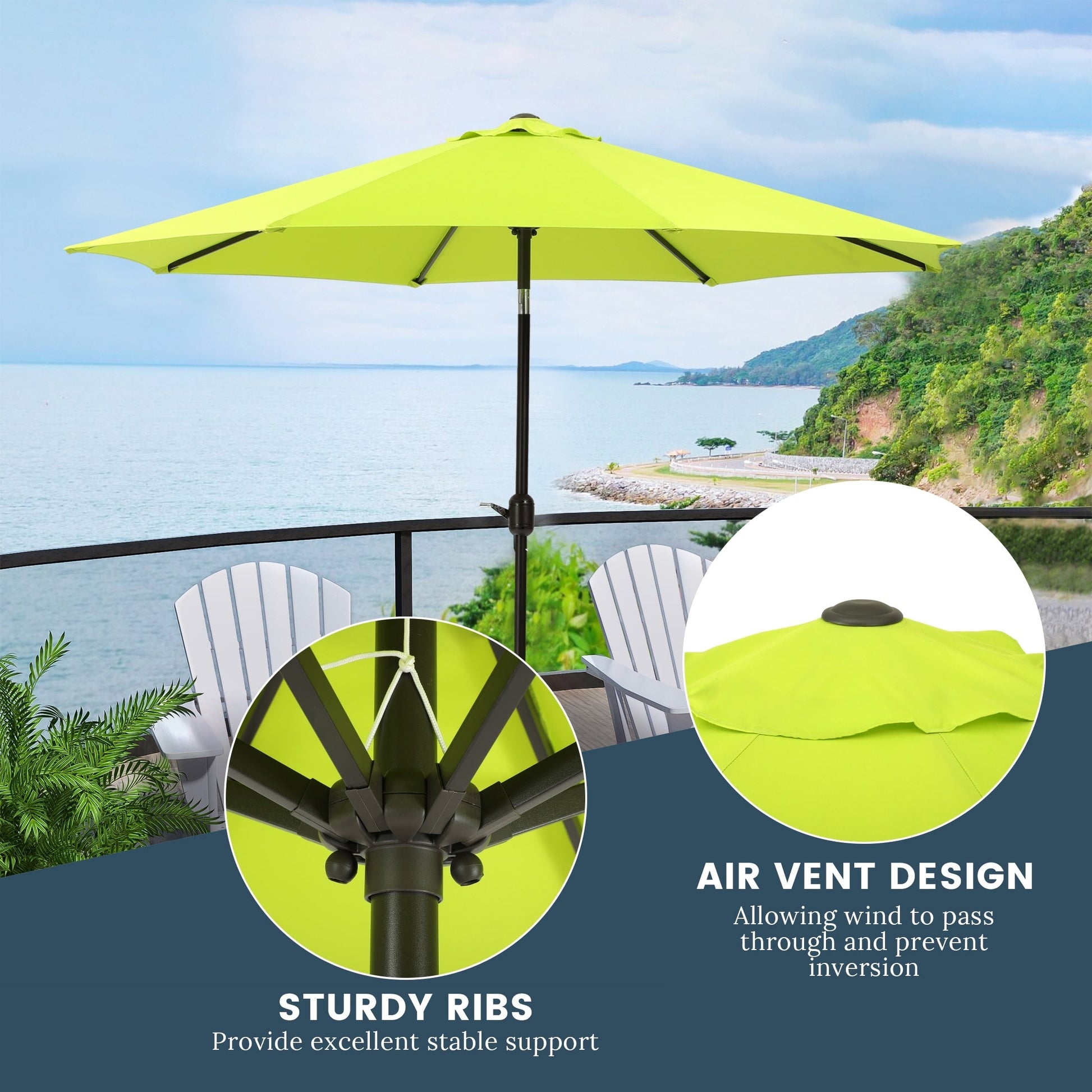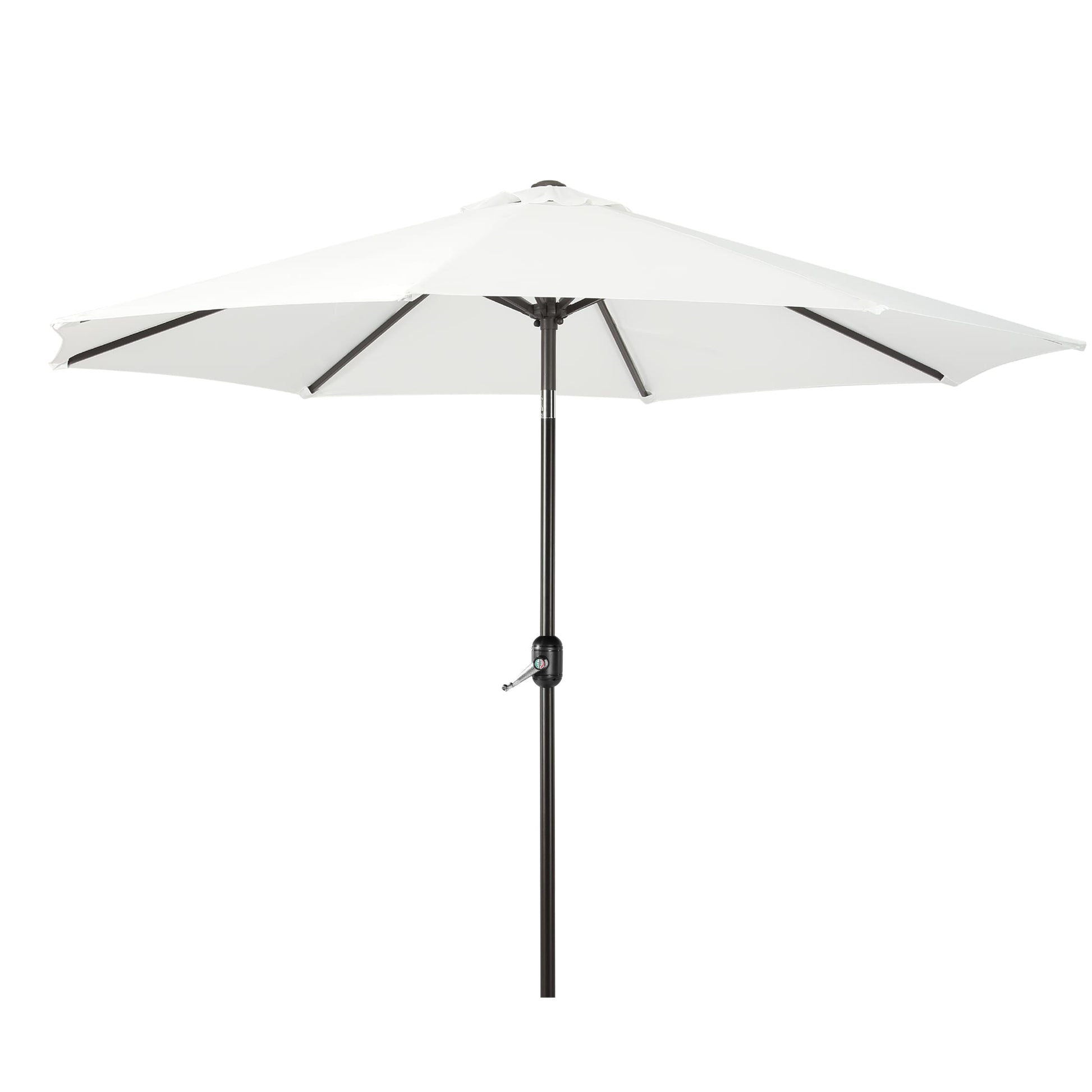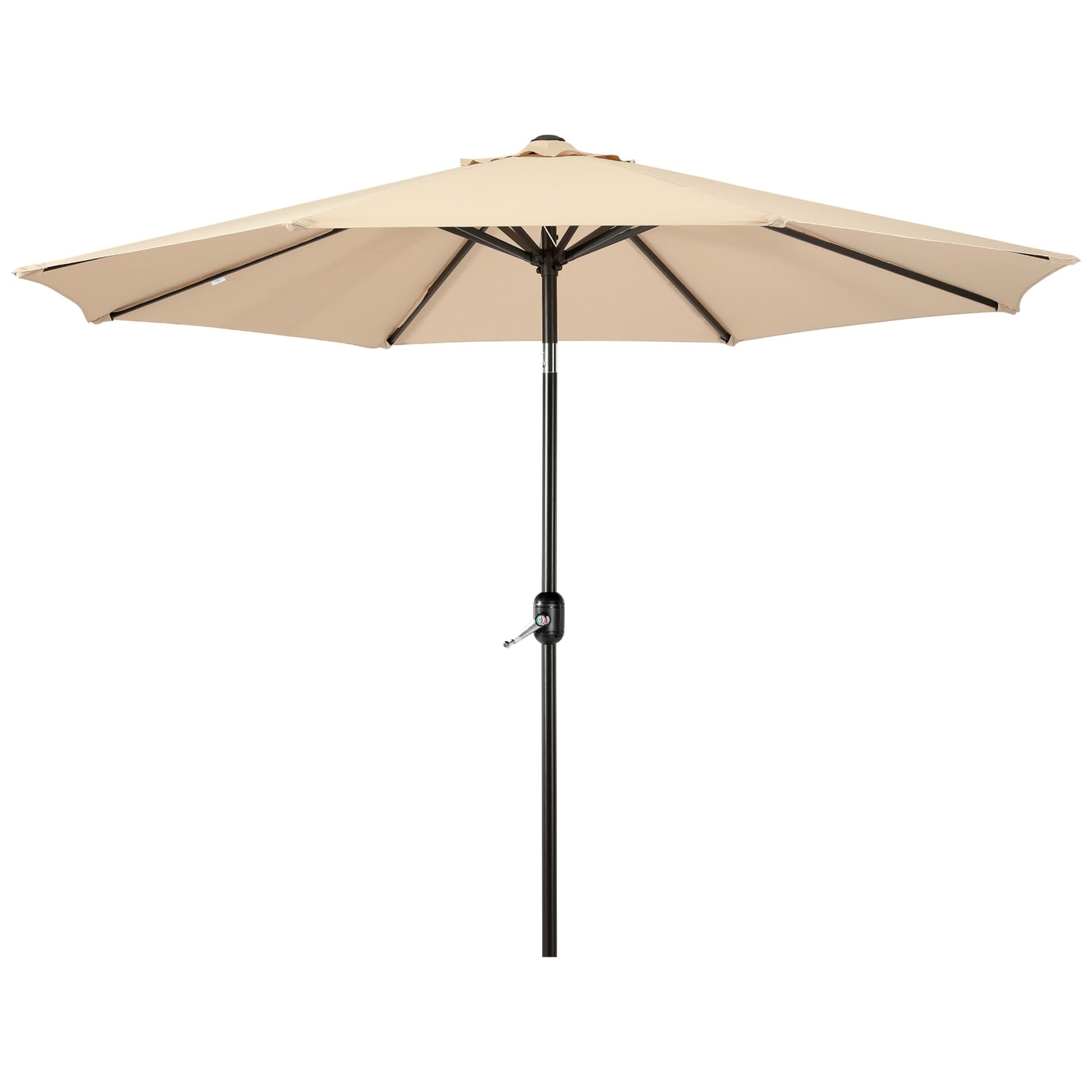 Enjoy the sunshine and scenery while keeping cool under this 9-foot steel outdoor patio table umbrella. Designed with style and durability in mind, this piece is built with a rust- and water-resistant steel frame and polyester fabric that blocks up to 95% of UV rays. The easy-to-crank lift mechanism allows for a simple open and close system when not in use. This 9-foot umbrella is perfect for your patio, garden table, outdoor dining table, pool, or lounge area. Available in multiple colors to fit your décor needs.