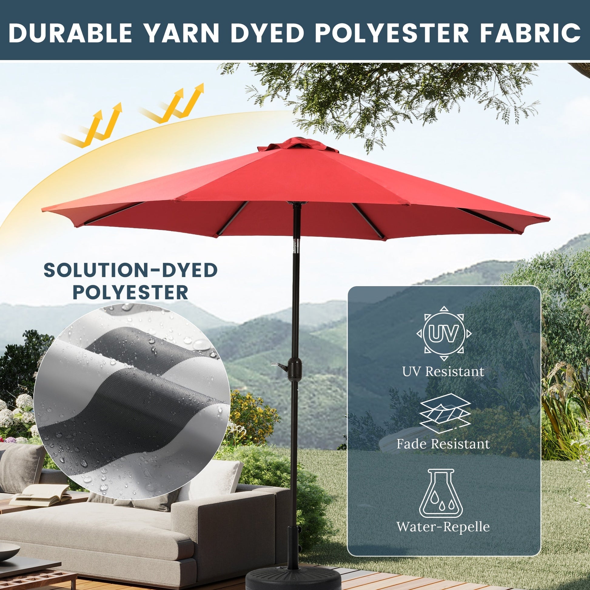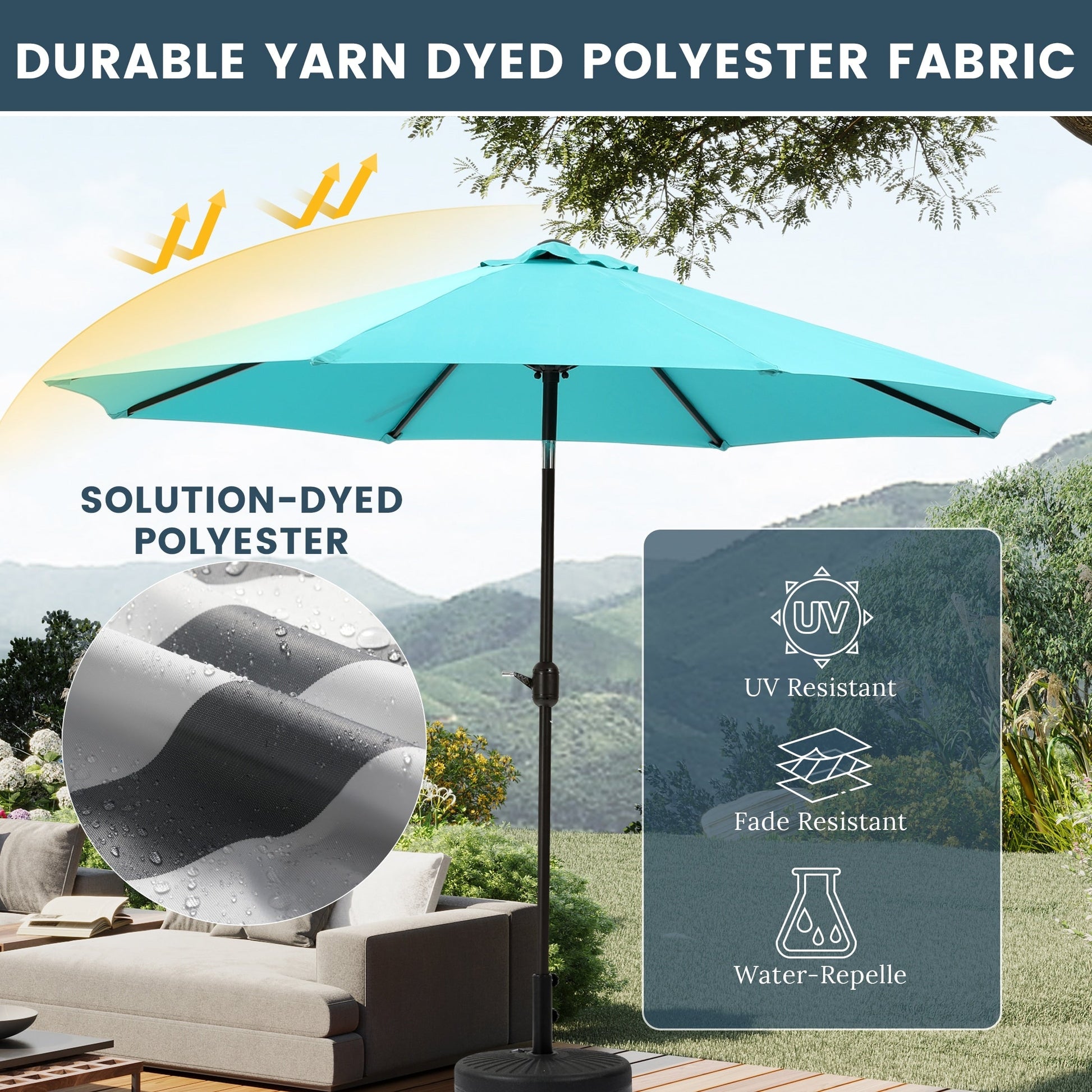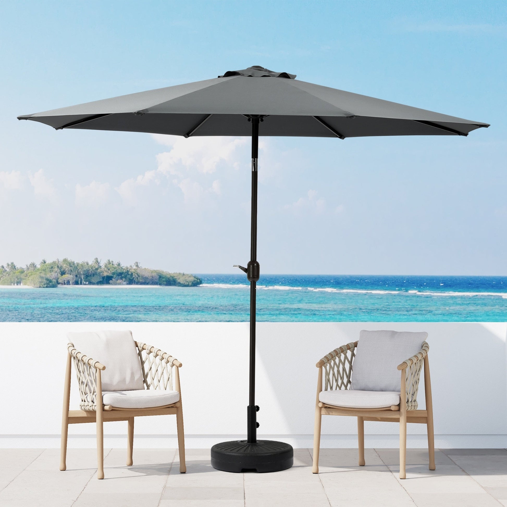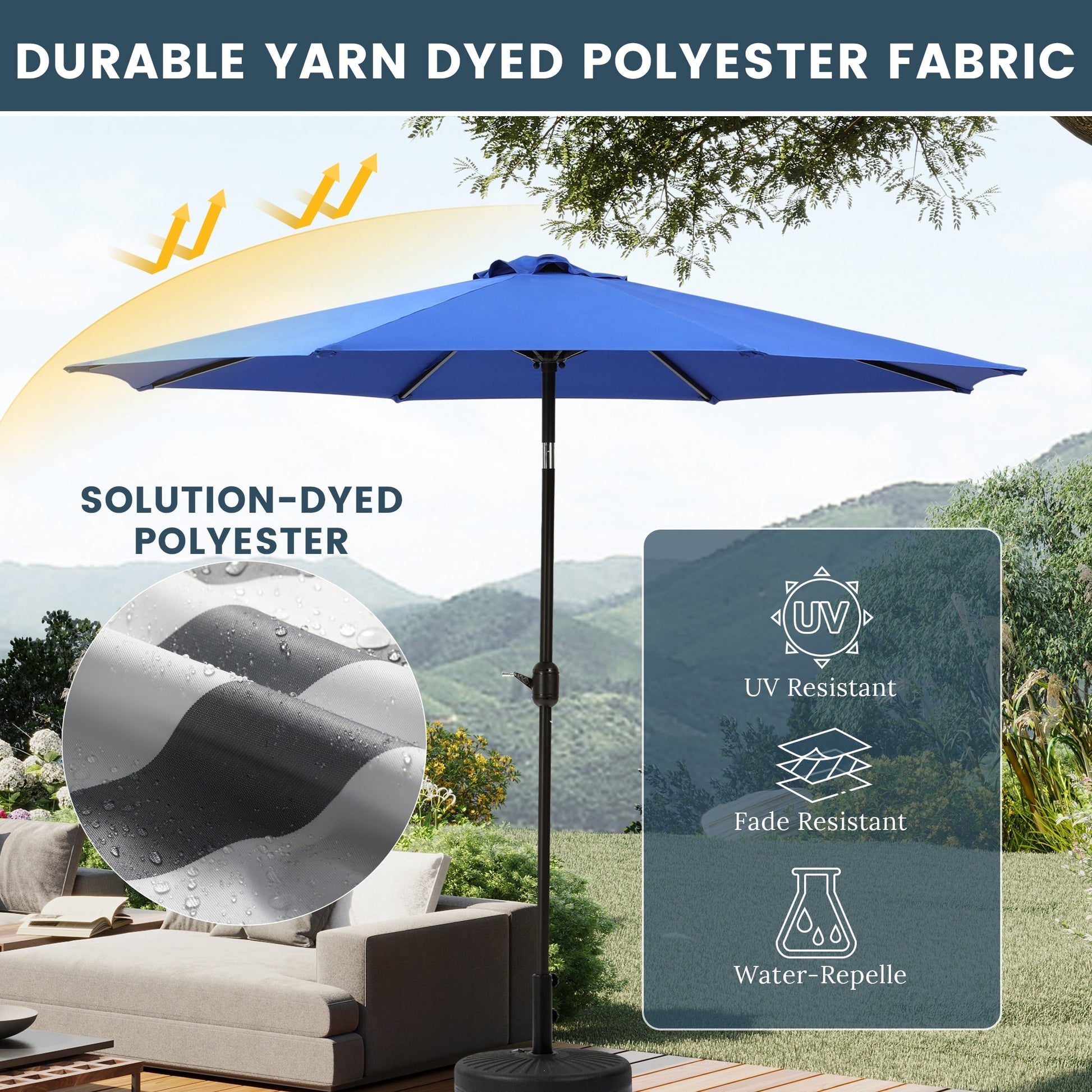 Enjoy the sunshine and scenery while keeping cool under this 9-foot steel outdoor patio table umbrella. Designed with style and durability in mind, this piece is built with a rust- and water-resistant steel frame and polyester fabric that blocks up to 95% of UV rays. The easy-to-crank lift mechanism allows for a simple open and close system when not in use. This 9-foot umbrella is perfect for your patio, garden table, outdoor dining table, pool, or lounge area. Available in multiple colors to fit your décor needs.