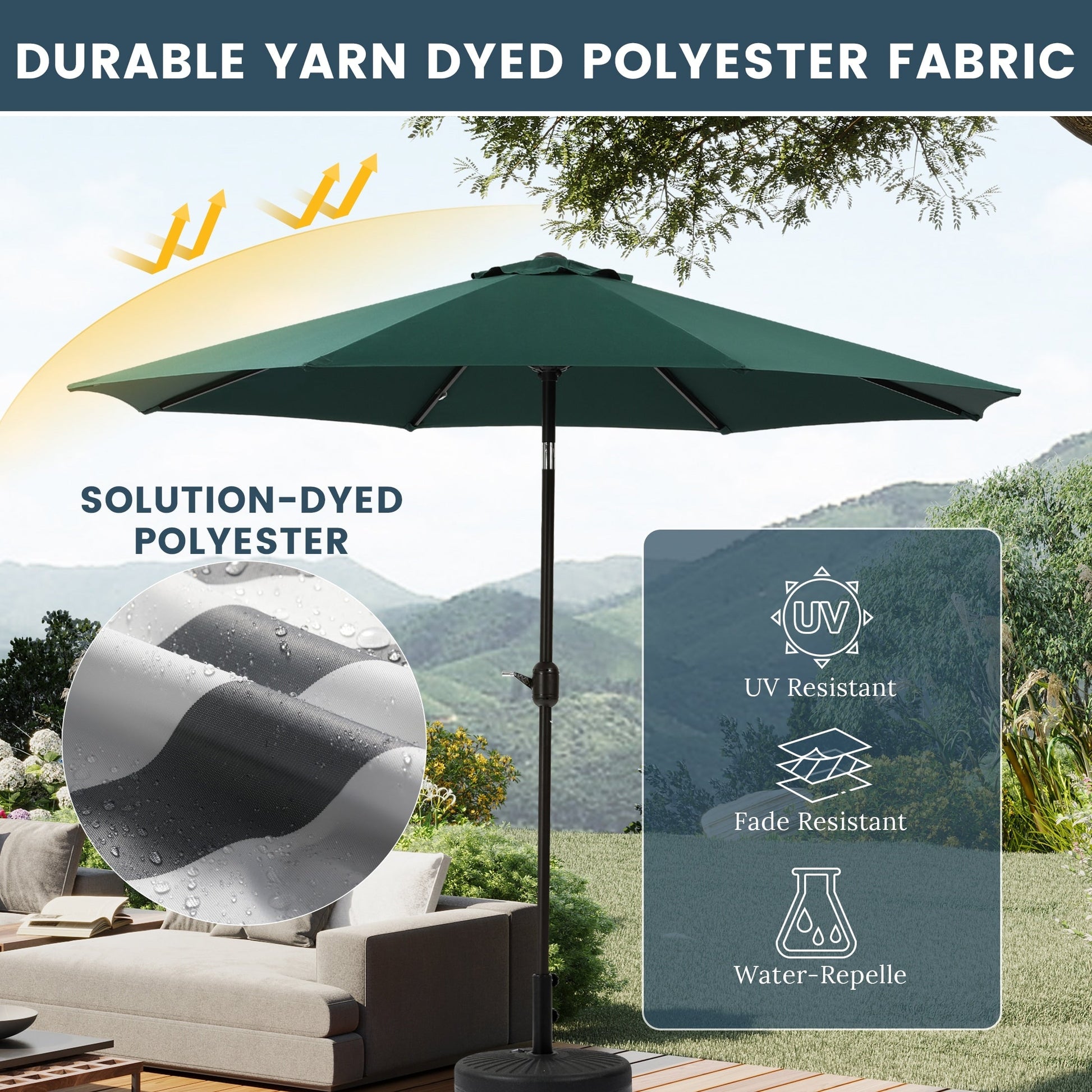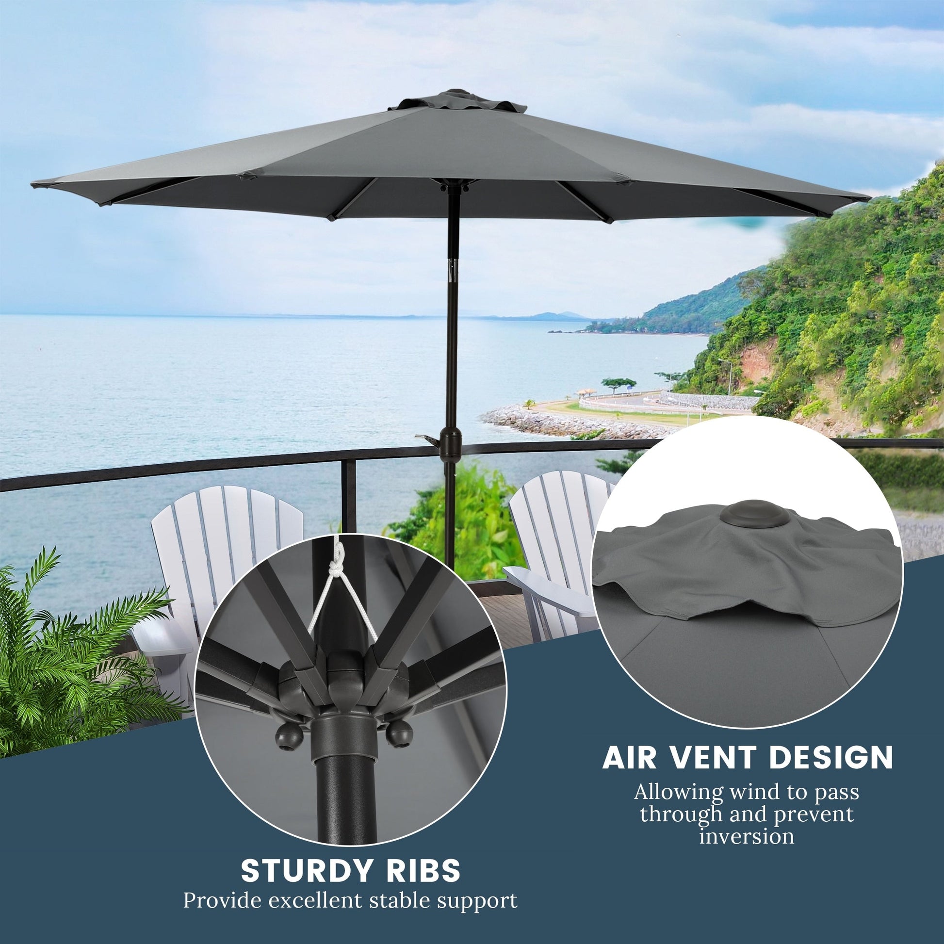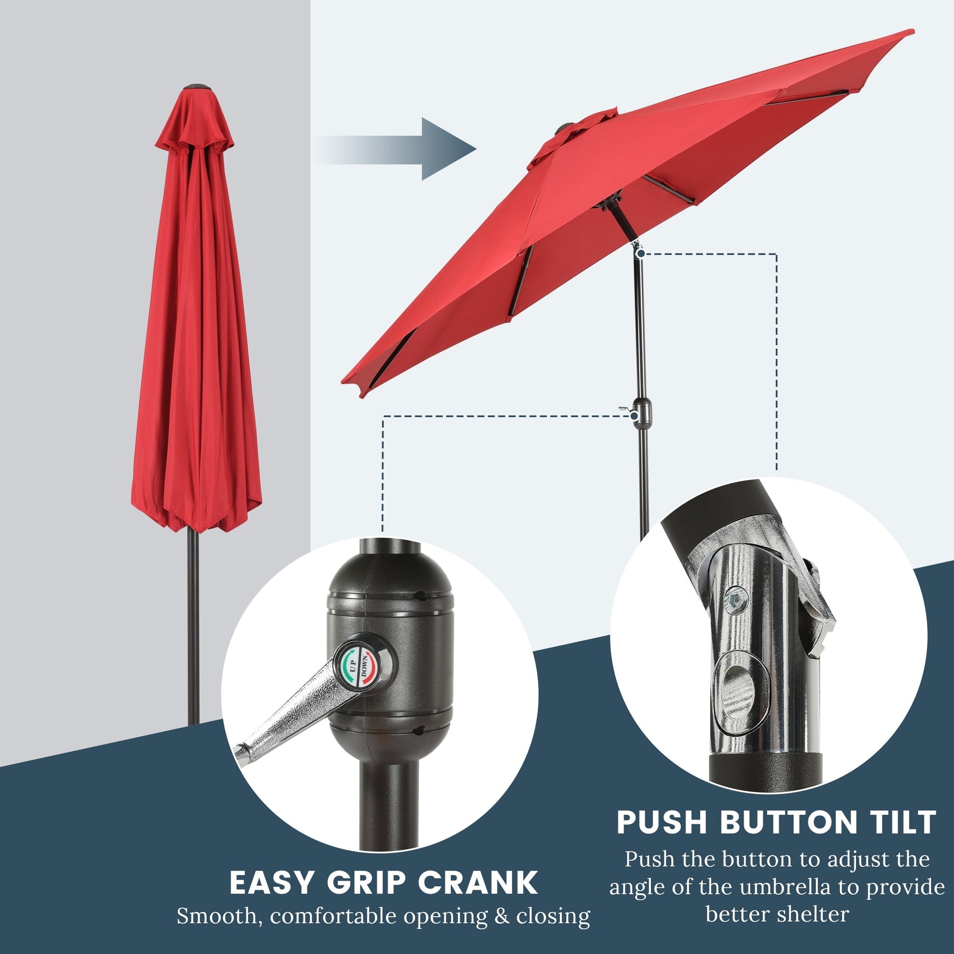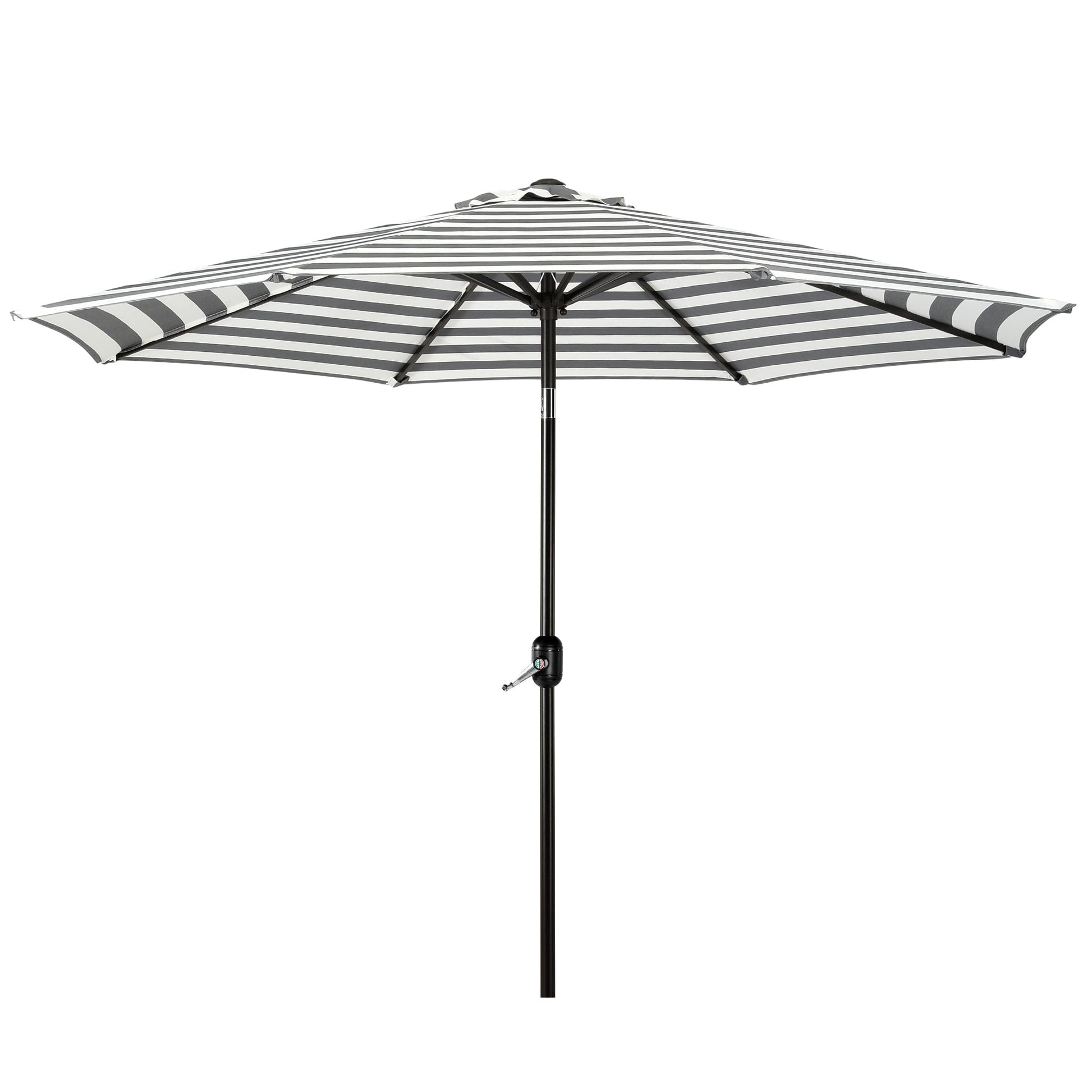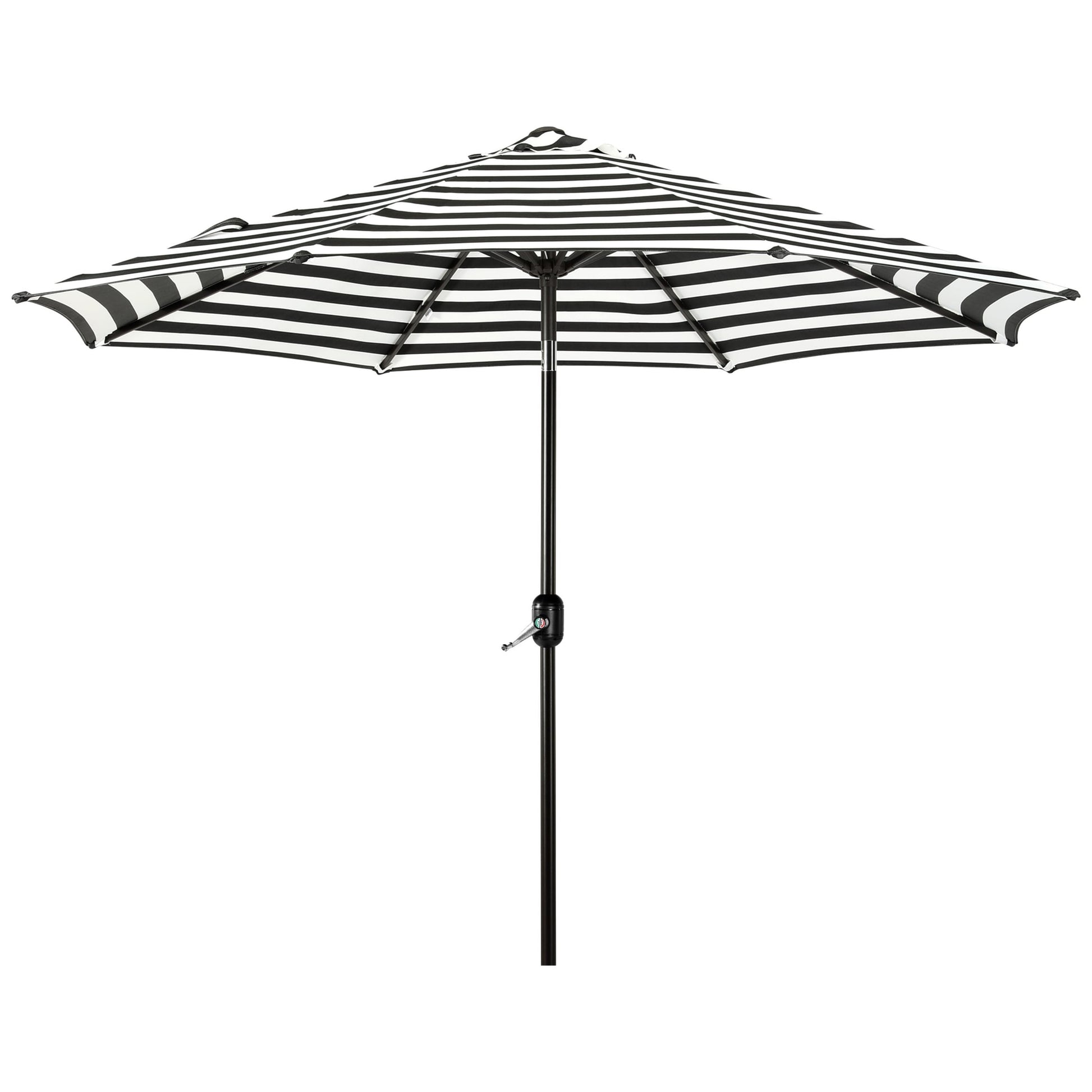 Enjoy the sunshine and scenery while keeping cool under this 9-foot steel outdoor patio table umbrella. Designed with style and durability in mind, this piece is built with a rust- and water-resistant steel frame and polyester fabric that blocks up to 95% of UV rays. The easy-to-crank lift mechanism allows for a simple open and close system when not in use. This 9-foot umbrella is perfect for your patio, garden table, outdoor dining table, pool, or lounge area. Available in multiple colors to fit your décor needs.