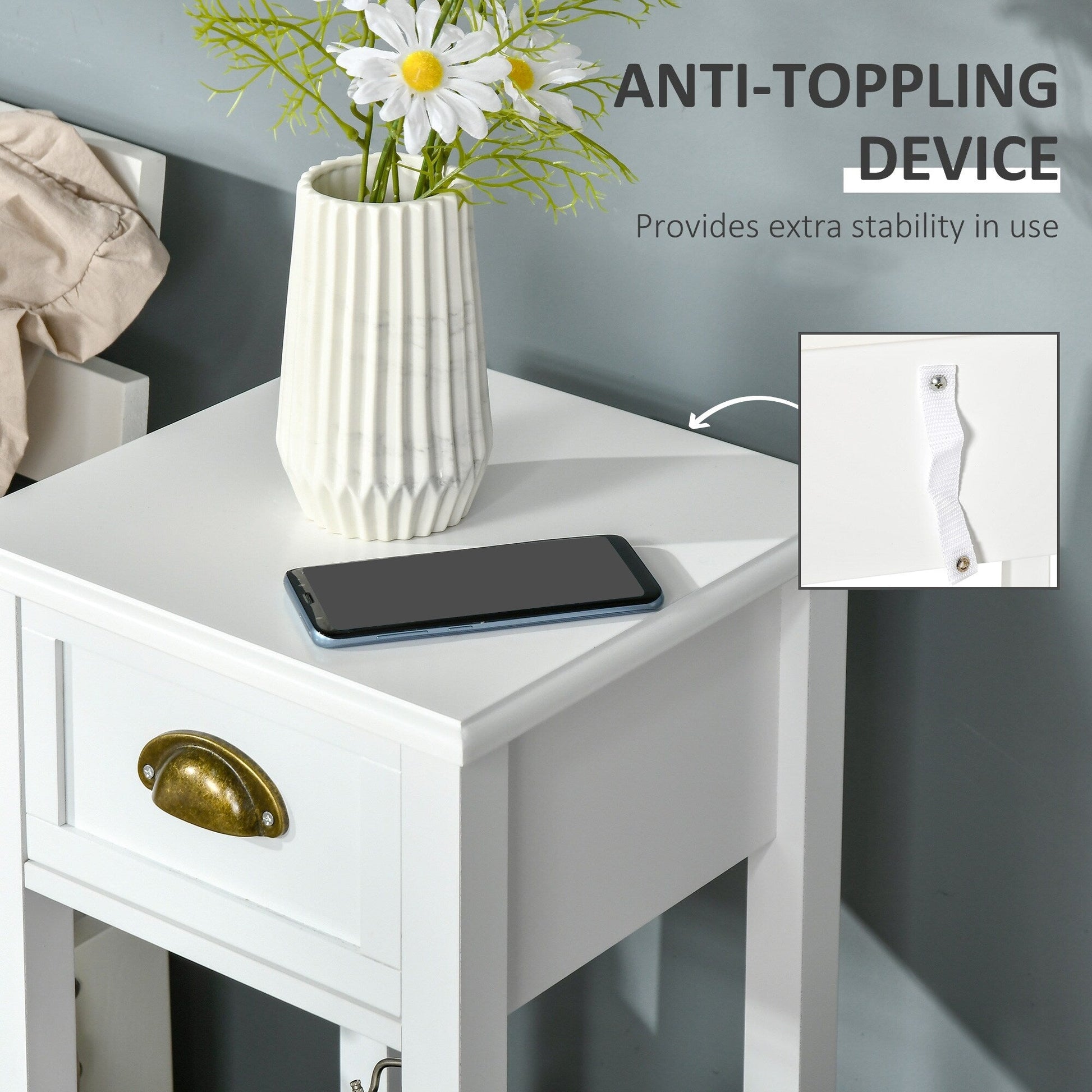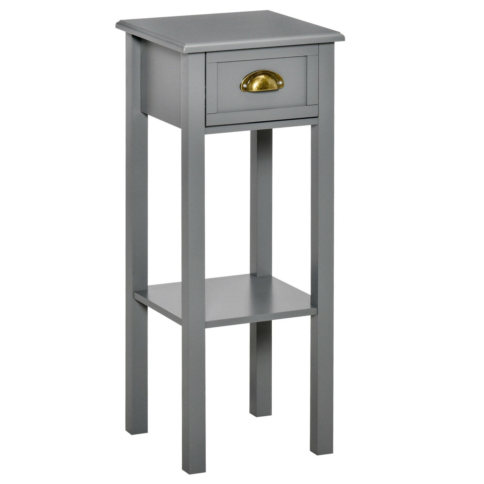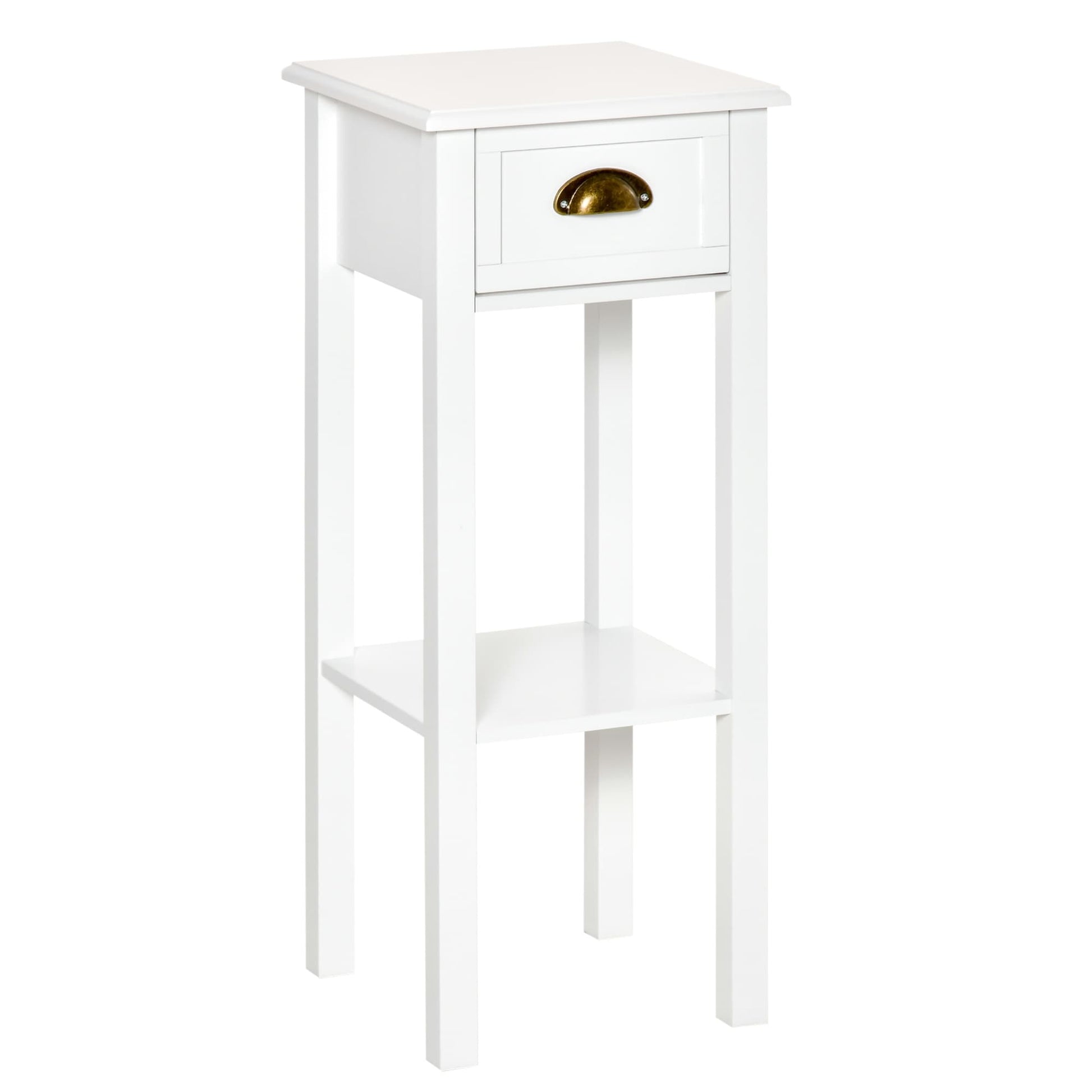Add a touch of elegance while maximizing storage space with HOMCOM's 2-Tier Night Stand with Drawer. This narrow end table is perfect for small spaces in your living room or bedroom. The open bottom shelf, drawer, and flat tabletop provide ample space to display decorative items or store everyday objects. Plus, the anti-toppling design and elevated base ensure extra stability and protection from water spills. Assembly is required.