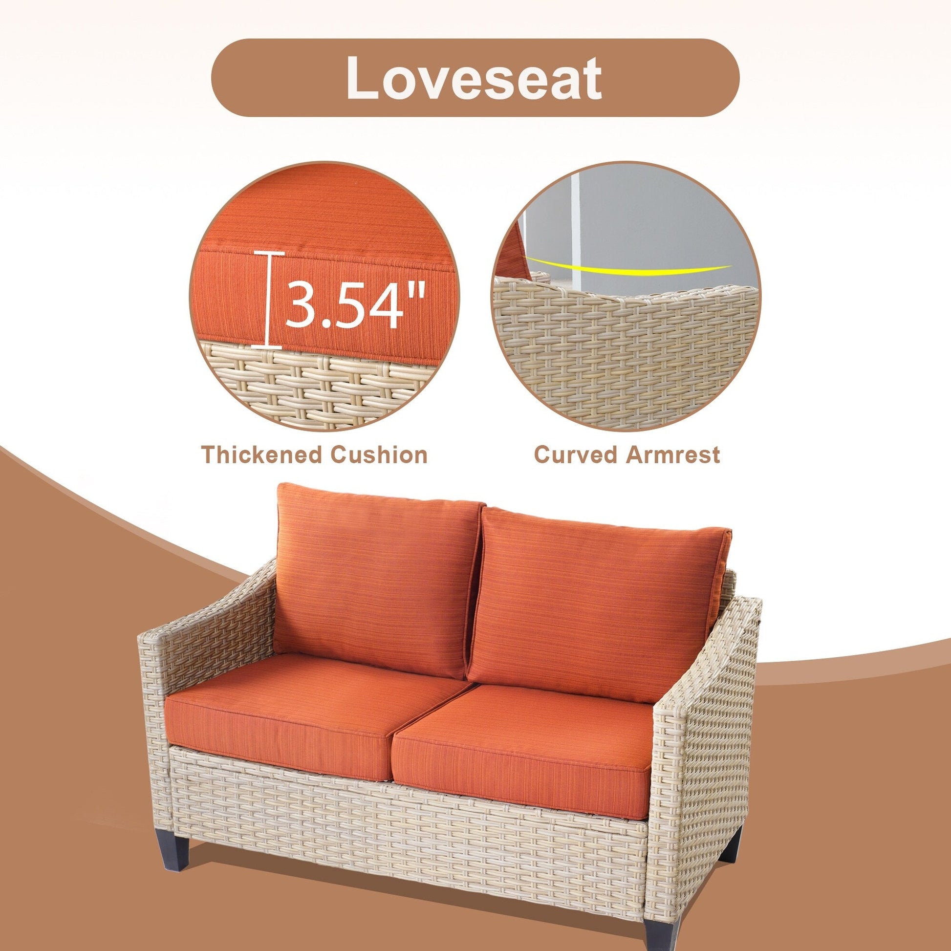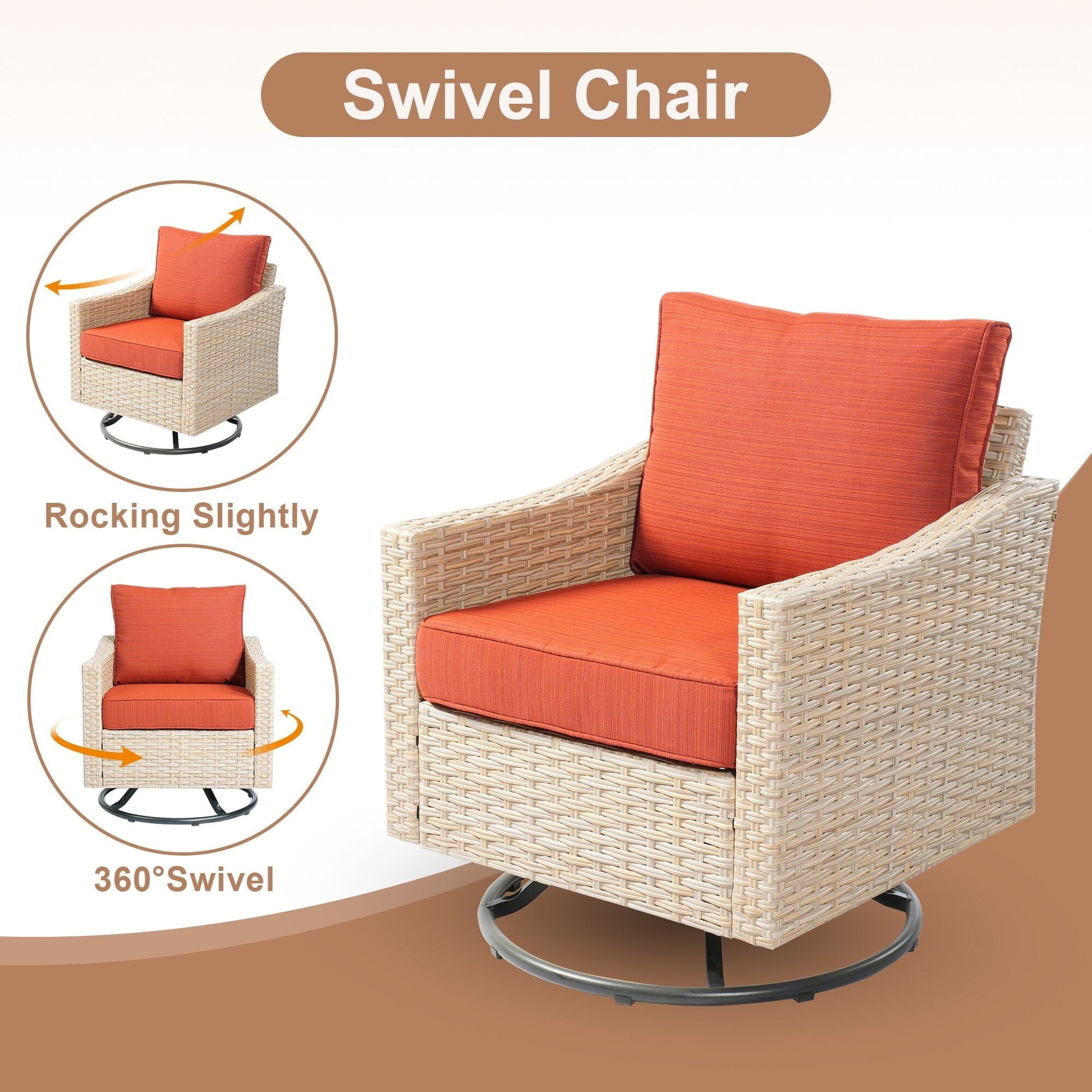 Gather your friends or guests merrily out of doors with HOOOWOOO 6-piece Wicker Patio Outdoor Furniture Fire Pit Set. Made of weather resistant PE rattan and thick cushions, this patio furniture set achieves the perfect combination of pleasant ambience and decorative functionality. Not only designed of curved backrest and deep seat for providing spacious sitting space that gives strong support and cozy comfort, but also the high density cushions make perform well in UV protection, water-resistance and high toughness. The 360-degree swivel chair comes with durable steel base, allowing effortless rotation in all directions and gentle rocking back and forth. With maximum heat output of 50,000 BTU, the luxury fire pit table features steel construction and a limitation wood tabletop design, perfectly providing the atmosphere of a campfire in the comfort of your own outdoor space.?