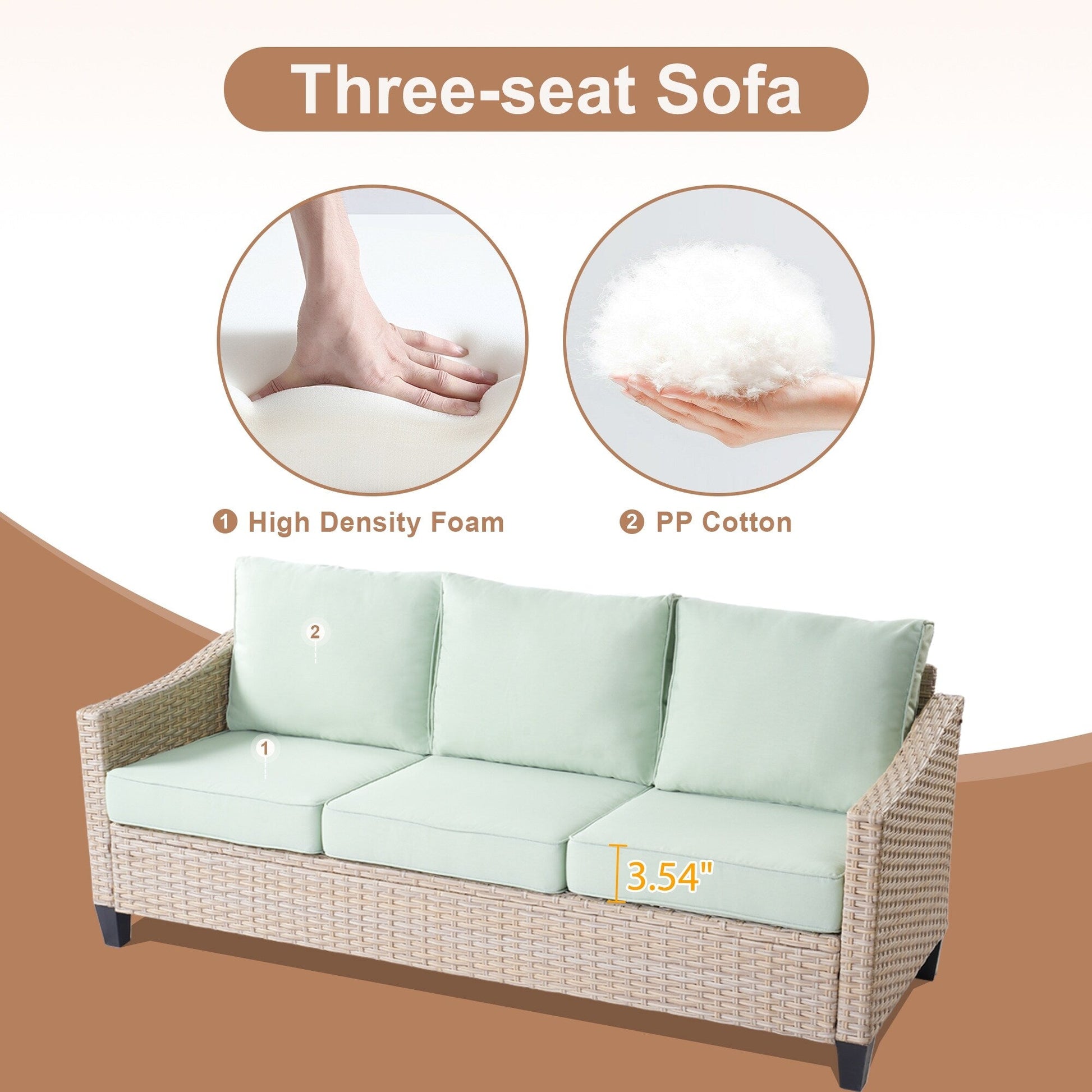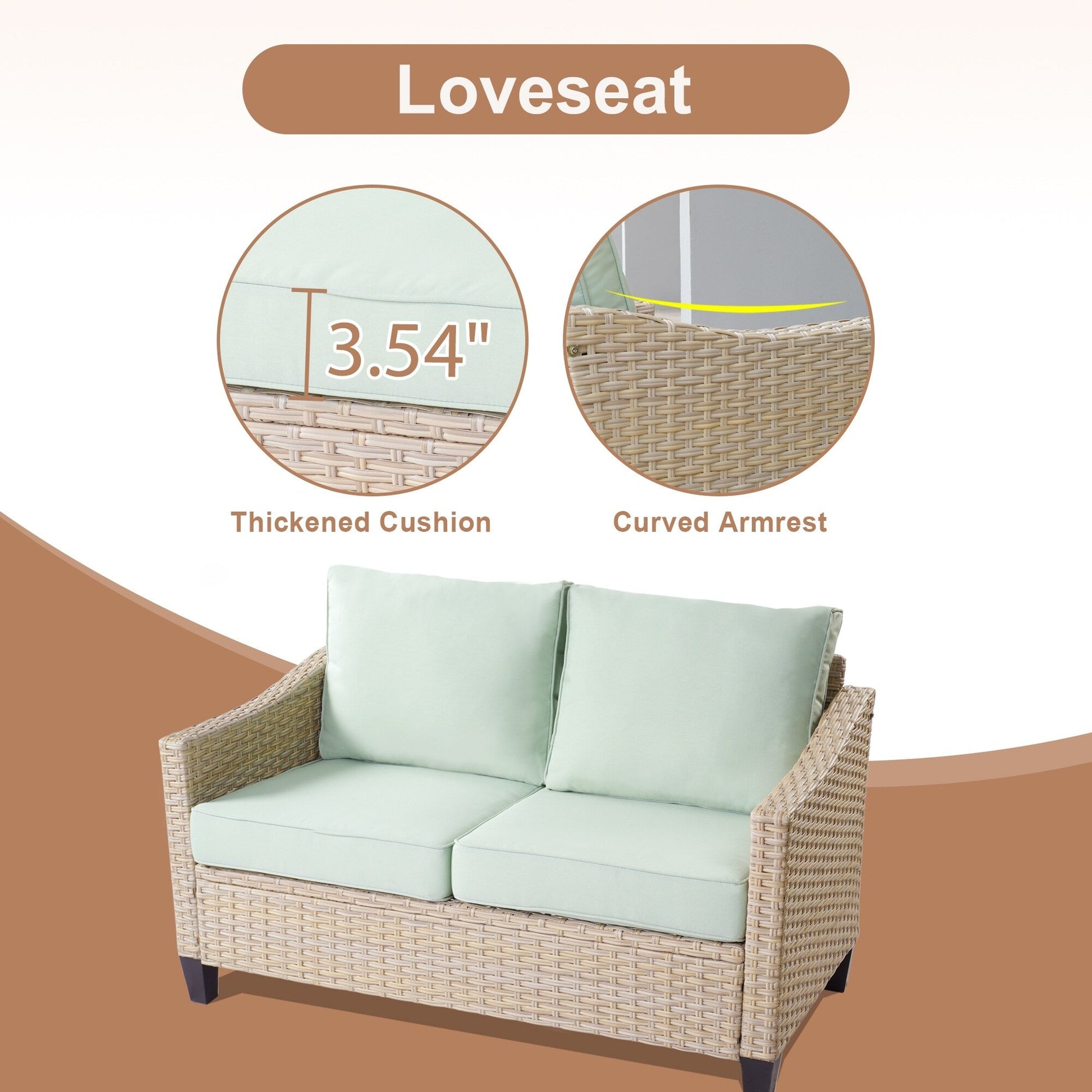- Includes 1 three-seat sofa, 1 loveseat sofa, 2 swivel chairs, 1 side table and 1 fire pit