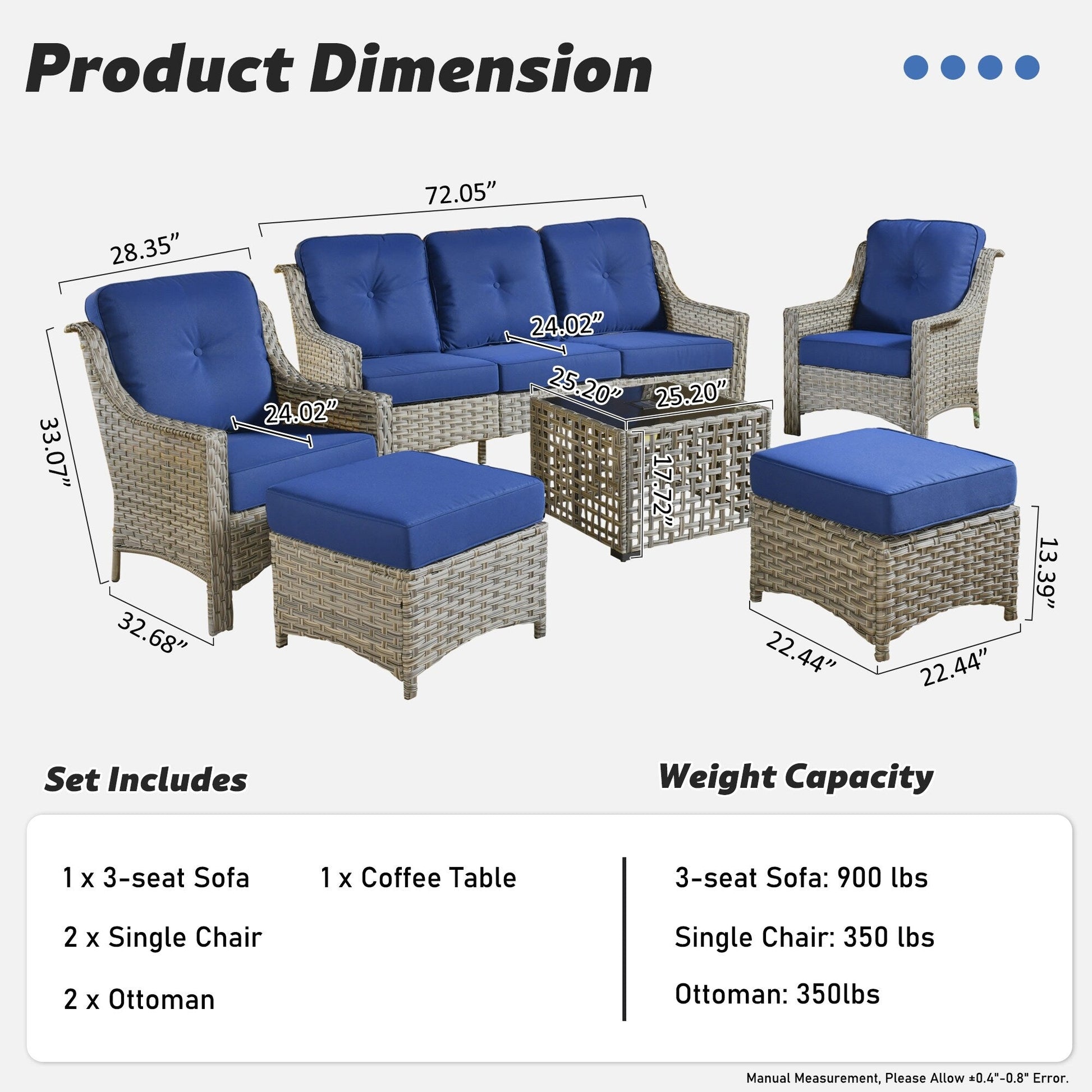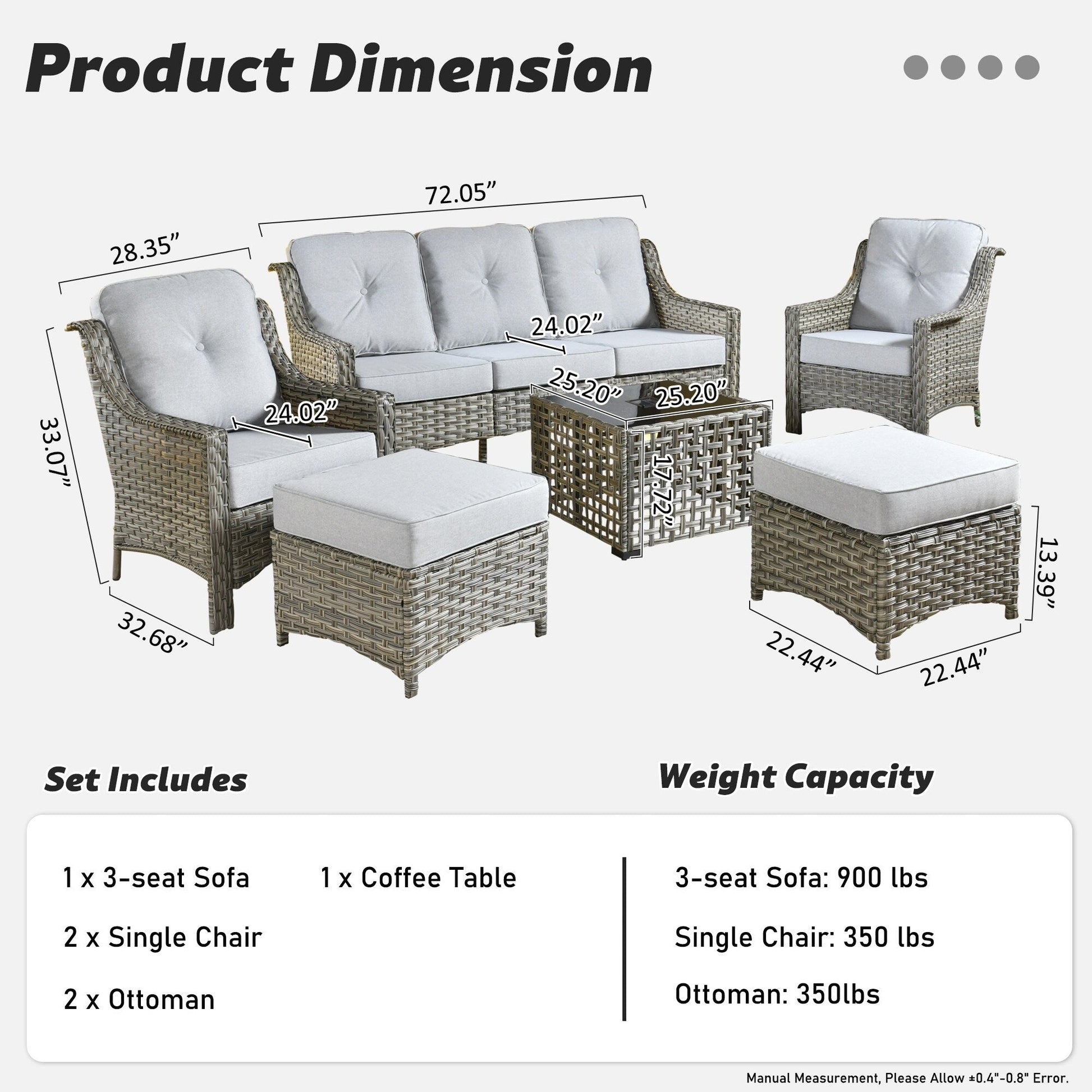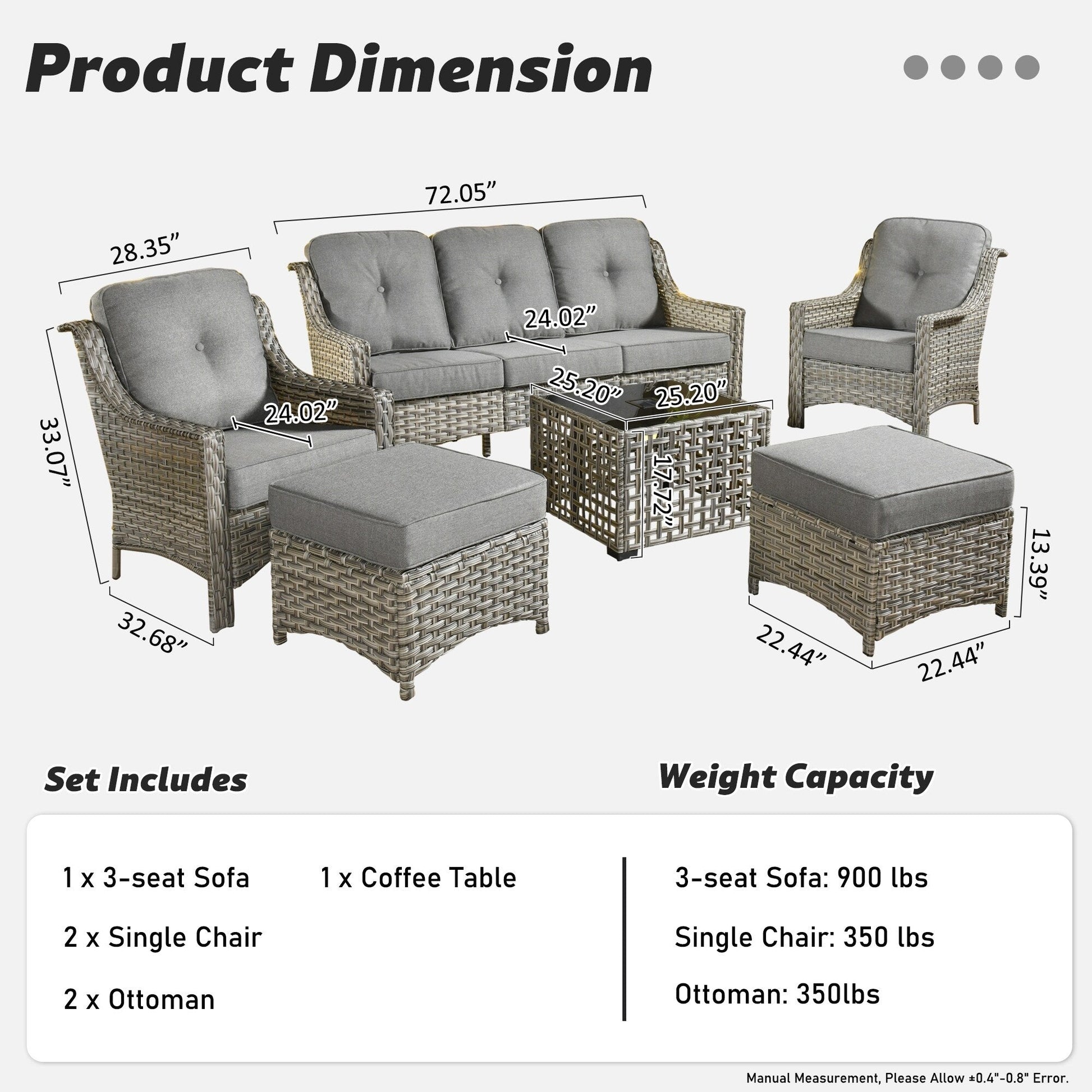Make your outdoor oasis in luxurious comfort with HOOOWOOO 6-pieces Wicker Patio Furniture Set. This set suitably sets up to 5 people, featuring all hand-woven wicker with strong third dimension provides this outdoor furniture set a longer service life, making it perform well in UV protection and weather resistance. The button-tufted cushions with good resilience, protecting the lumbar and offering a comfortable sitting experience, while the multi-functional coffee table with solar LED light, not only easy clean for convenience, but also be a perfect ornament to create a romantic, relaxed and cheerful atmosphere. This patio furniture set can be applied to porch, backyard, balcony, poolside.
