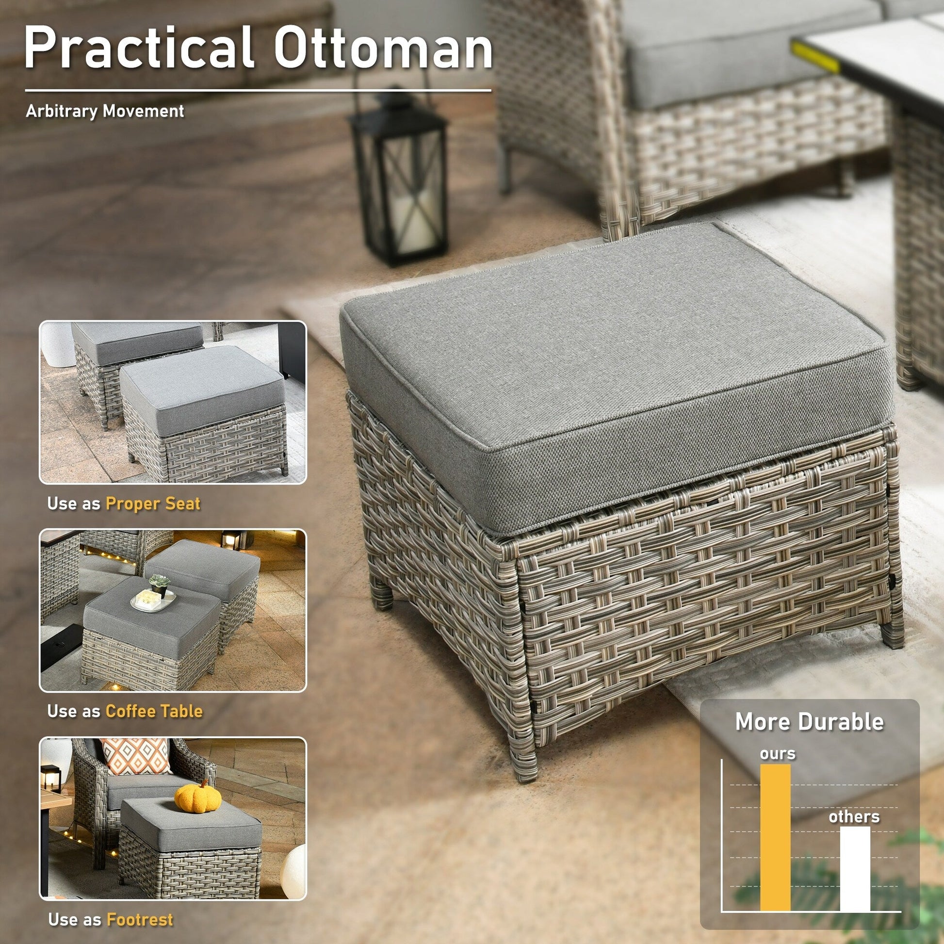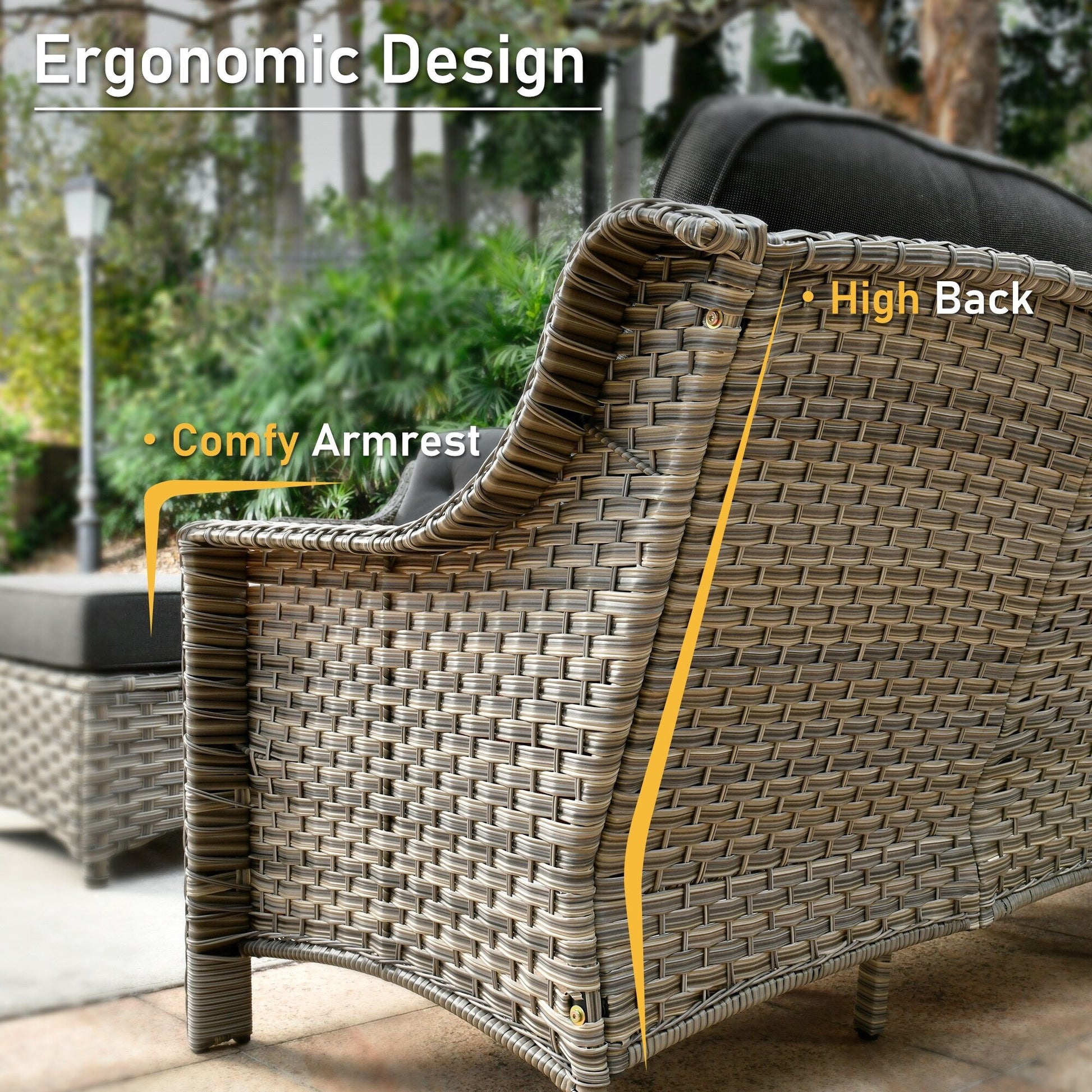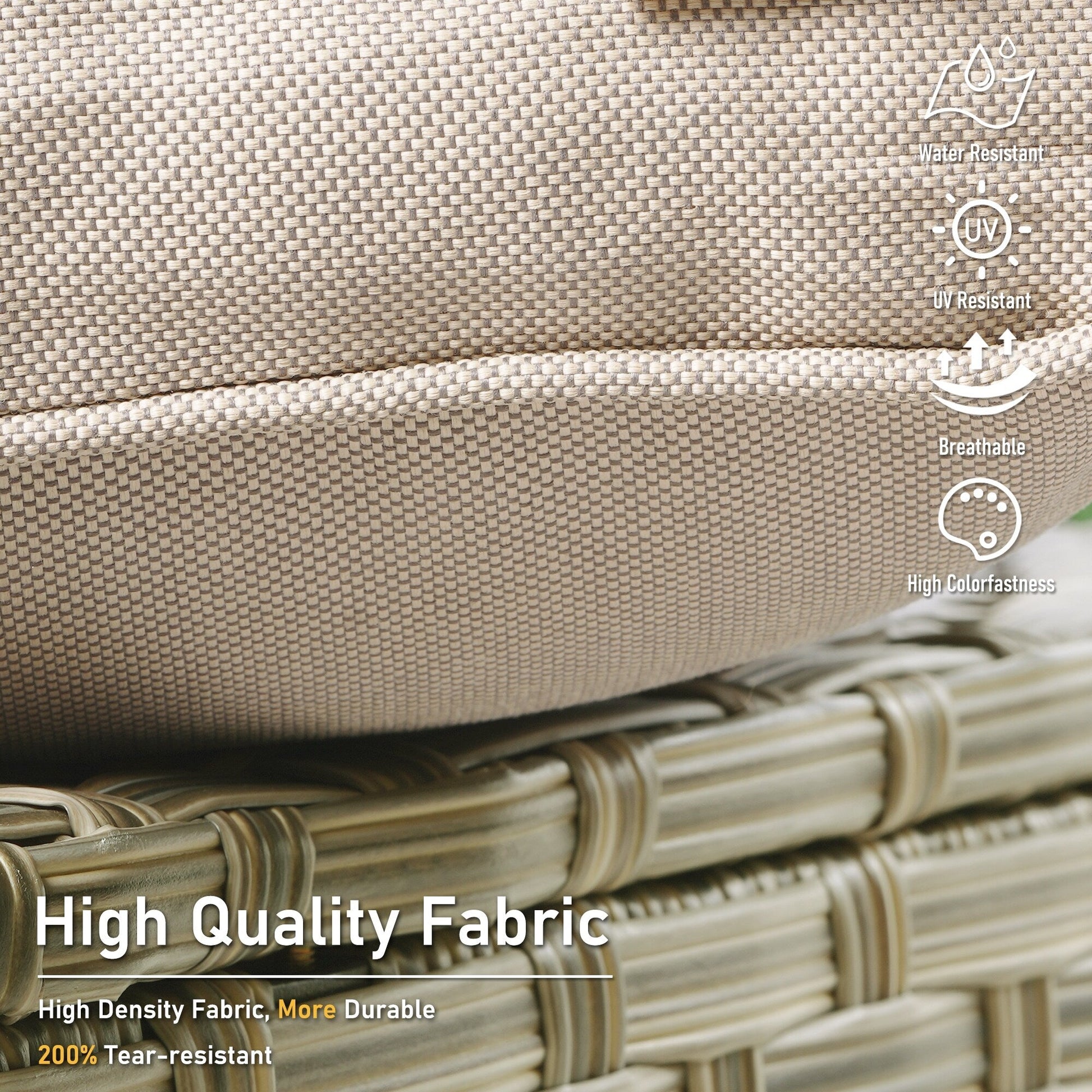 Make your outdoor oasis in luxurious comfort with HOOOWOOO 6-pieces Wicker Patio Furniture Set. This set suitably sets up to 5 people, featuring all hand-woven wicker with strong third dimension provides this outdoor furniture set a longer service life, making it perform well in UV protection and weather resistance. The button-tufted cushions with good resilience, protecting the lumbar and offering a comfortable sitting experience, while the multi-functional coffee table with solar LED light, not only easy clean for convenience, but also be a perfect ornament to create a romantic, relaxed and cheerful atmosphere. This patio furniture set can be applied to porch, backyard, balcony, poolside.