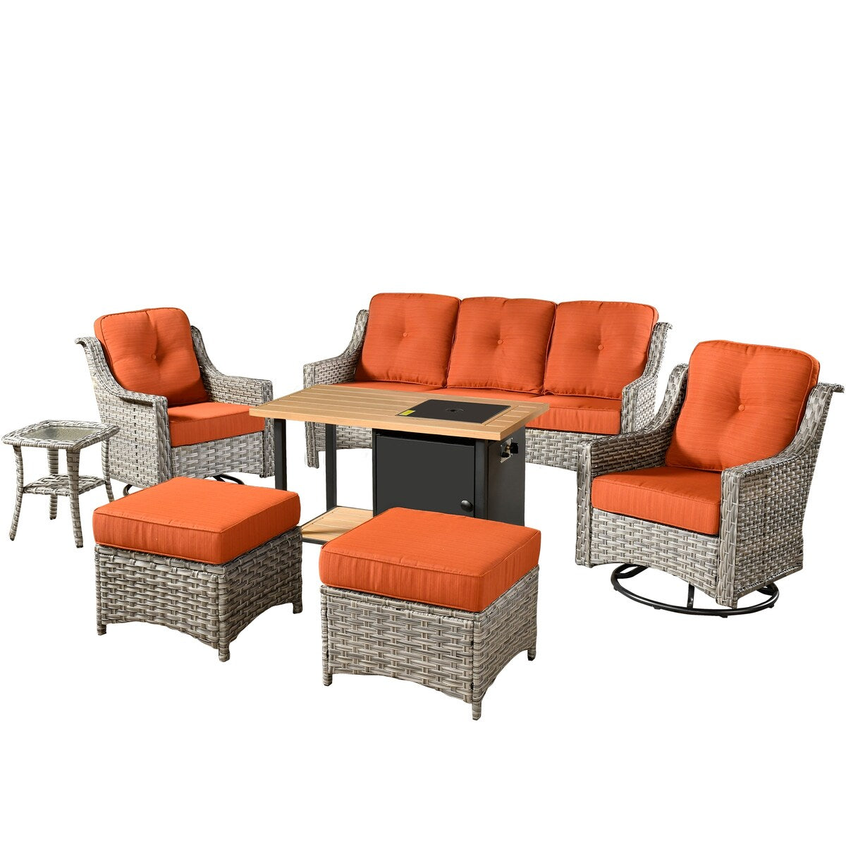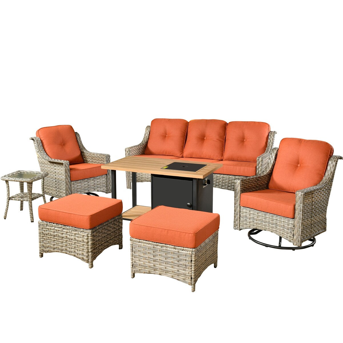 HOOOWOOO 7-piece Wicker High Back Patio Furniture Swivel Rocker Set with Fire Pit