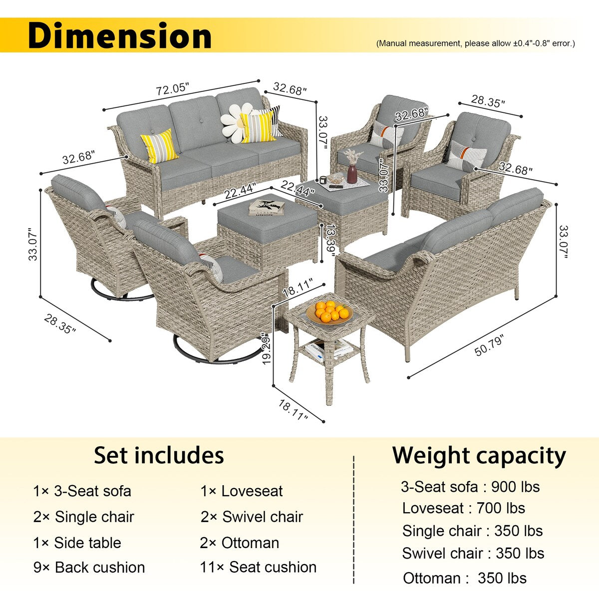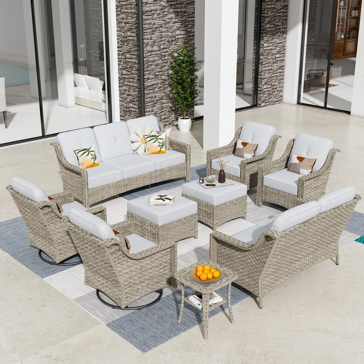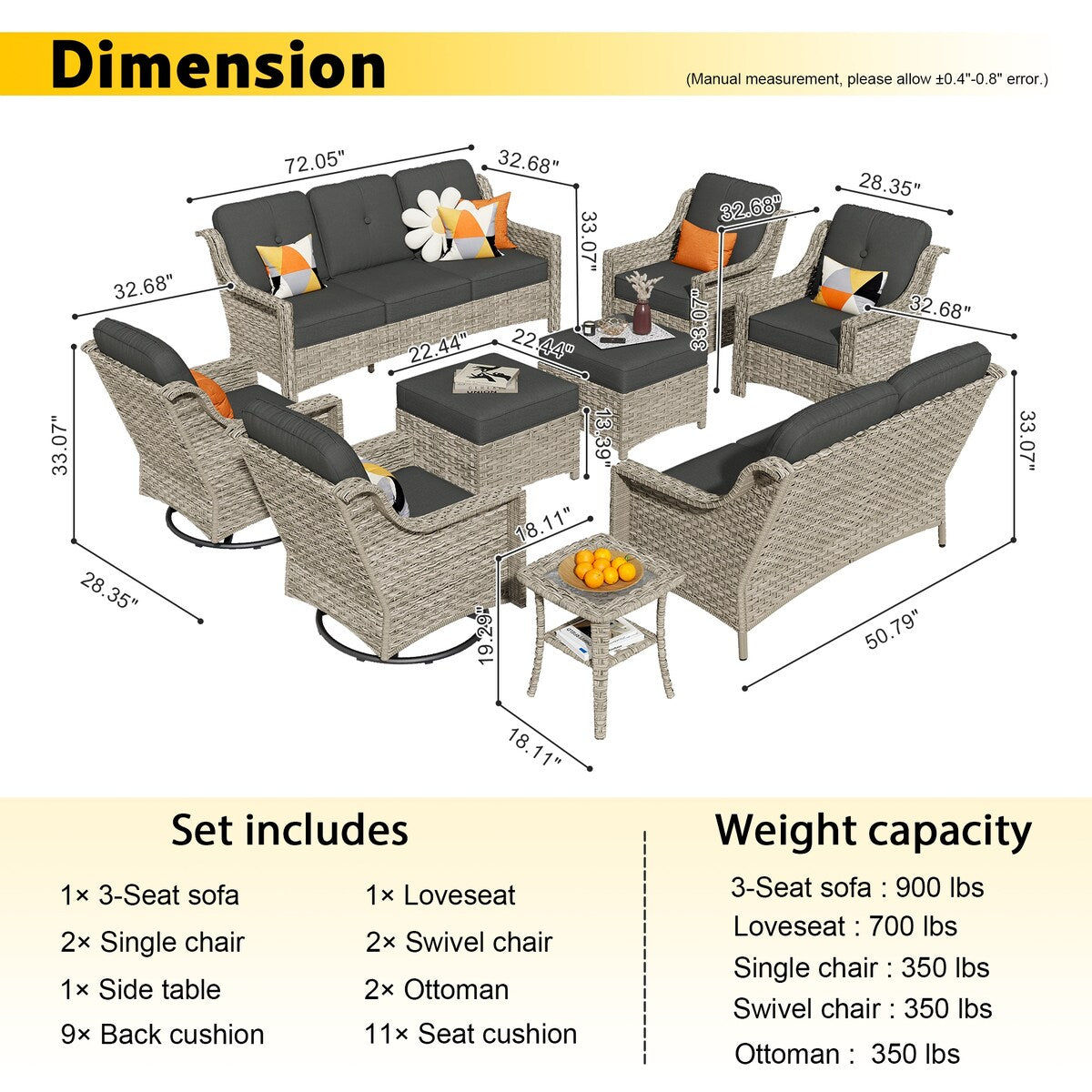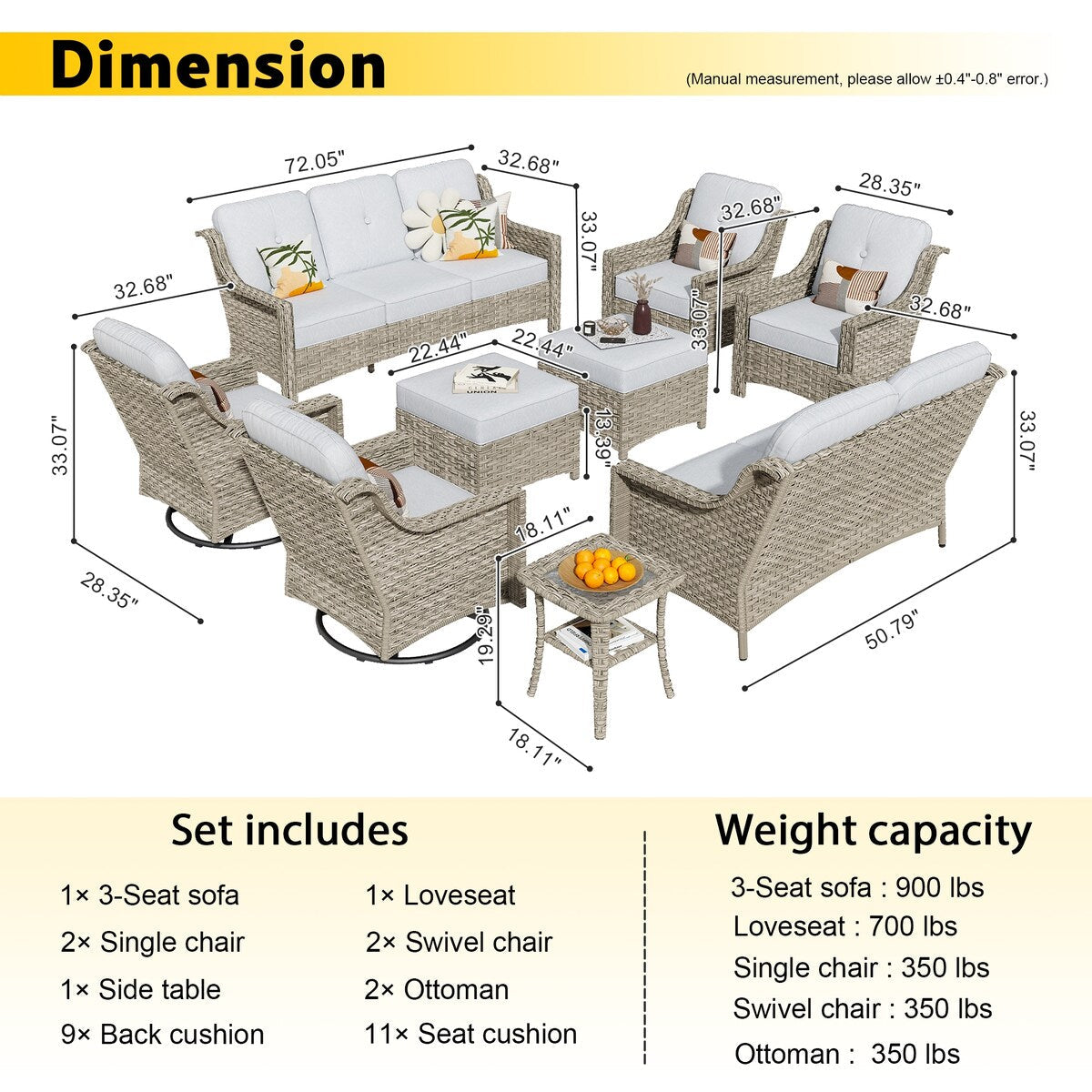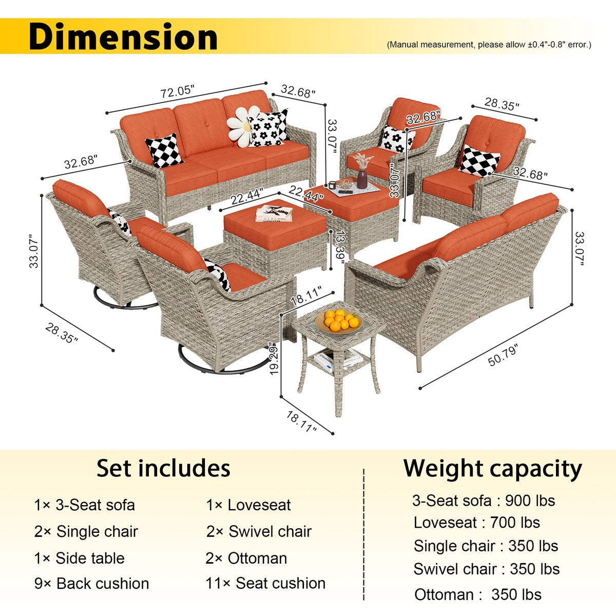 Create the ideal outdoor space for leisure conversations or bubbly awaits in the evening with HOOOWOOO 9-piece Wicker High Back Patio Outdoor Swivel Chair Set . Includes 1 three-seat sofa, 1 loveseat sofa, 2 single chairs, 2 ottomans, 2 swivel chairs and 1 side table, this set provides durability and practicability with construction of handwoven PE wicker and powder-coated steel frame. Featuring high backrest and deep seating design, this sofa set provides you with more comfortable support. The thicken button-tufted cushions with different color options offer good resilience and protect your lumbar, giving relaxing sitting experience. While the 360 degree swivel chair comes with durable steel base, allowing effortless rotation in all directions and gentle rocking back and forth. Also the practical ottoman can be used as seat, table and footrest. No matter from the color matching or unique design, does not lose the taste of the style and combines with practicability and artistry.?