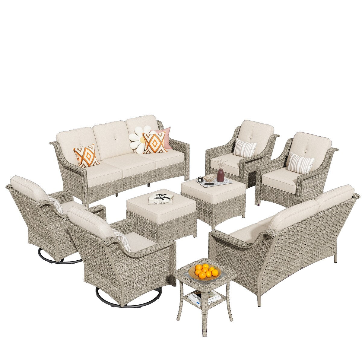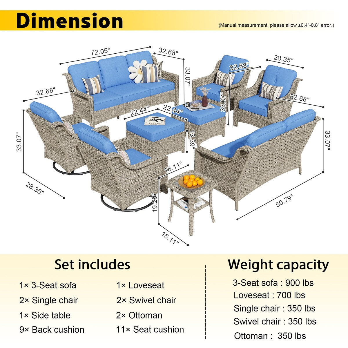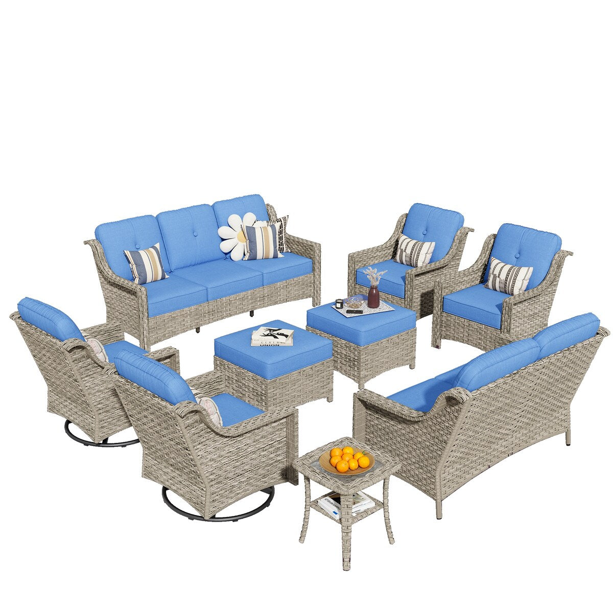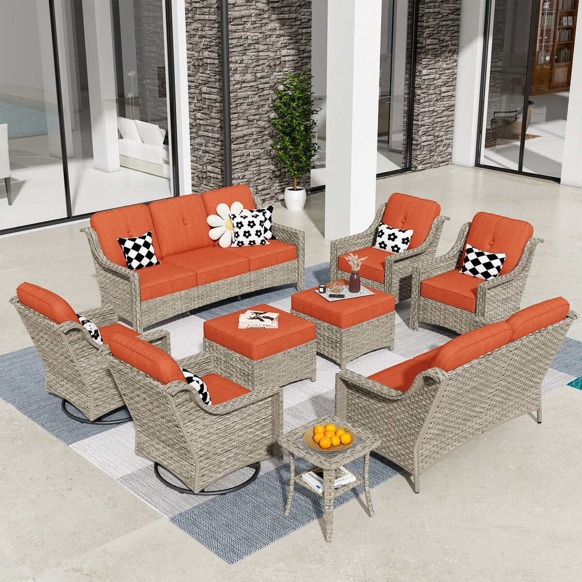 Create the ideal outdoor space for leisure conversations or bubbly awaits in the evening with HOOOWOOO 9-piece Wicker High Back Patio Outdoor Swivel Chair Set . Includes 1 three-seat sofa, 1 loveseat sofa, 2 single chairs, 2 ottomans, 2 swivel chairs and 1 side table, this set provides durability and practicability with construction of handwoven PE wicker and powder-coated steel frame. Featuring high backrest and deep seating design, this sofa set provides you with more comfortable support. The thicken button-tufted cushions with different color options offer good resilience and protect your lumbar, giving relaxing sitting experience. While the 360 degree swivel chair comes with durable steel base, allowing effortless rotation in all directions and gentle rocking back and forth. Also the practical ottoman can be used as seat, table and footrest. No matter from the color matching or unique design, does not lose the taste of the style and combines with practicability and artistry.?