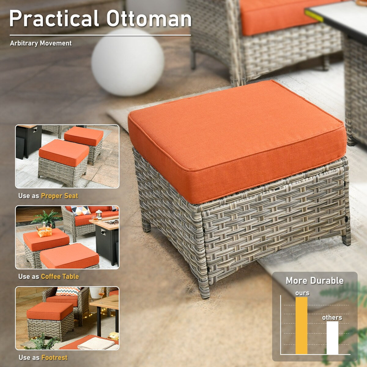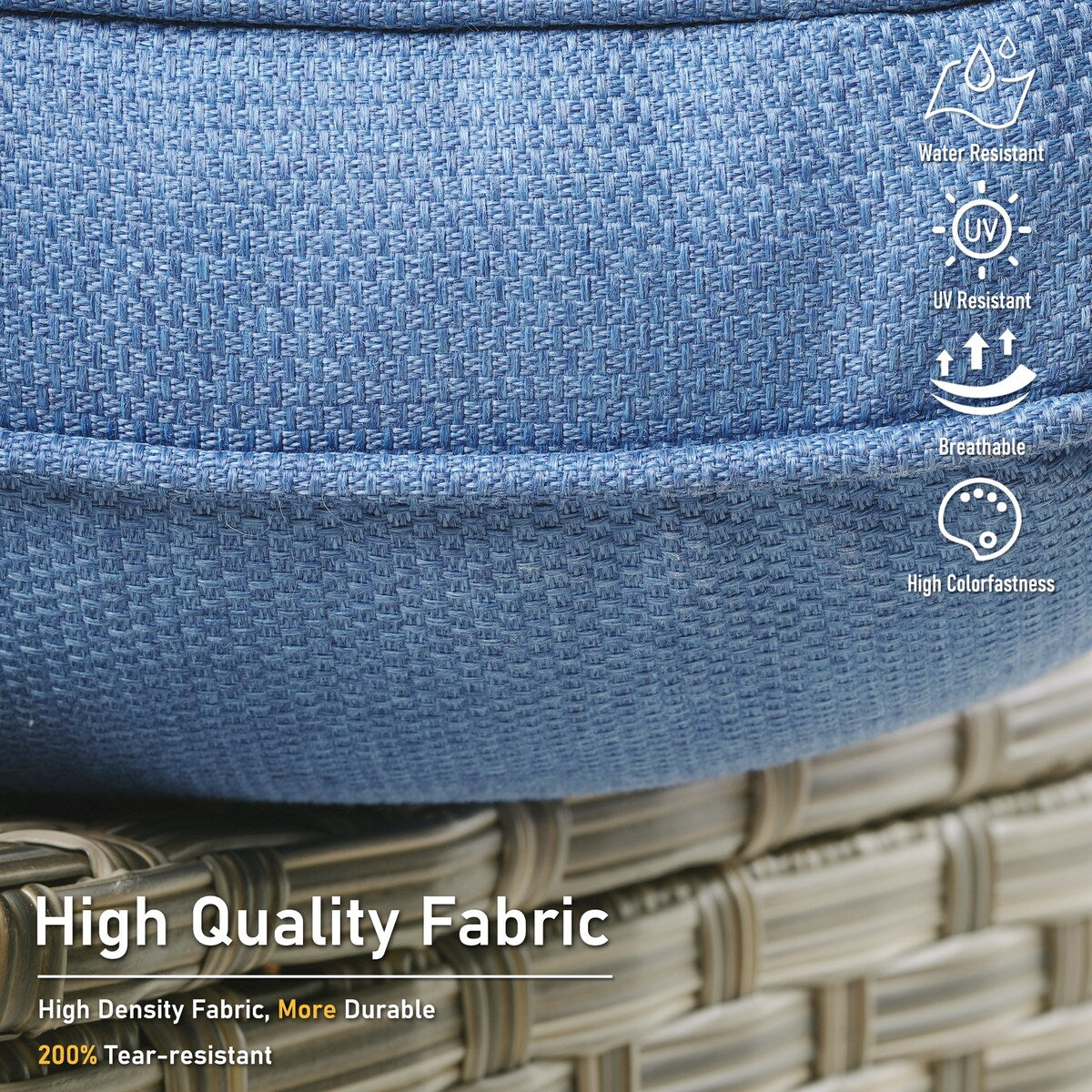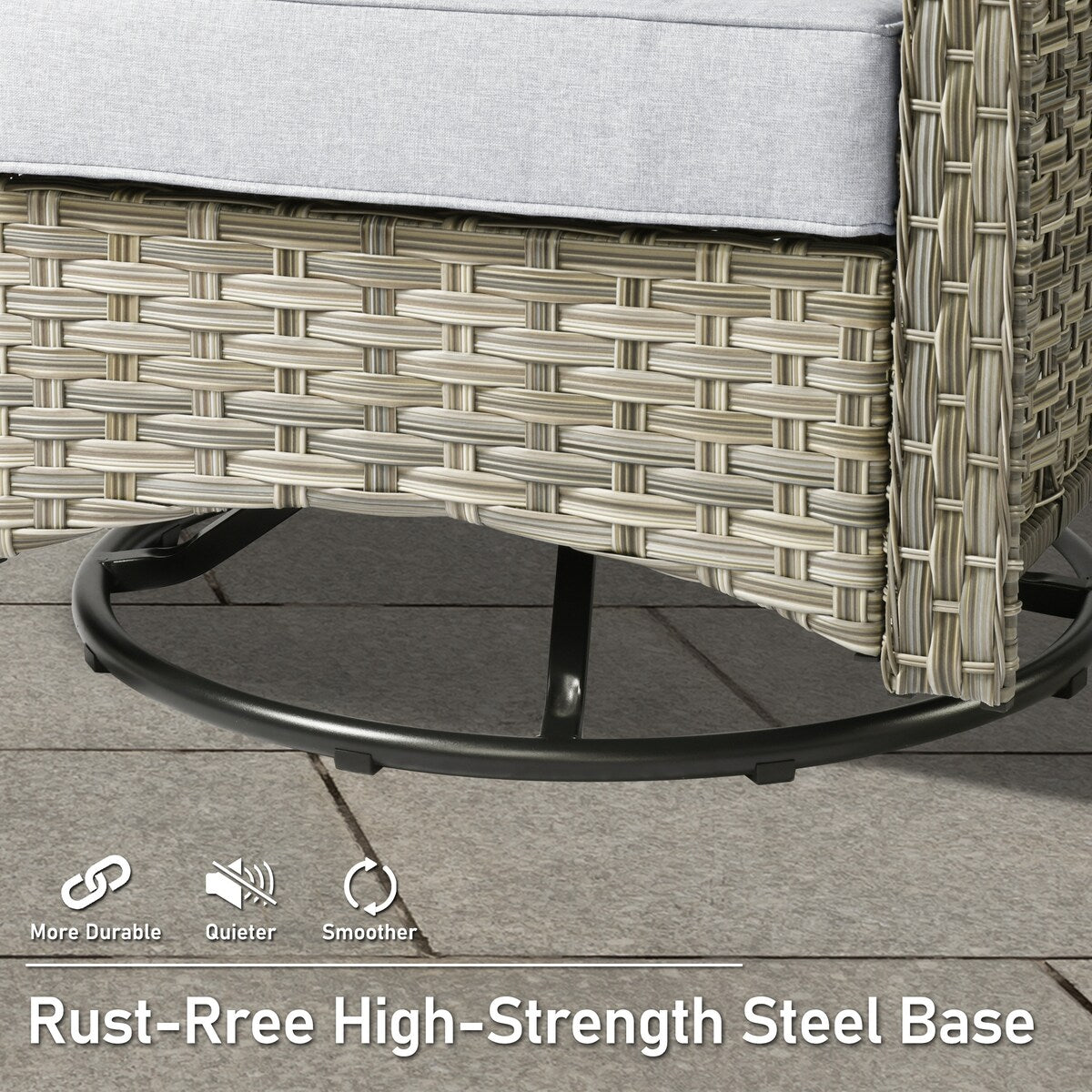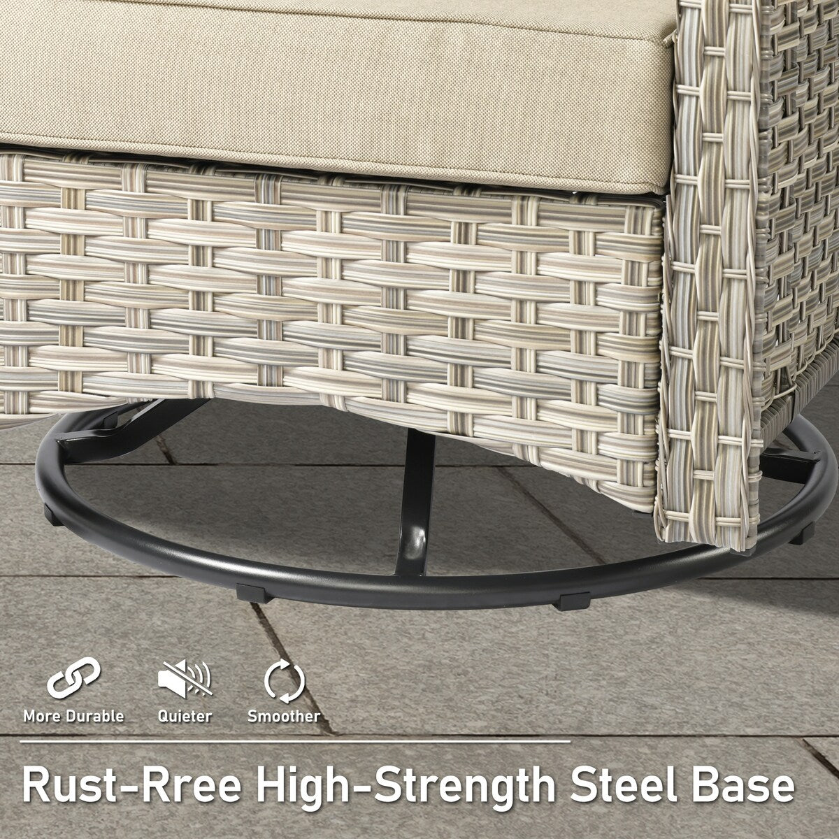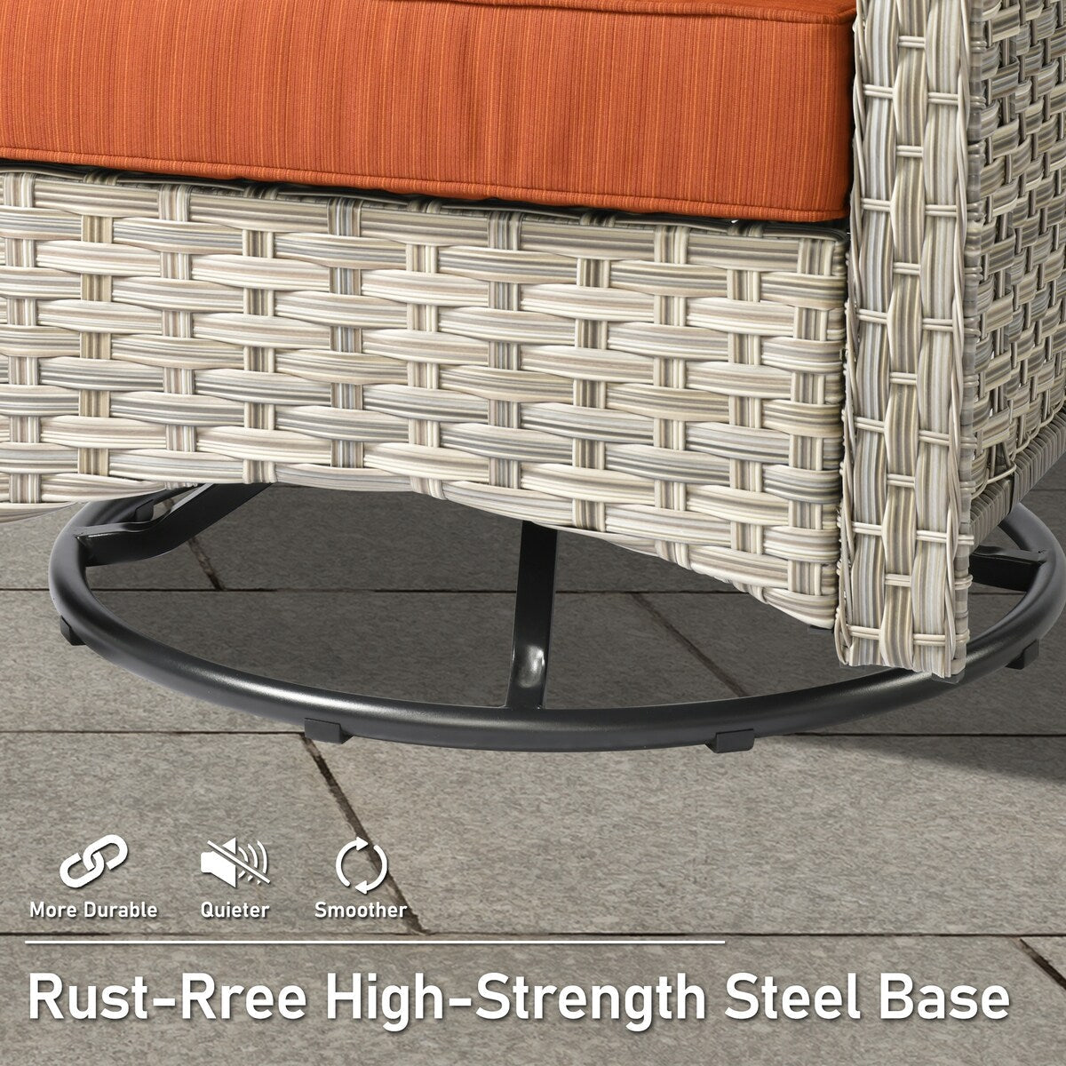 Create the ideal outdoor space for leisure conversations or bubbly awaits in the evening with HOOOWOOO 9-piece Wicker High Back Patio Outdoor Swivel Chair Set . Includes 1 three-seat sofa, 1 loveseat sofa, 2 single chairs, 2 ottomans, 2 swivel chairs and 1 side table, this set provides durability and practicability with construction of handwoven PE wicker and powder-coated steel frame. Featuring high backrest and deep seating design, this sofa set provides you with more comfortable support. The thicken button-tufted cushions with different color options offer good resilience and protect your lumbar, giving relaxing sitting experience. While the 360 degree swivel chair comes with durable steel base, allowing effortless rotation in all directions and gentle rocking back and forth. Also the practical ottoman can be used as seat, table and footrest. No matter from the color matching or unique design, does not lose the taste of the style and combines with practicability and artistry.?