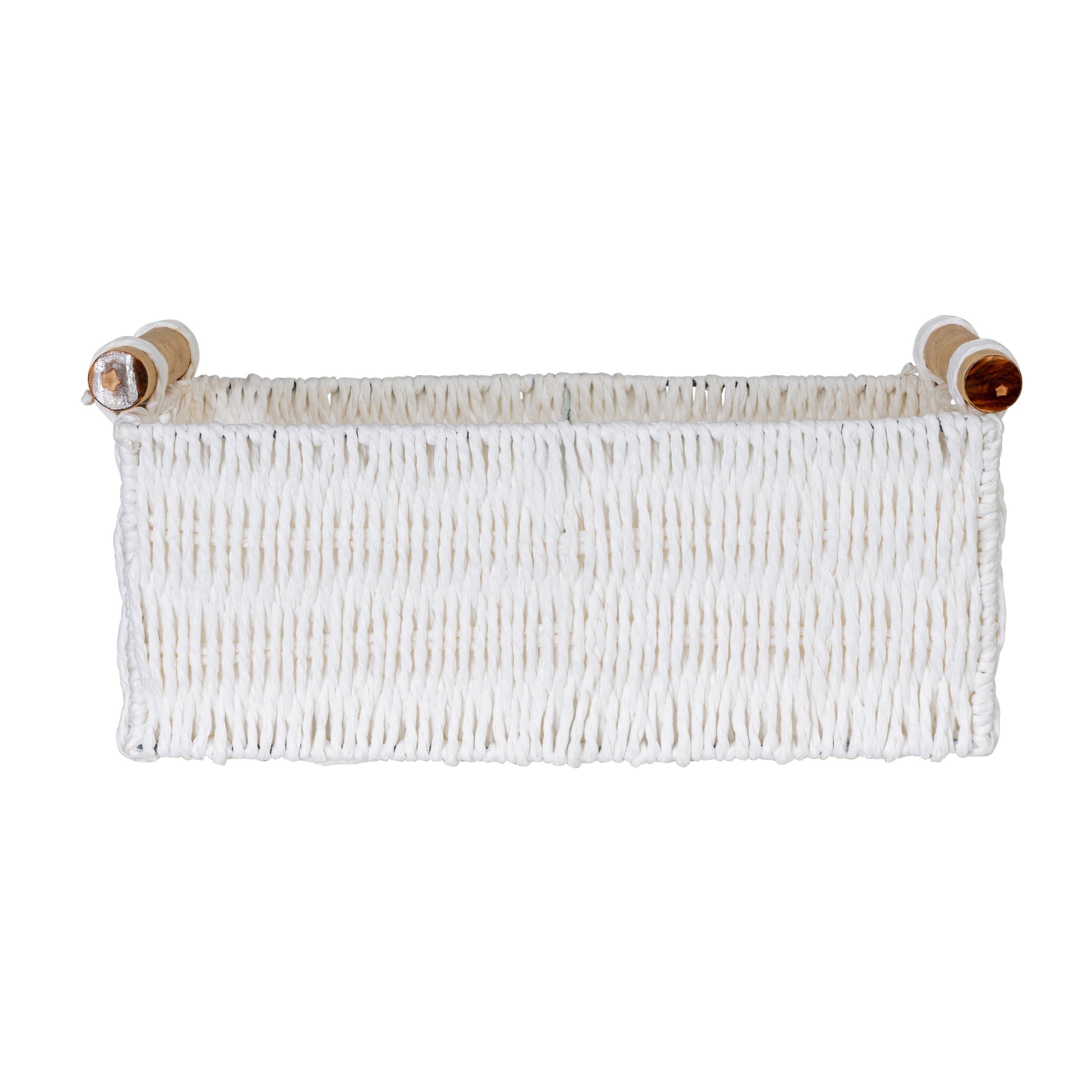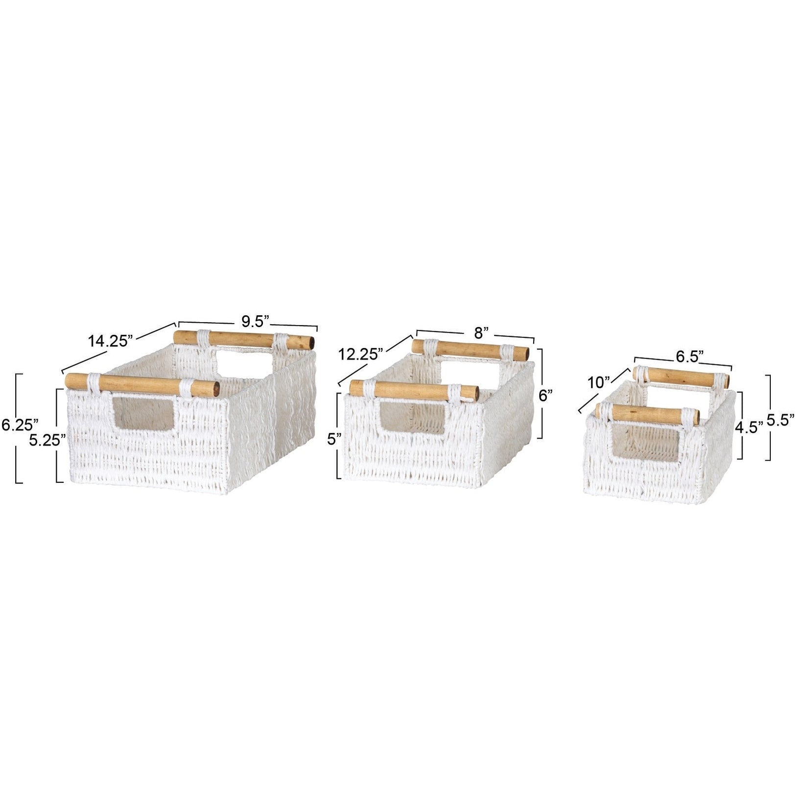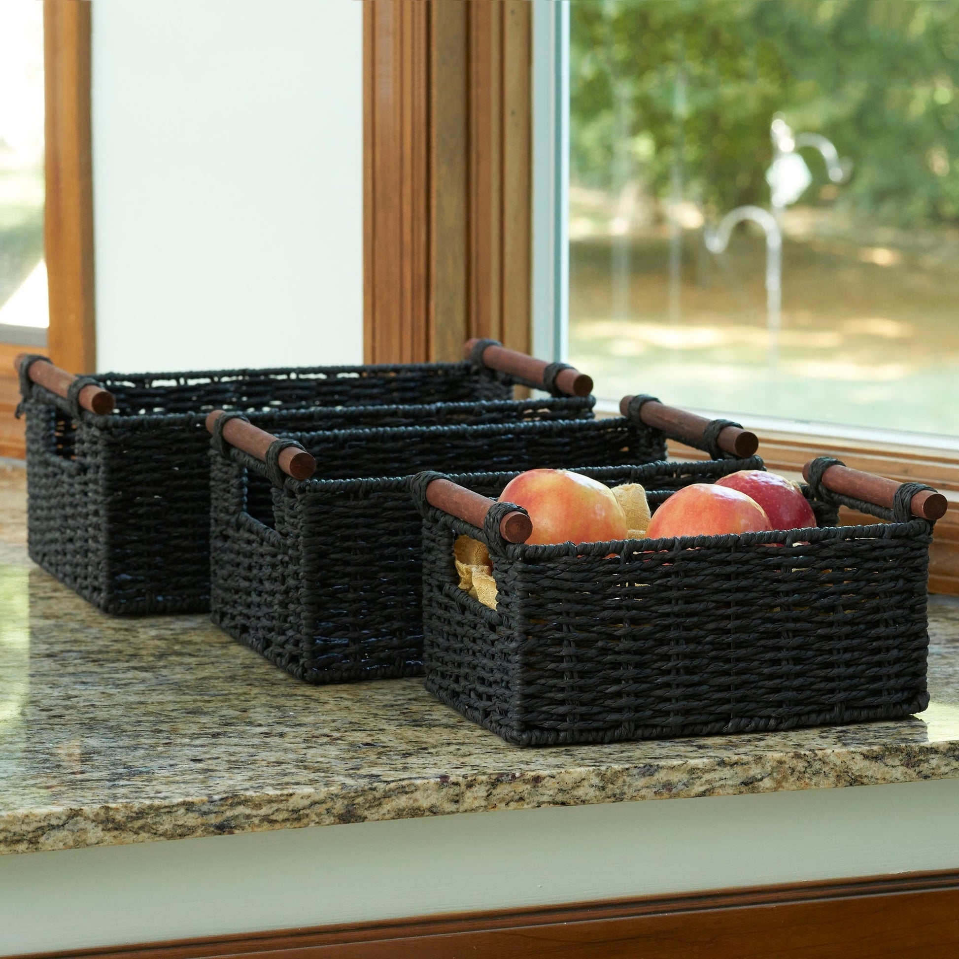 This set of 3 woven baskets offers an abundance of storage and organization potential with 3 different sizes. The set includes a small, medium and large size. These baskets may vary slightly in color and size due to their handwoven and dyed quality. These baskets are made of handwoven paper rope and finished with an attractive stain. This paper rope is supported by a metal frame that gives ample structure to the contents. For compact storage, these can be nested together to save on space, and the wooden handles add extra mobility to your storage. Use these baskets in any room of your home, including the kitchen, patio, bedroom and bathroom. Organize your fruits and recipes in the kitchen, decorate your patio with accents, keep your accessories organized on your dresser top and stock your bathroom on all the essential toiletries. These naturally beautiful baskets offer an abundance of storage options with a rustic style. They will help with detailed organization and allow you to carry various essentials around the house. Their wide range of functionality is bound to add to any room of the home.