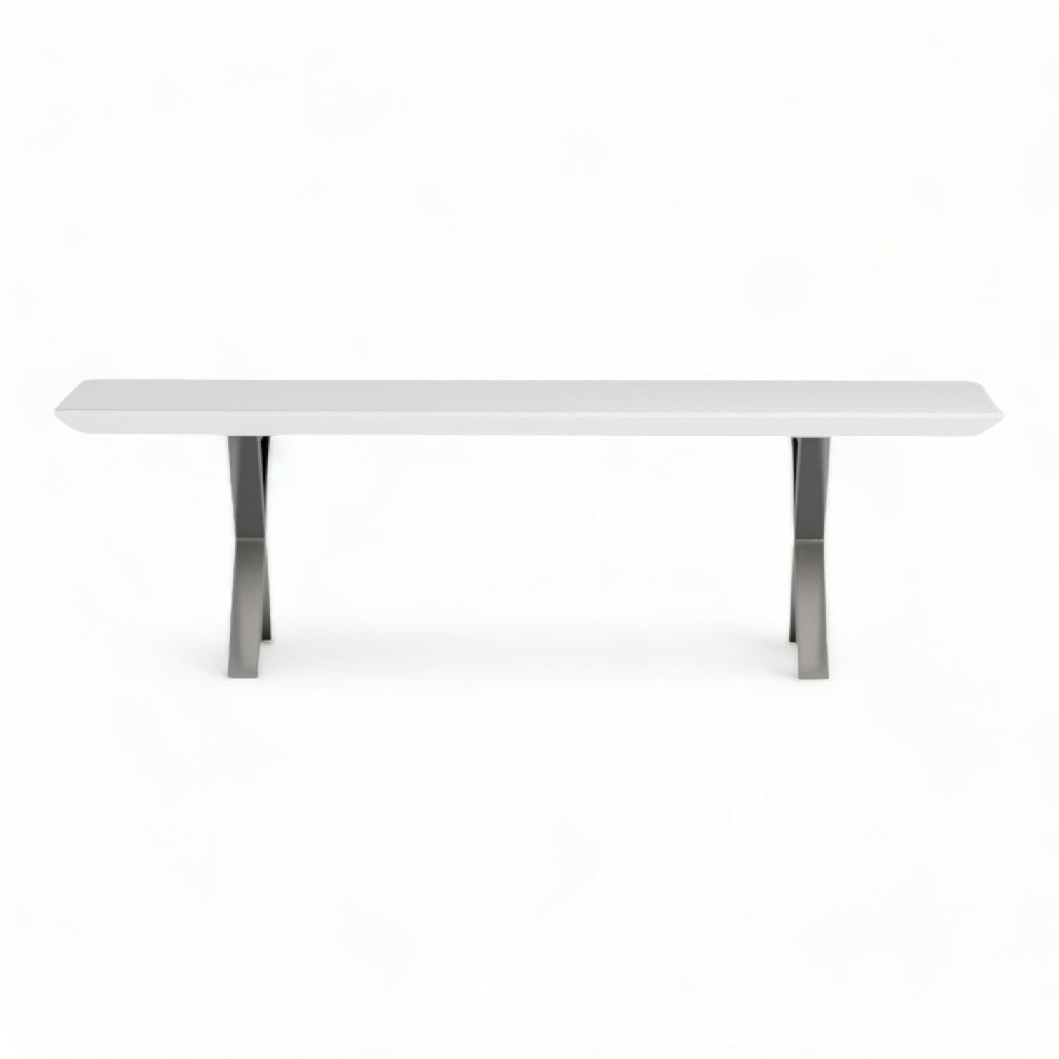 [description]Le modernisme prend vie avec cette table à manger rectangulaire Infinity. Ses lignes nettes et ses proportions harmonieuses offrent un design captivant pour les salles à manger. L'association d'un plateau en verre trempé, d'une laque blanche brillante et d'un piètement en acier inoxydable poli confère une touche de luxe et captive l'attention. Ses dimensions sont idéales pour les grandes salles à manger. Elle peut accueillir 8 personnes.[/description]
