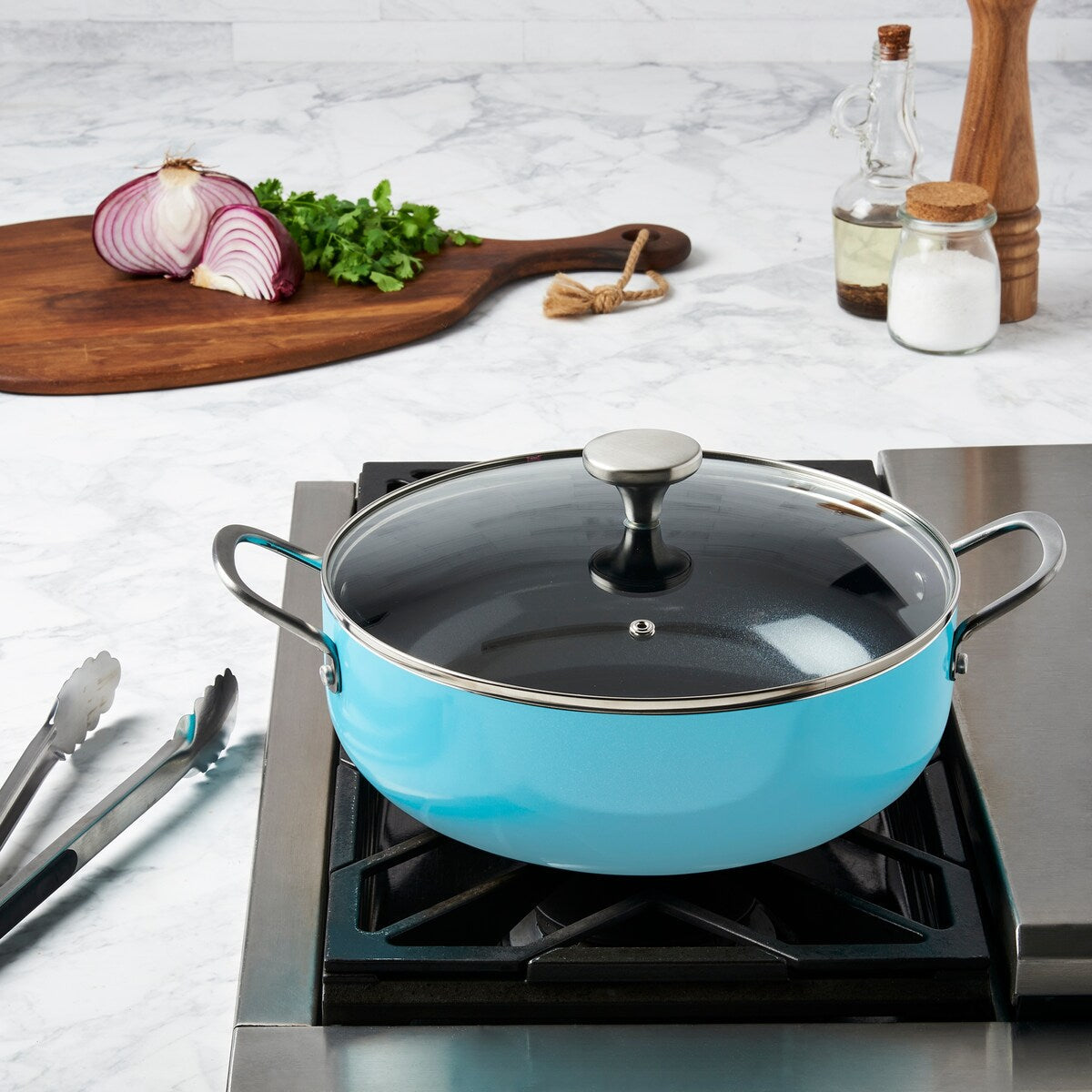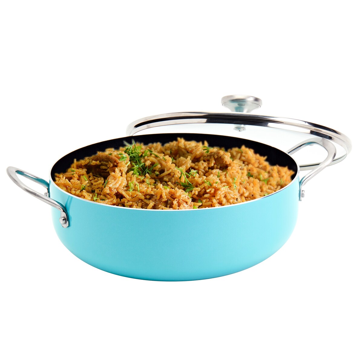 INFUSE brings the intense flavors of Latin cuisine to your kitchen with a cookware collection that celebrates the cultural significance of Latin cooking. Our assortment is designed to honor the rich history of the cuisine and bring out the delightful aromas and delicious flavors that have made the food so popular worldwide.Whether you're cooking rice, braising meat, or simmering a stew, grab a reliable caldero and enjoy an authentic and deliciously prepared meal. Designed to be a kitchen workhorse, this caldero, from the Spanish 'cauldron,' features rounded sides that are built to handle a wide variety of recipes. This beautiful 6-quart aqua teal caldero is dependable and versatile, made of durable aluminum that heats up quickly and evenly, and finished with a premium non-stick coating for excellent food release and easy cleanup.
