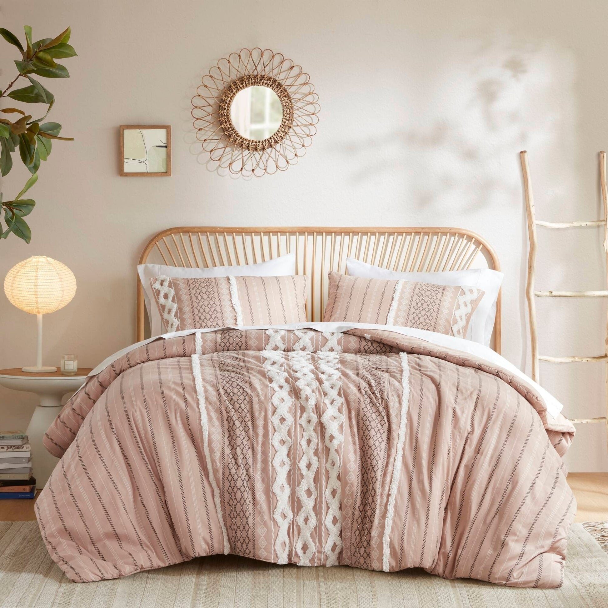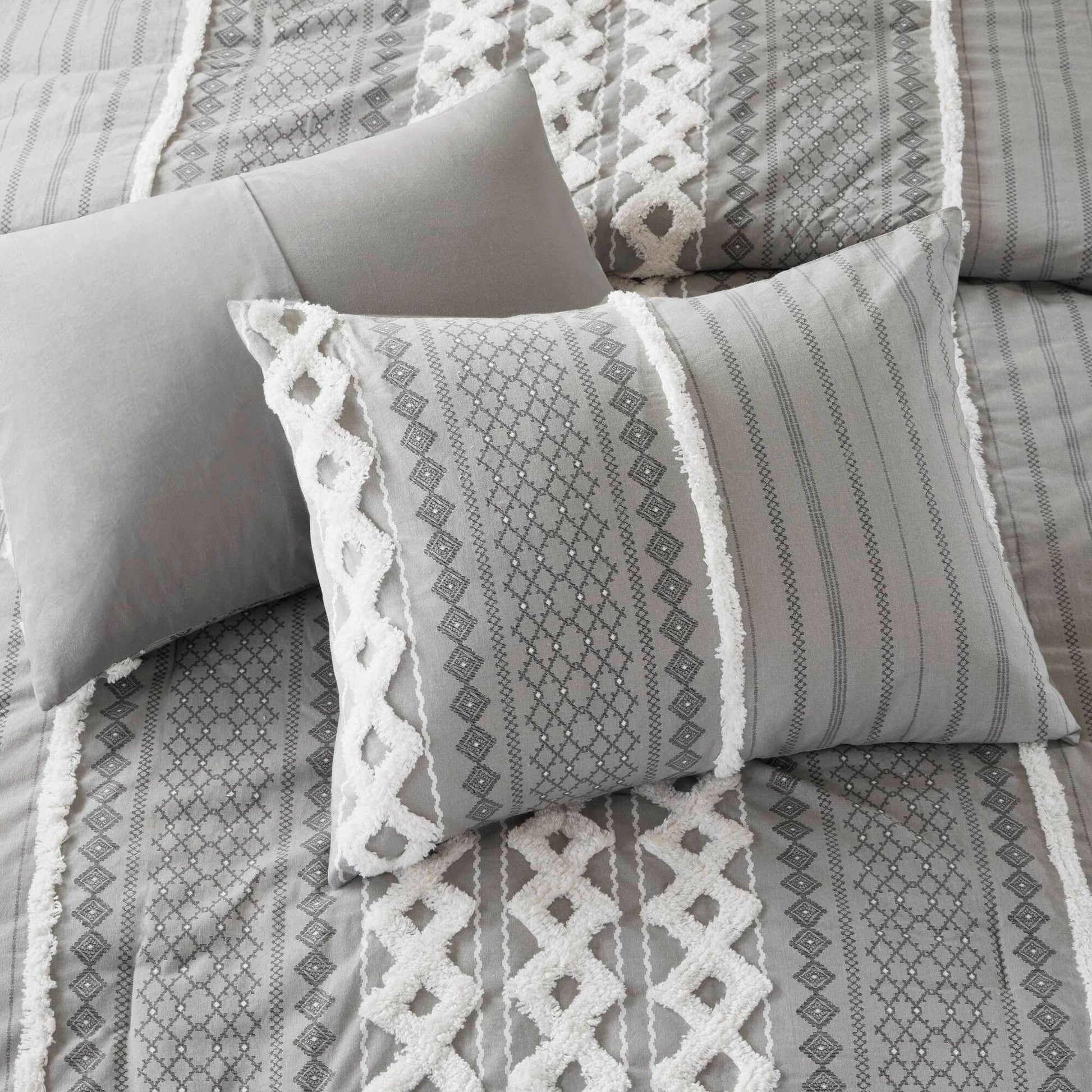 Bring a soft, mid-century look to your bedroom with the INK+IVY Imani Cotton Duvet Cover Mini Set. The cotton duvet cover features geometric prints with tufted chenille that adds dimension and charm, while the solid reverse complements the eye-catching patterns seen on top of the bed. Button closure and four inside corner ties allow you to place and secure a comforter insert within the duvet cover, for warmth and comfort. Two cotton shams reiterate the designs of the duvet cover, creating a stunning coordinated look. Made from 100% cotton, this duvet cover mini set is machine washable and offers a refreshingly soft update to your bedroom decor. This bedding set is also OEKO-TEX certified, meaning it does not contain any harmful substances or chemicals, ensuring quality comfort and wellness.