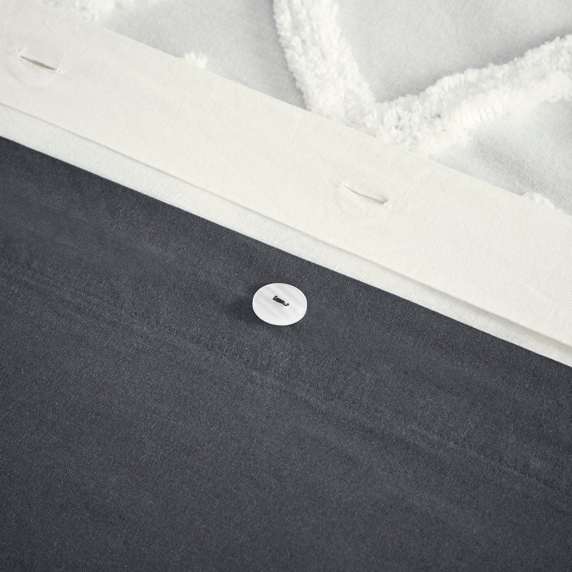 - Duvet/ Sham: 100-percent Cotton, printed and tufted with chenille, solid cotton reverse. Button closure at bottom of duvet. 4 corners with inside ties. Sham with overlap closure at back.