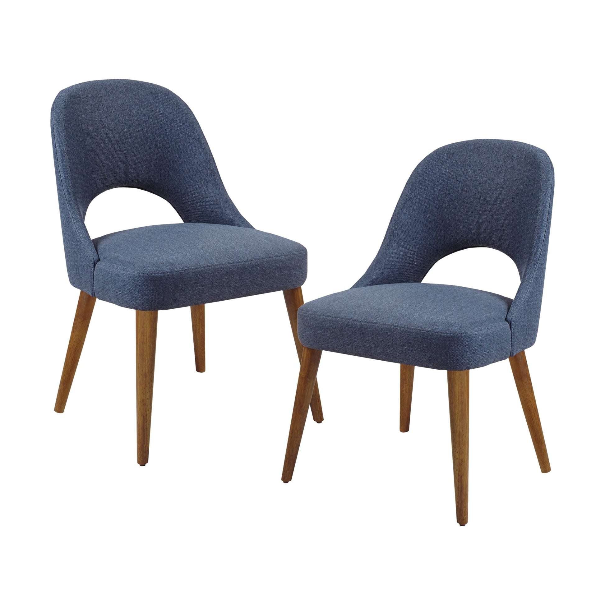 Elevate any space with the INK+IVY Nola Upholstered Dining Side Chairs (set of 2). These versatile, mid-century modern chairs feature a curved cutout back and splayed wood legs for a stylish, space-saving design that tucks neatly under tables. Upholstered in soft, durable, and easy-to-maintain fabric, the thickly padded seat with high-density foam offers exceptional comfort and support for extended seating. Built for durability, each chair supports up to 300 lbs, while the cutout back serves as a convenient handle for easy repositioning. Perfect for dining rooms, living rooms, bedrooms, entryways, home offices and more. Quick and easy leg assembly required for added convenience.