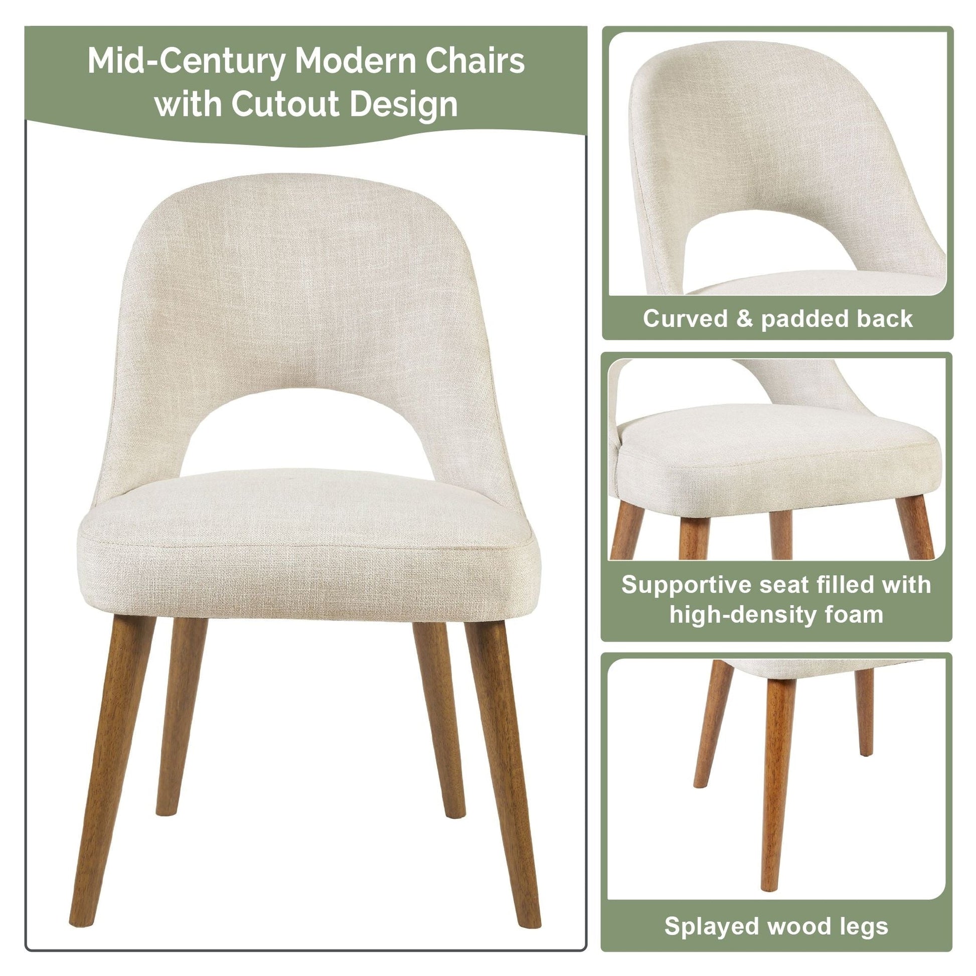 - Mid-century modern chairs feature curved back with cutout design and splayed wood legs