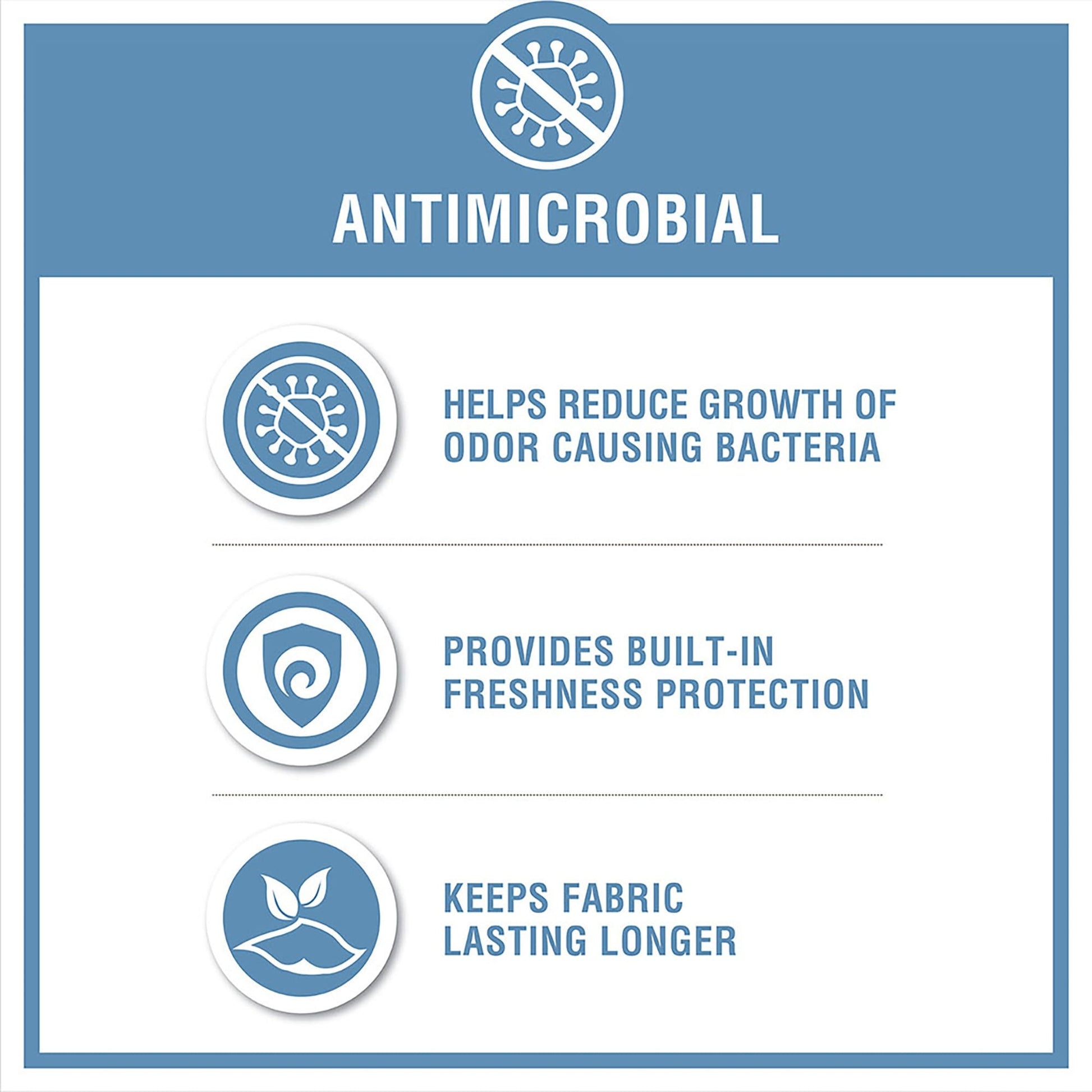 - Antimicrobial treatment helps reduce the growth of odor causing bacteria and keeps fabric lasting longer