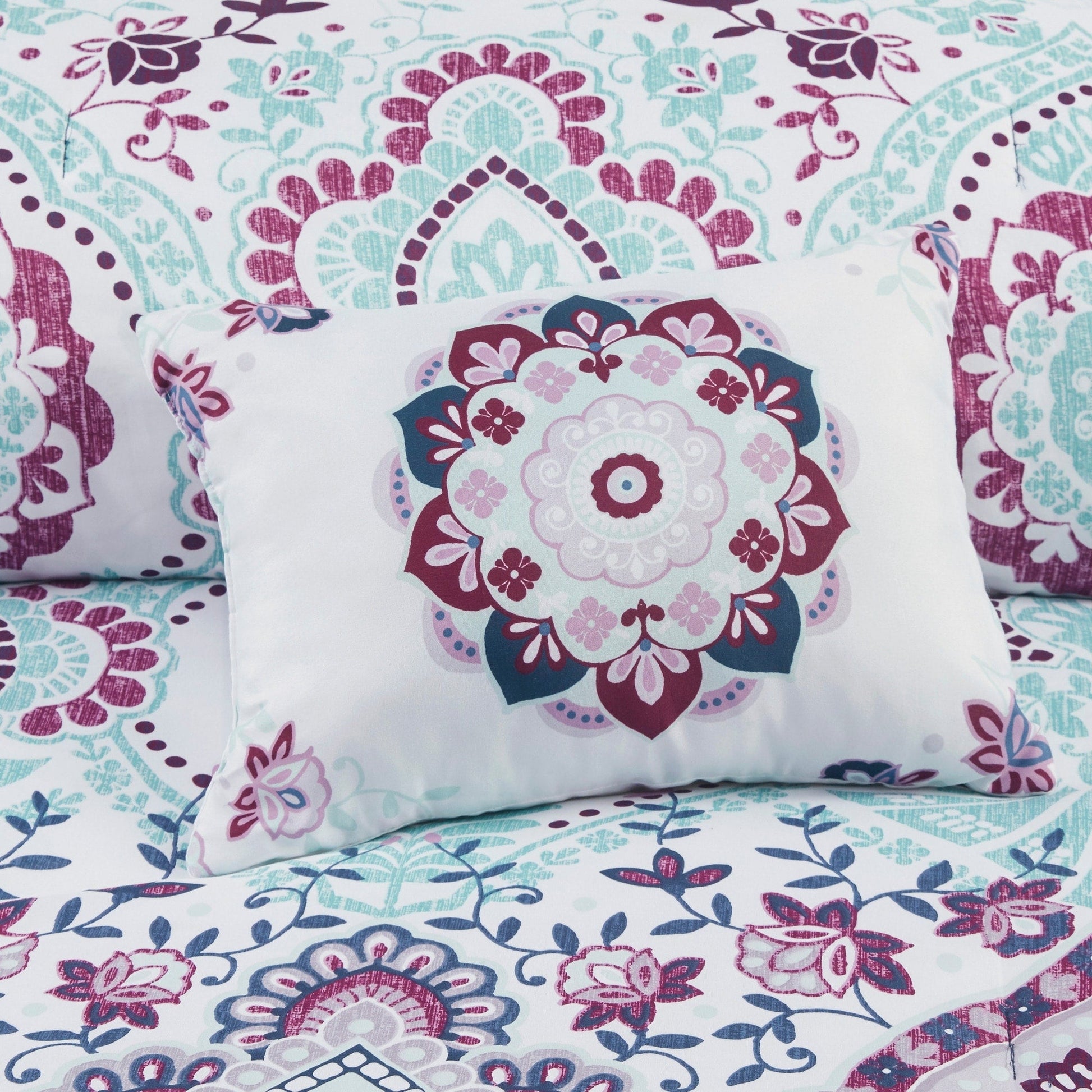 The Intelligent Design Avery Boho Comforter Set with Bed Sheets offers a fun and fashionable update your bedroom. Flaunting a vibrant colorful globally inspired pattern, the comforter has a solid navy reverse that complements the top of the bed. Matching shams (1 in Twin/Twin XL) with pintucked details add texture and dimension, while a coordinating decorative pillow provides the finishing touch. A complete sheet set with a floral print is also included. This bedding set is OEKO-TEX certified, meaning it does not contain any harmful substances or chemicals, and has an antimicrobial treatment that provides built-in freshness protection, reducing the growth of odor causing bacteria to keep fabric lasting longer.