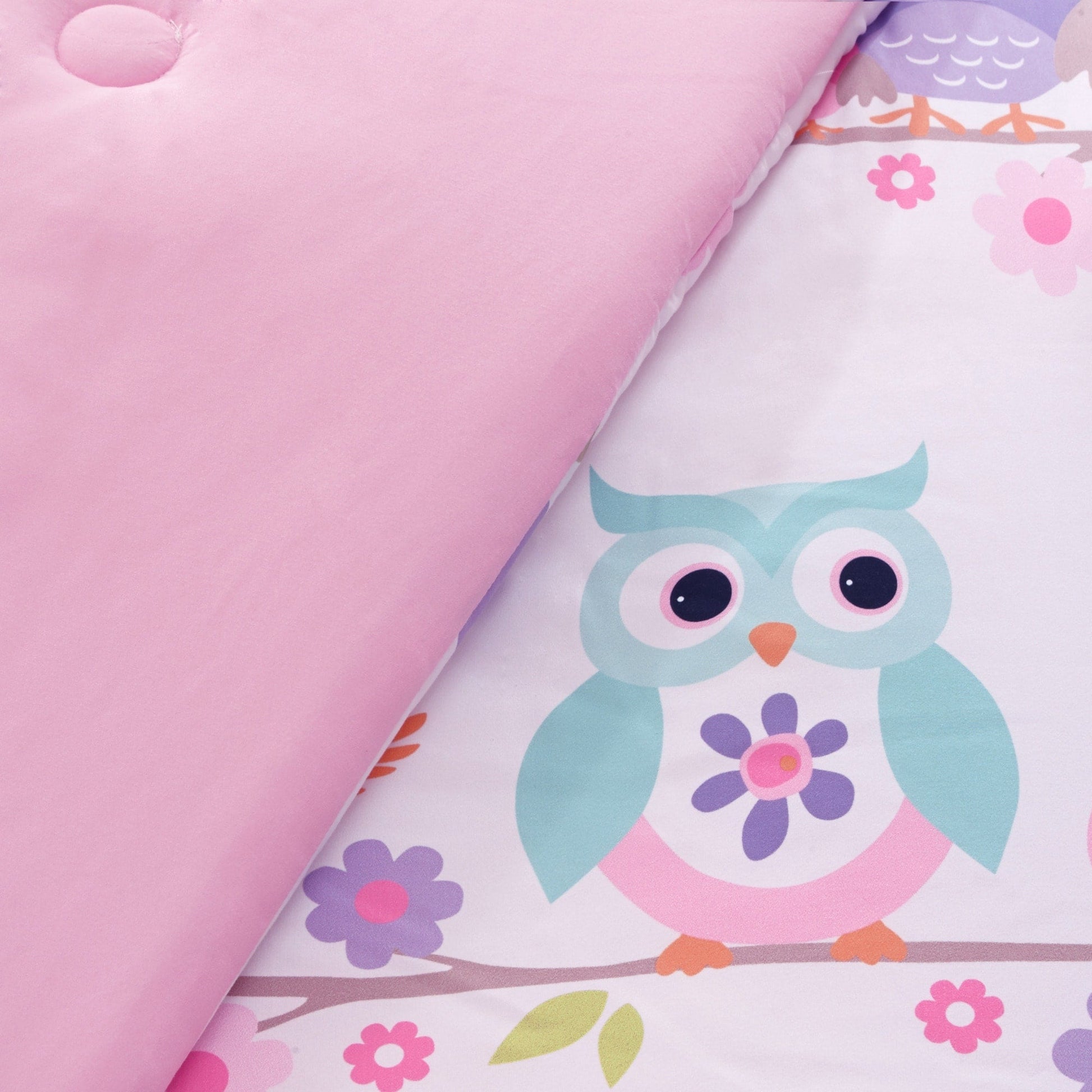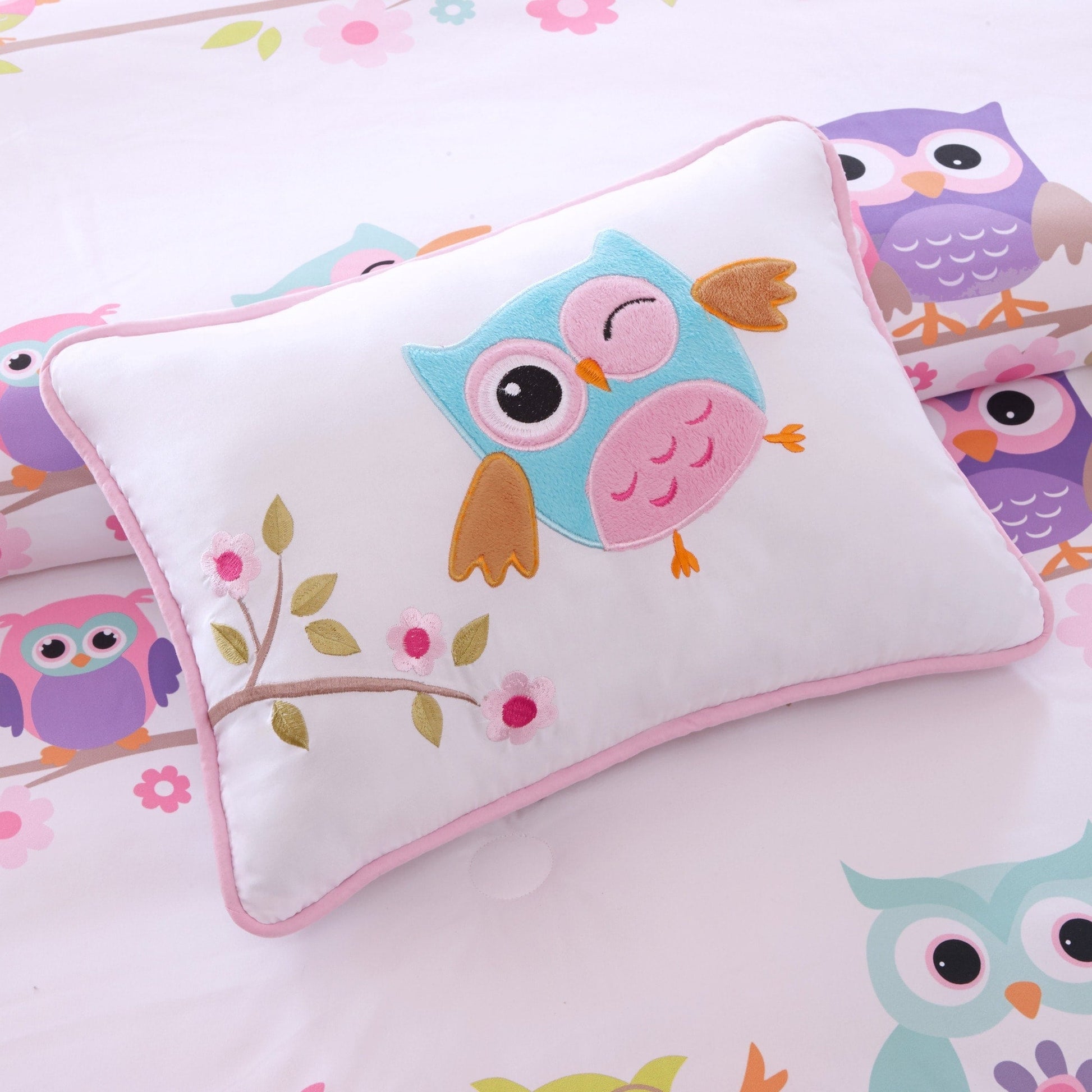 Your child will get a hoot out of the Intelligent Design Kids Nocturnal Nellie Owl Comforter Set with Bed Sheets. A lovely owl and flower print is adorably displayed on the exceptionally soft comforter and shams (1 in Twin/TwinXL) to create a cute and smart look. A vibrant pink sheet set perfectly complements the comforter with printed white daisies for a charming touch. Made from ultra-soft microfiber, this complete bed and sheet set is machine washable for easy care. A decorative pillow with a plush owl applique provides the finish touches for a warm and cheerful look. This bedding set uses an antimicrobial treatment that provides built-in freshness protection, reducing the growth of odor causing bacteria to keep fabric lasting longer.