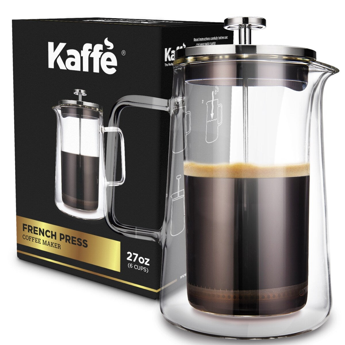 - ✨ UNIVERSAL ECO-FRIENDLY DESIGN: Kaffe french press coffee maker will be your ideal choice because of its efficient and timeless design, with no need for plastic capsules, coffee pods or paper filters. The coffee pot is made from food-grade 304 stainless steel that ensures years of use. This classic French press coffee maker is the simplest way to a fragrant brew.♨️ KEEP YOUR COFFEE HOT FOR A LONG TIME: Our french press coffee maker will keep your coffee, tea or beverage warm for up to 4 times longer than a glass coffee press. Its double wall insulation is designed to keep the heat inside and away from your hands. It can be the key to jump start your day.☕️ LONG-LASTING TASTE AND AROMATIC COFFEE OILS ARE GUARANTEED:This coffee press is designed with dual-filter screen and composed of a sandwich of steel mesh held in place to increase the smoothness of the brew and let the orginal taste of grounds last for hours.⚙️ BALANCE BETWEEN CAPACITY, LONG LASTING USAGE AND SAFETY. Kaffe large french press has a 6-Cup Capacity (800 ml / 27 oz). An additional filter included with our french press coffee ensures long lasting and durable usage with no rust. At the same time, it maintains the pure taste of coffee with the best aromas without any additional VS cheap analoges.💰 WORRY-FREE PURCHASE: 2-YEAR EXTENDED MANUFACTURER'S WARRANTY! We take pride the quality of our Kaffe camping coffee pot and our record speaks for itself. We promise to treat you like family! Covers any damage or defect. Money back guarantee!