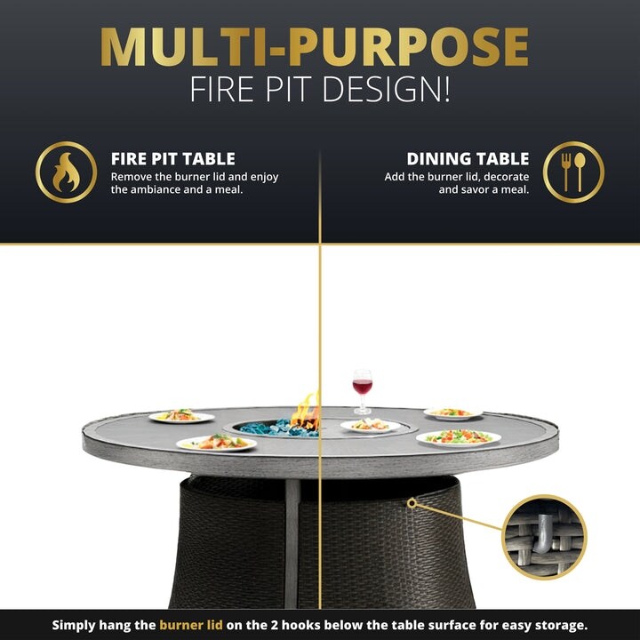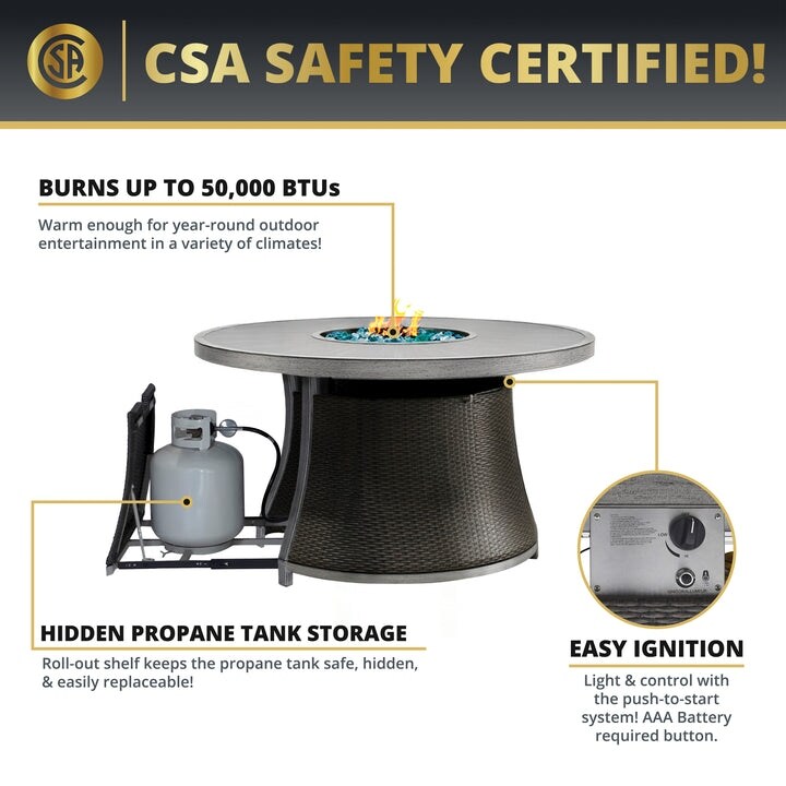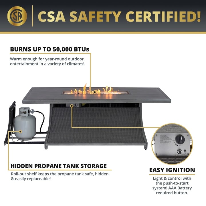 - Safety Certified: The CSA-certified gas fire pit burns at 50,000 BTU and is a smoke-free, fire safe alternative to wood fire pits. The hidden pullout tank holder stores the propane tank inside the table, and the push-to-start ignition system makes the gas fire pit easy to use.