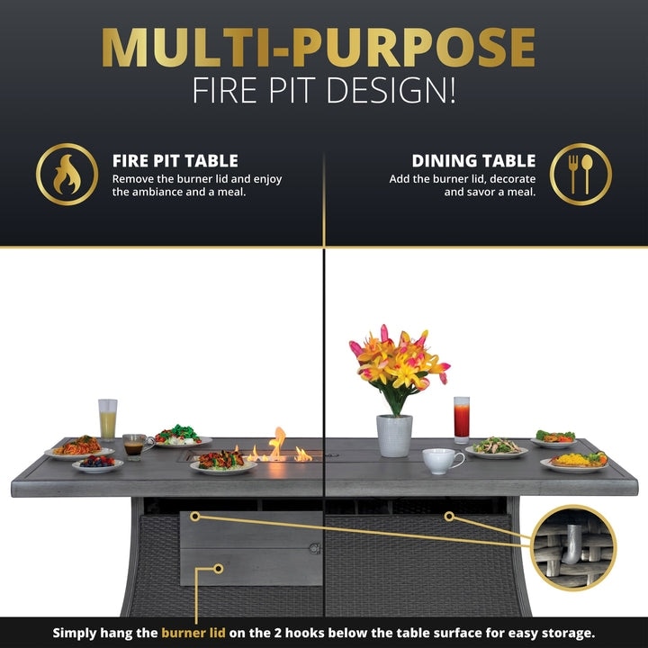 Transform your patio into a stylish and functional outdoor dining and entertainment space with the Kinger Home Isla 7-Piece Propane Fire Pit Dining Table Set. The spacious rectangular dining table features a built-in fire pit that adds warmth and ambiance to your outdoor gatherings. With a user-friendly push-to-start ignition and flame control knob, you can easily adjust the heat to your desired level. The set includes four stationary dining chairs and two 360-degree swivel chairs, each with a comfortable cushion featuring a removable, machine-washable cover. Crafted from powder-coated aluminum and handwoven resin wicker, this set is built to withstand weather, water, UV fading, and rust. Accessories included are a glass wind guard, and 10LB of crushed fire glass.