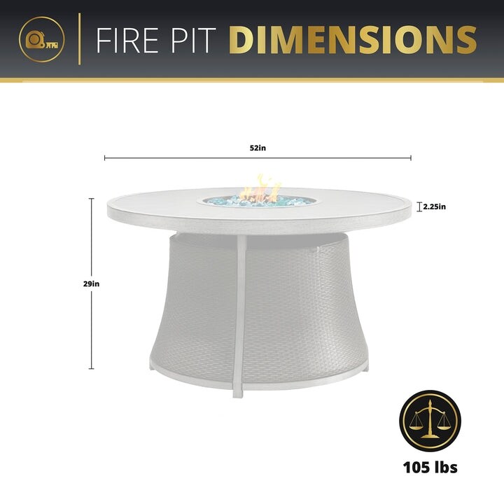 - Complete Set: The Kinger Home Isla 7-Piece Propane Fire Pit Dining Table Set includes a 76' propane fire table, four stationary outdoor dining chairs with cushions, two outdoor swivel dining chairs with cushions, a fire pit lid, a fire pit glass wind guard, and 10LB of crushed fire glass.