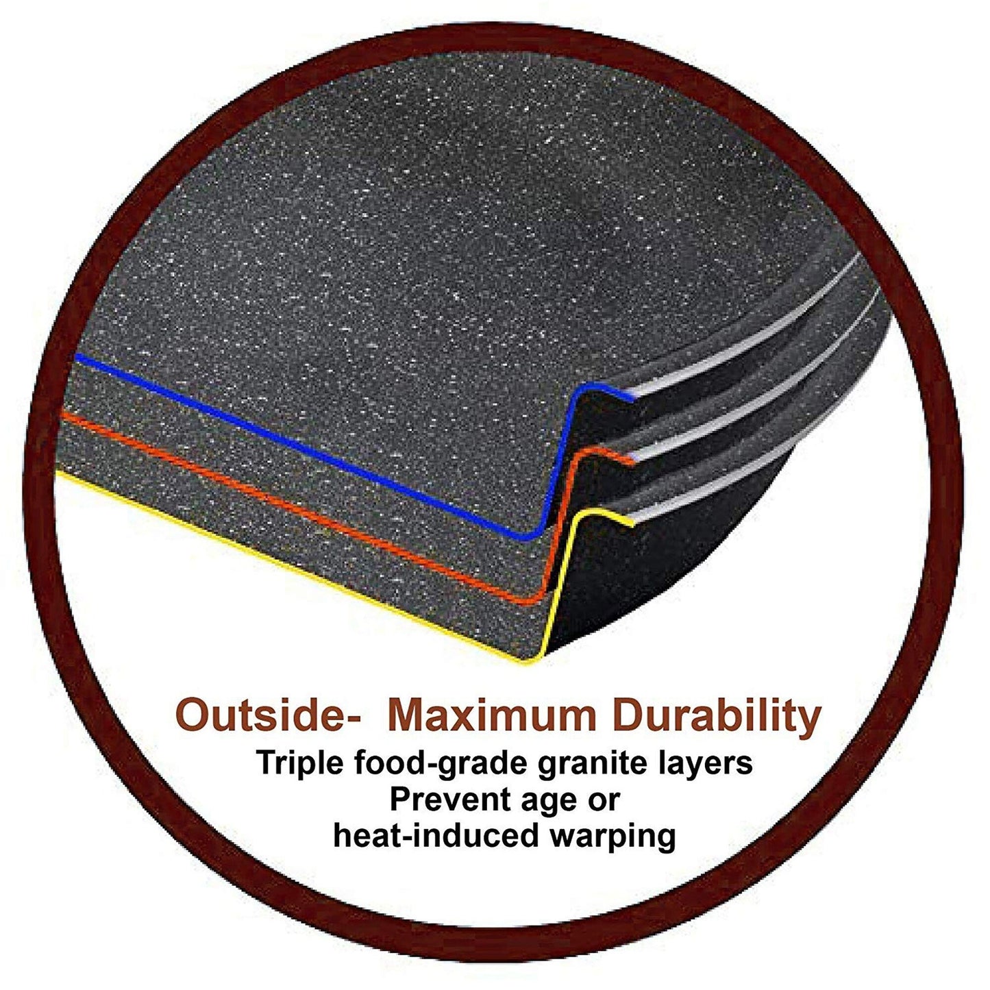 Cook up a storm with Our Nonstick Granite-Coated Cookware Set. Each piece is designed with forged aluminum bottoms for even heating on all stovetops, including induction. The triple food-grade granite exteriors provide exceptional durability and warp resistance, while the natural marble-coated interiors make cooking and cleaning easy. The wood-look bakelite handles add a touch of style to this versatile set.