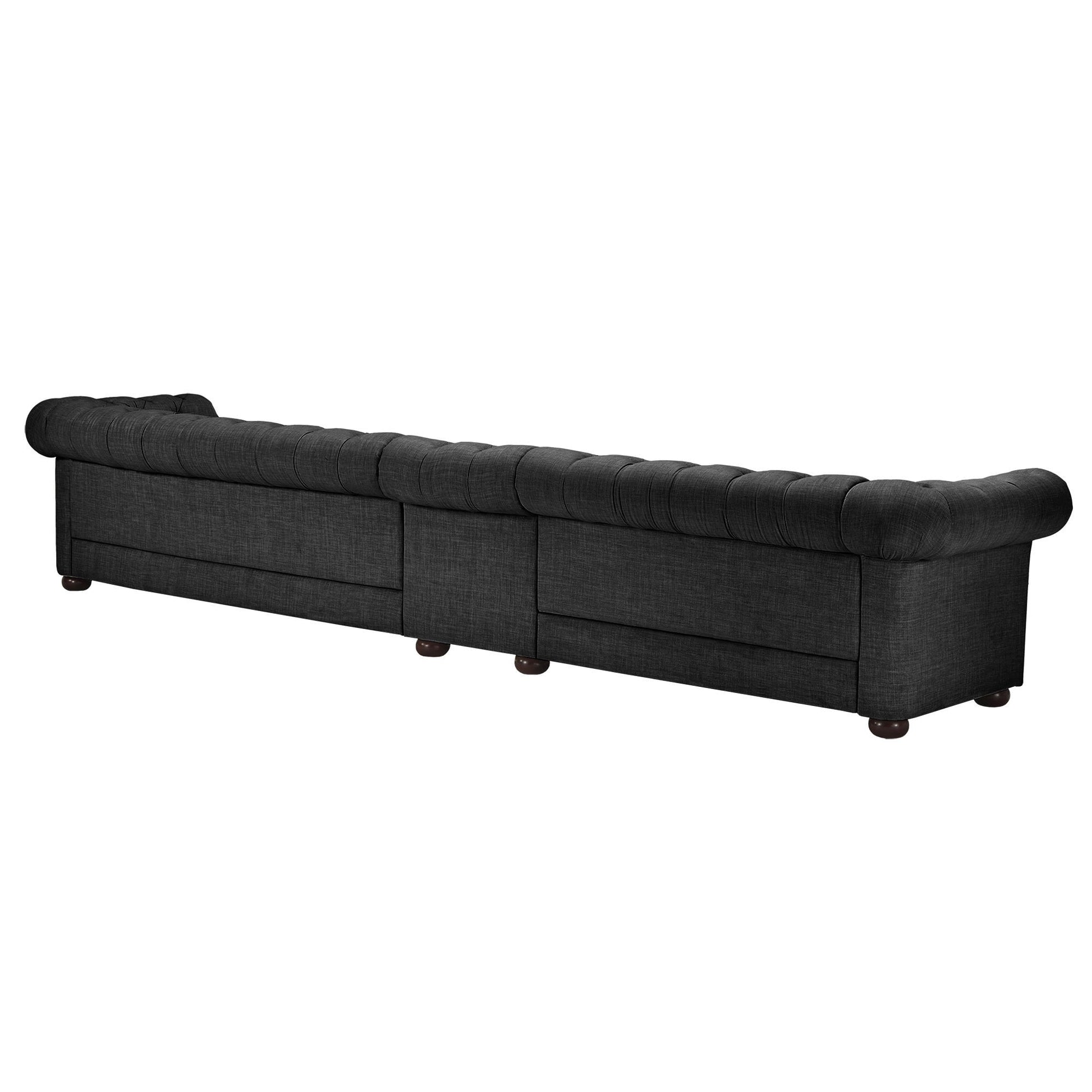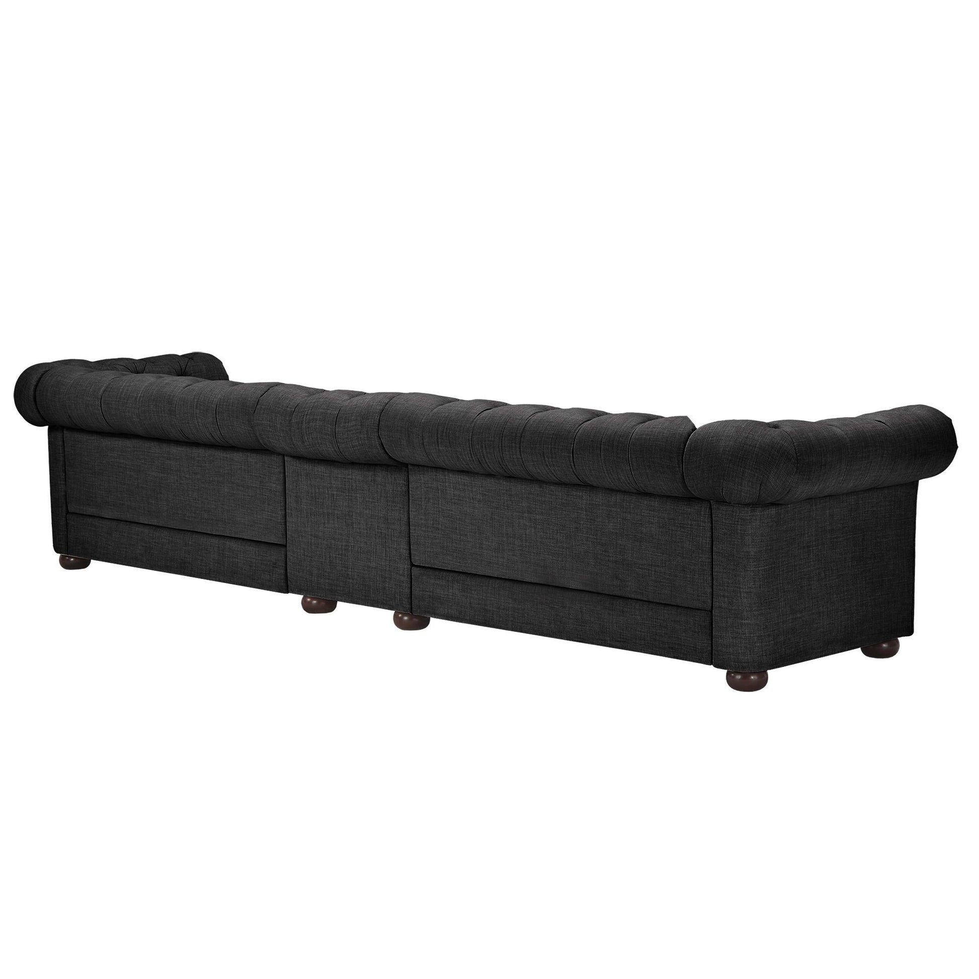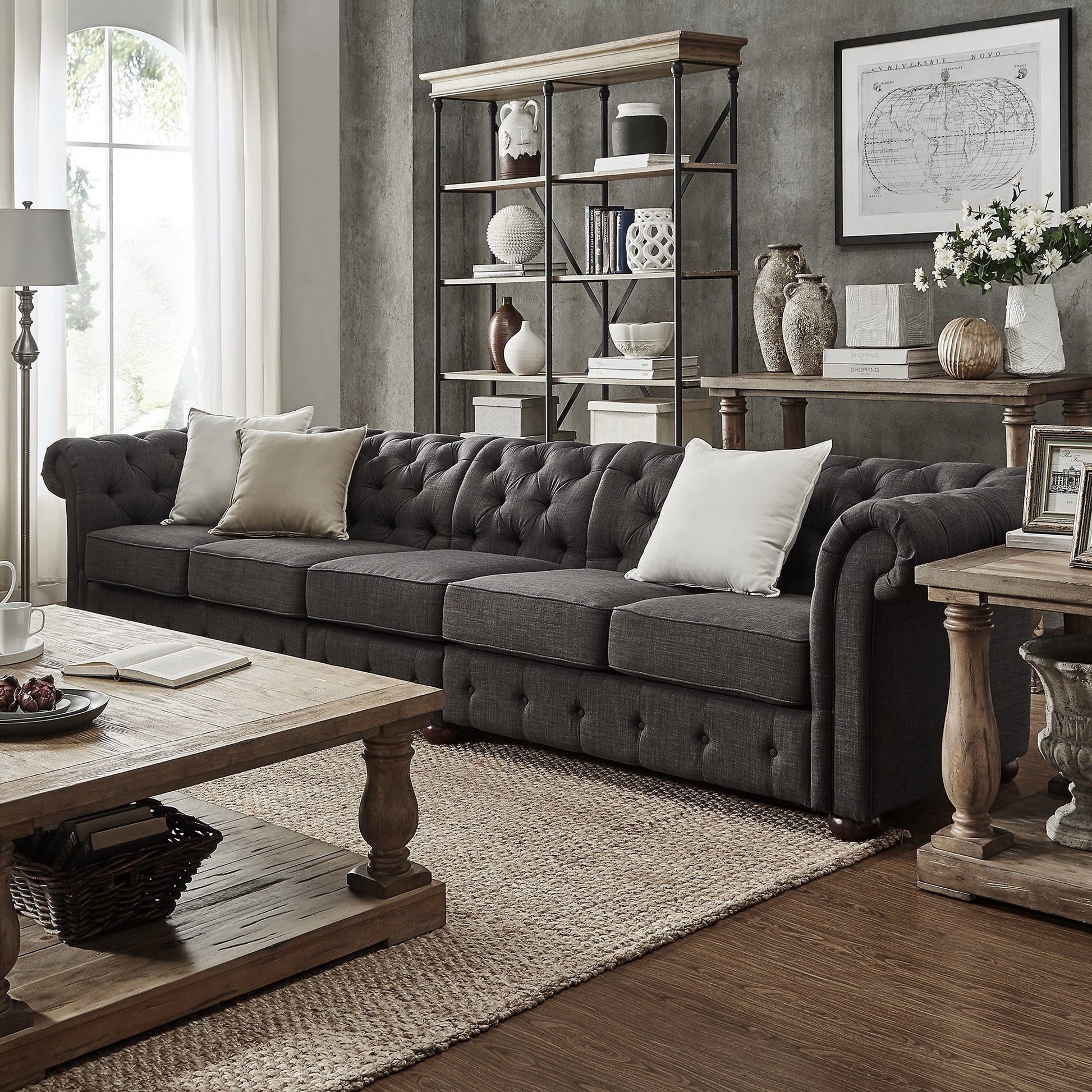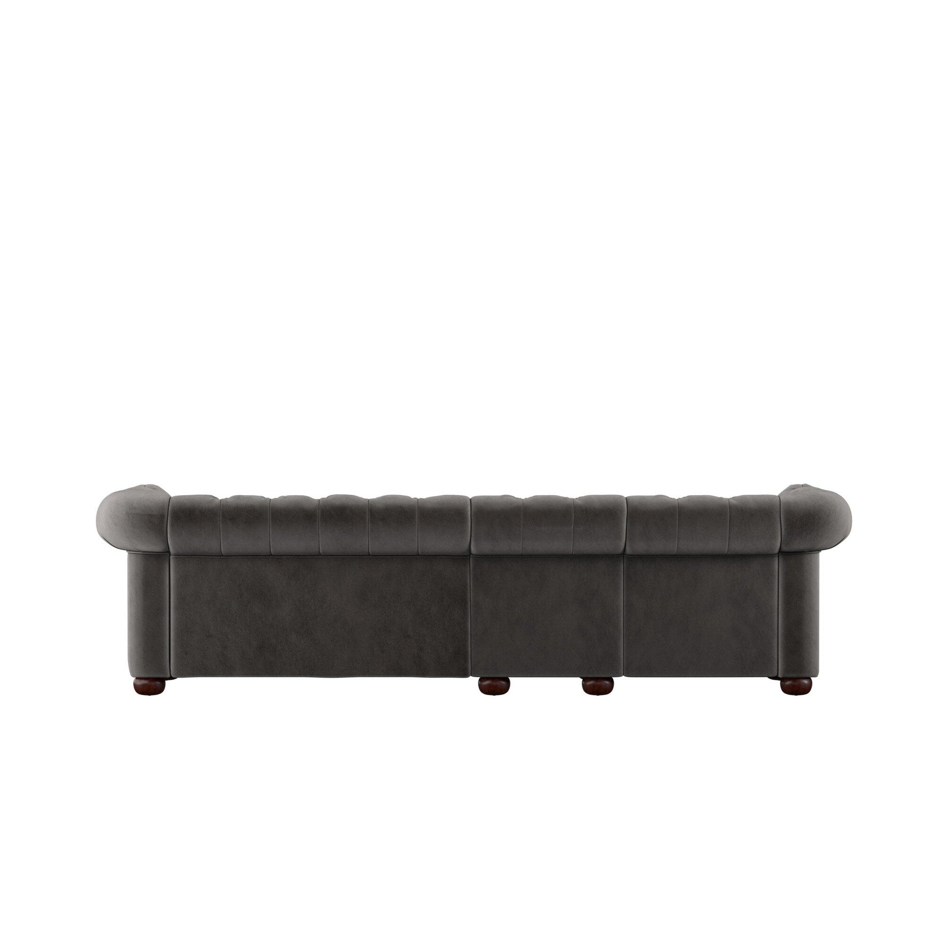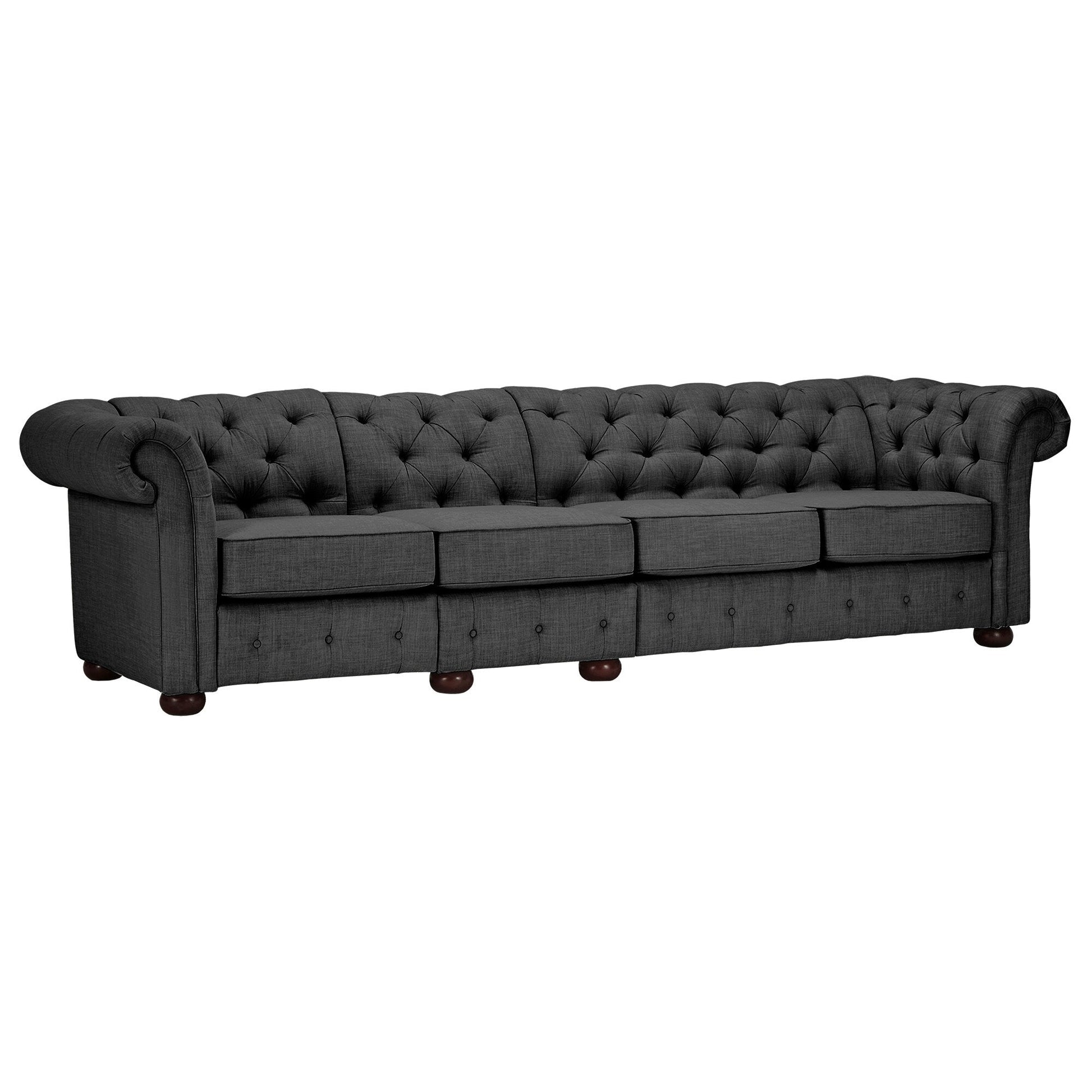 With plenty of room for all your guests, this refined and comfortable Knightsbridge sofa from iNSPIRE Q Artisan has a versatile and timeless look. Vintage elements such as button tufting and a rolled back design create a sense of classic elegance that elevates décor. Perfect for seating many while giving all a great view of the TV, this extra-wide Chesterfield sofa comes in multiple sizes. The dark-grey upholstery features deep button tufting on the backrest and foot for a chic look.