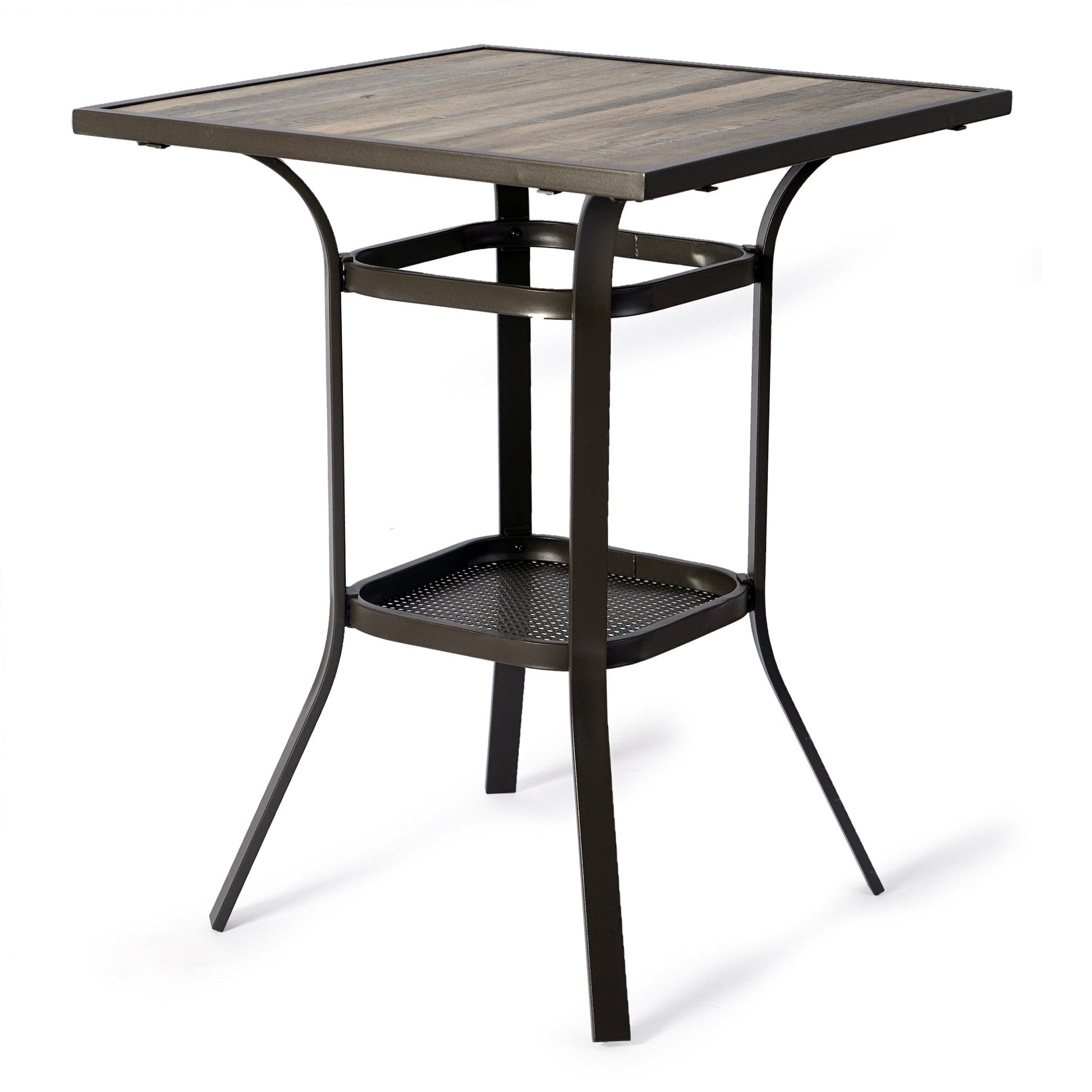 Upgrade your outdoor entertaining with the Kozyard Isabella High Swivel Bar Table. Made from wrought iron with a weather-resistant finish, this square table is durable and strong, promising to complement any outdoor space with its elegant design. The wood-like surface and cool gray color add an extra touch of sophistication, while the storage space beneath the table ensures convenience. Assembling is a breeze with the included hardware and tools, and the versatile usage of this table makes it great for various settings.