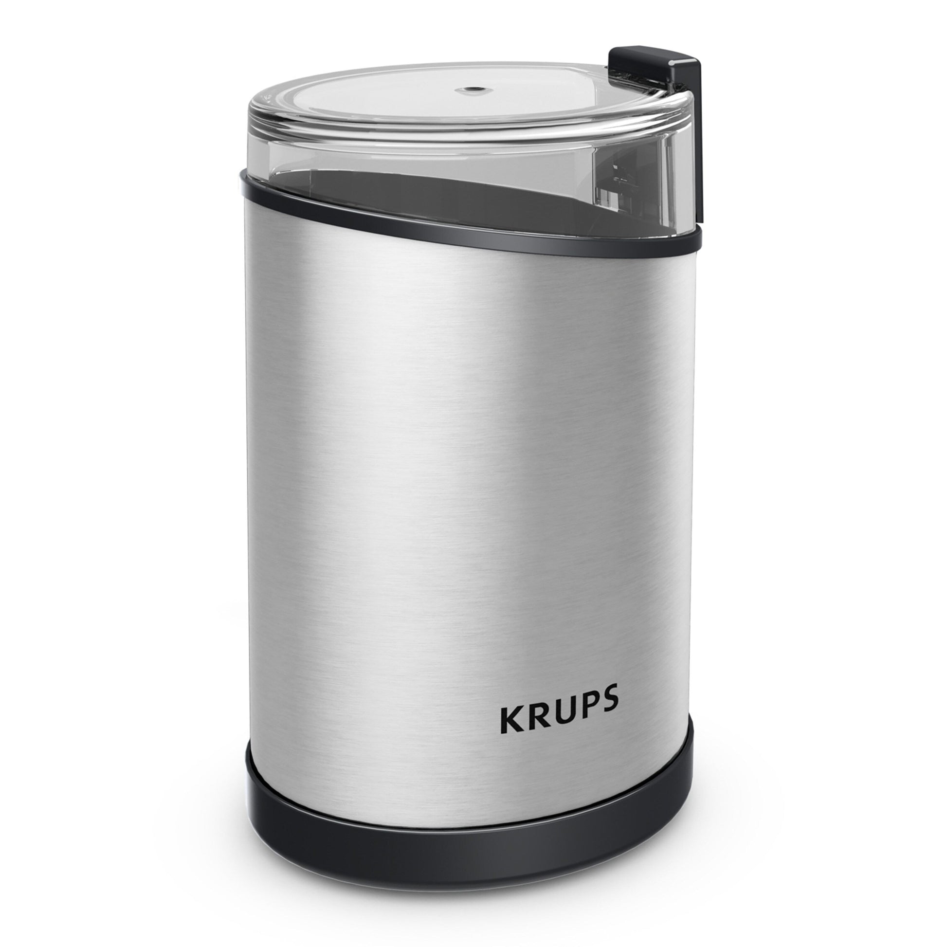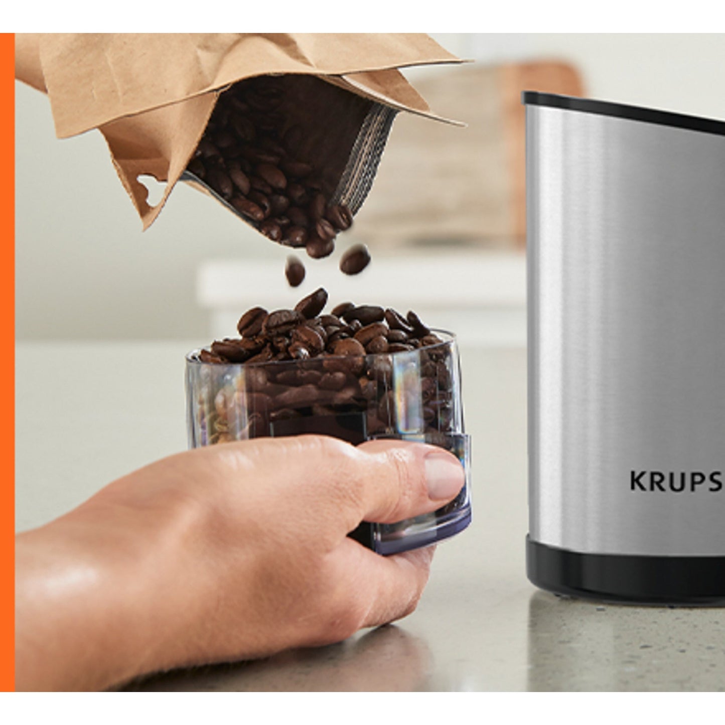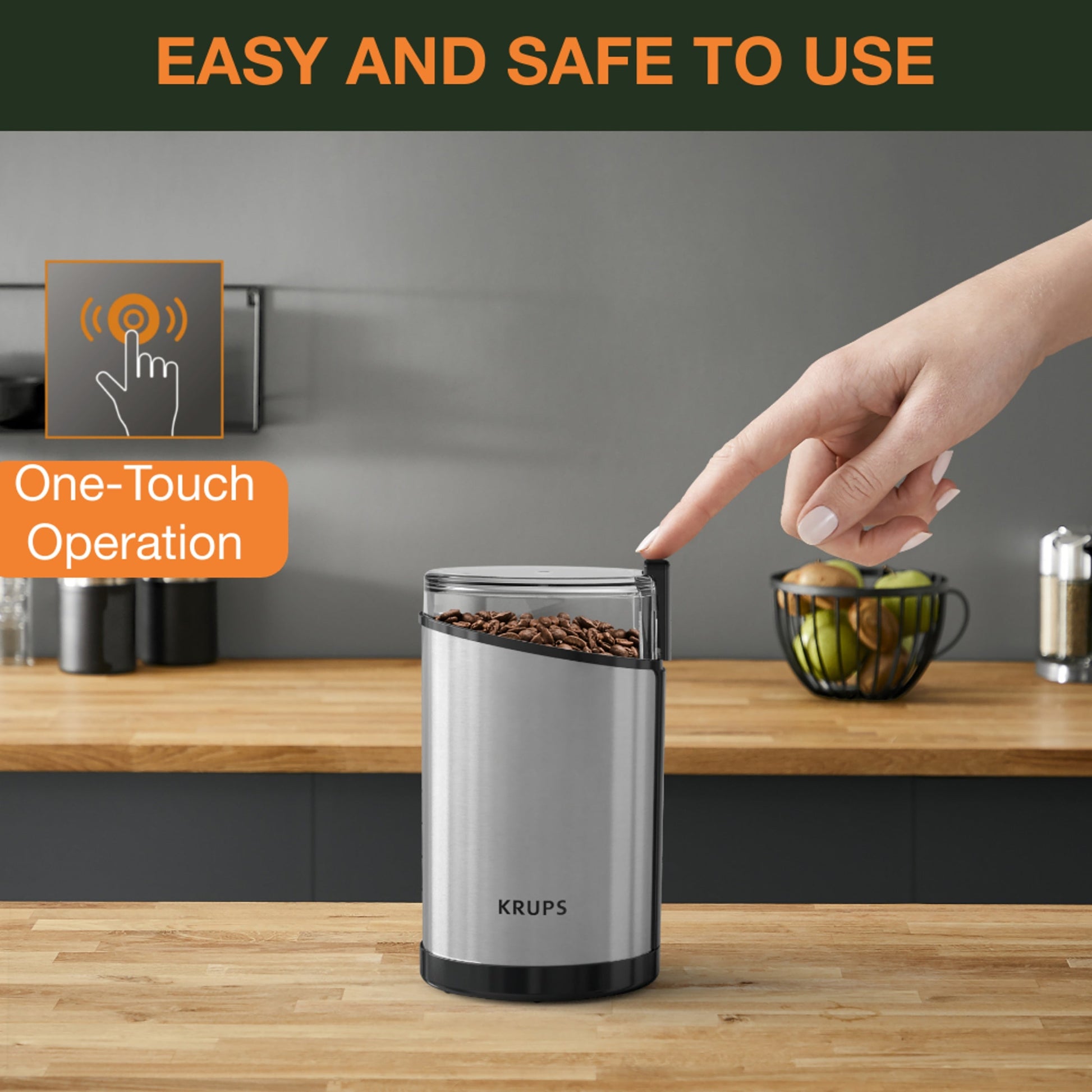 Enjoy freshly-ground coffee in seconds is a must for any coffee lover. For rich aroma and delicious flavor, the KRUPS Coffee Grinder delivers perfect results with a process that couldn't be easier. Simply add whole beans, secure the lid, and press the side lid button to start. Achieve perfectly-ground coffee in any consistency, from ultra fine to coarse, and taste the difference in your cup: robust, aromatic coffee bursting with flavor. In addition to coffee beans, this versatile and safe grinder can be used for chopping or grinding nuts, seeds, herbs and spices -- perfect for everything from summer salads and gourmet entrees to yummy baked goods. With a compact design and sleek aesthetic, this electric coffee grinder makes a convenient and useful addition to any kitchen.