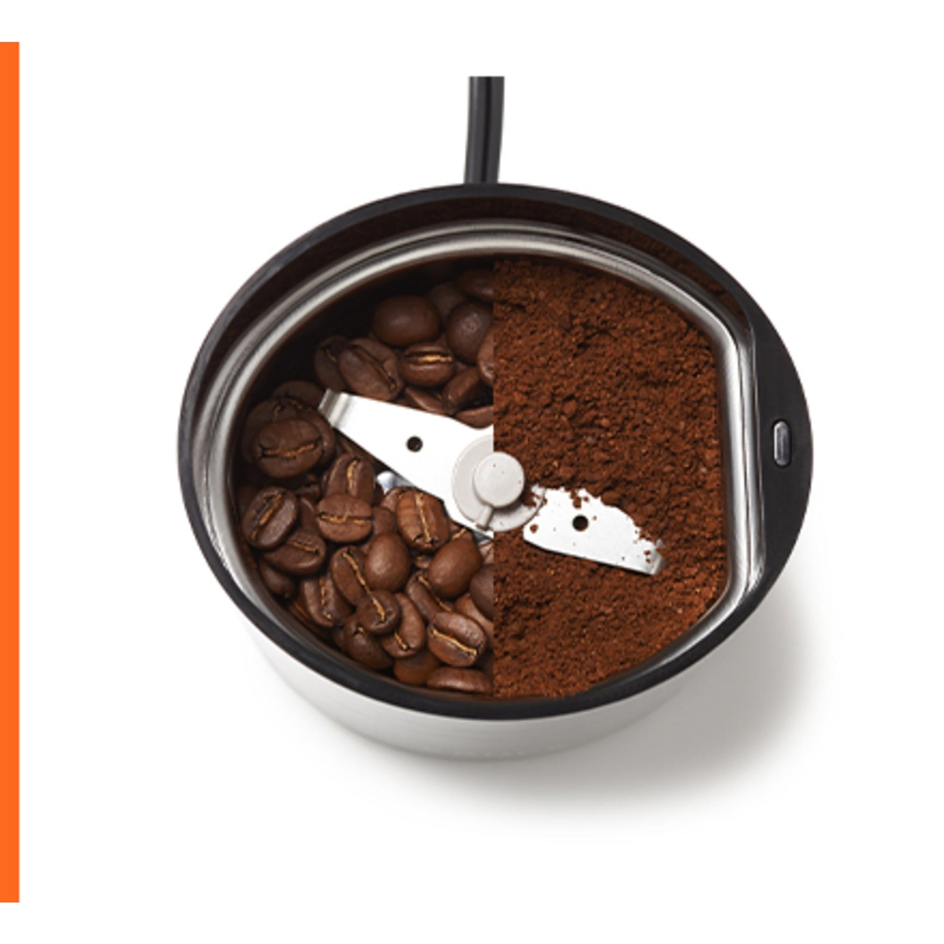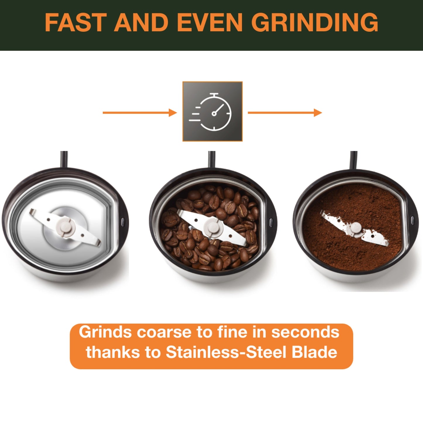 - GRINDS IN SECONDS: Unique stainless-steel blade construction and grinding bowl design guarantees fast and even results. Transform whole coffee beans into freshly uniform coffee grinds in about 10-15 seconds to brew 12 cups of coffee.