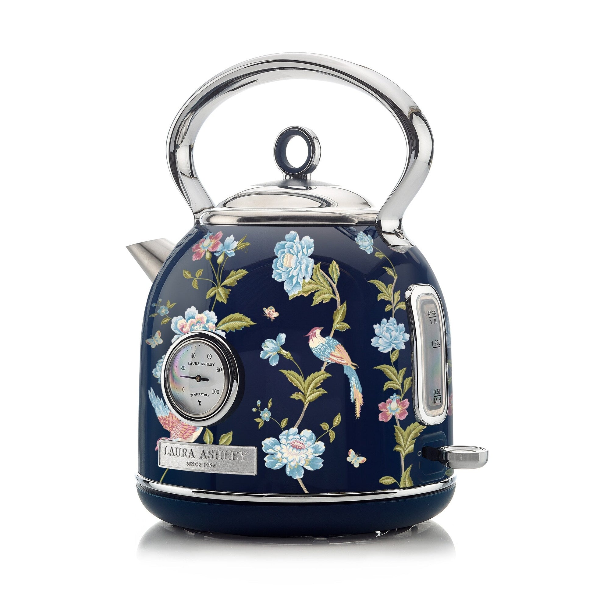 Whether it's a morning brew, afternoon tea, or an evening sip, the VQ Laura Ashley Dome Kettle is a promise of elegance and efficiency, with every drop reflecting the enduring legacy of Laura and Bernard Ashley. A truly iconic addition to your designer home. Radiating with timeless grace, the Dome stainless-steel kettle, seamlessly wrapped (by hand) in Laura Ashley's classic Elveden Navy print. Each kettle is hand decorated and finished with a high-grade gloss UV coating to ensure it looks pristine day in day out. The generous 1.7L capacity ensures you're always prepared to serve loved ones or indulge in a personal moment of serenity. With a capacity of up to seven cups. A perfect match for a rich tasting coffee, delicious warm tea, hearty oatmeal, pasta, noodles, and much more. The chrome handle is more than just a touch of elegance: it offers a sturdy and reliable grip. This kettle, adorned in a harmonious blend of iconic and modern prints, transforms an everyday appliance into a statement piece of art. The rapid boil electric kettle has several safety functions. It has a dry boil feature that automatically shuts down the power if no water is inside and overheat protection with a concealed heating element. It helps to conserve energy, saving you money and also the environment with its external water level indicator. A tactile on/off rocker switch with a light indicator. It has an external large round temperature gauge for that perfect brew and a fast boiling capability. It is super convenient and looks gorgeous in your kitchen, or home office.