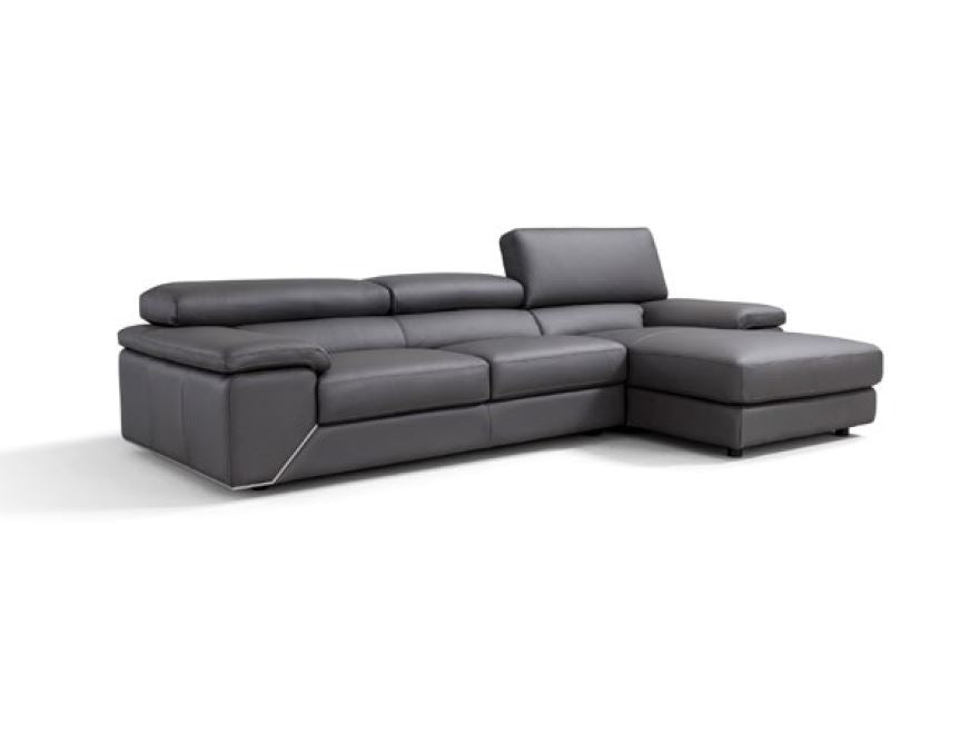 moderne et confortable appuis-tête réglables en hauteur entièrement recouvert de cuir pleine fleur détails en métal sombre options cuir gris clair ou gris-taupe chaise longue orientée à droite ou à gauche |