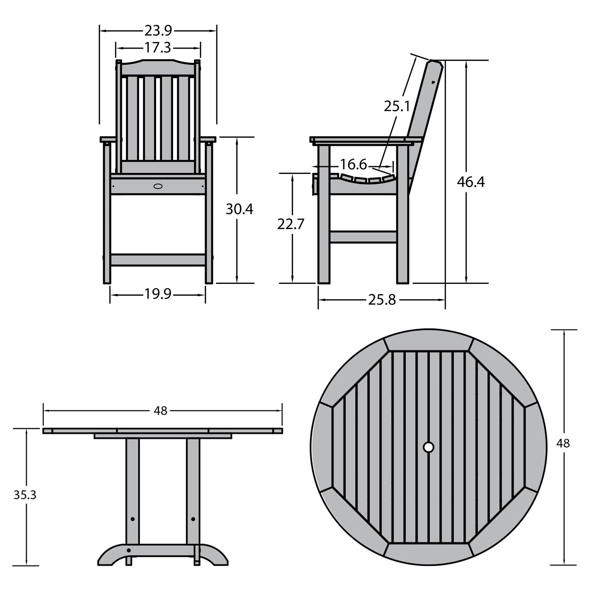 Ideal for entertaining guest during a backyard BBQs or for family gatherings on the deck, this 5-piece, 48-inch round dining set provides ample seating for four people. The counter-height table and four armchairs are designed to endure various weather conditions and UV exposure, all while replicating the aesthetic of natural wood without the upkeep. We adore how the slatted patterns infuse a coastal ambiance into your outdoor area while the backrest boast an elegant curved connecting you to the fixed armrests for added comfort. The round table features a central umbrella hole, granting you the option to introduce shade as needed.?
