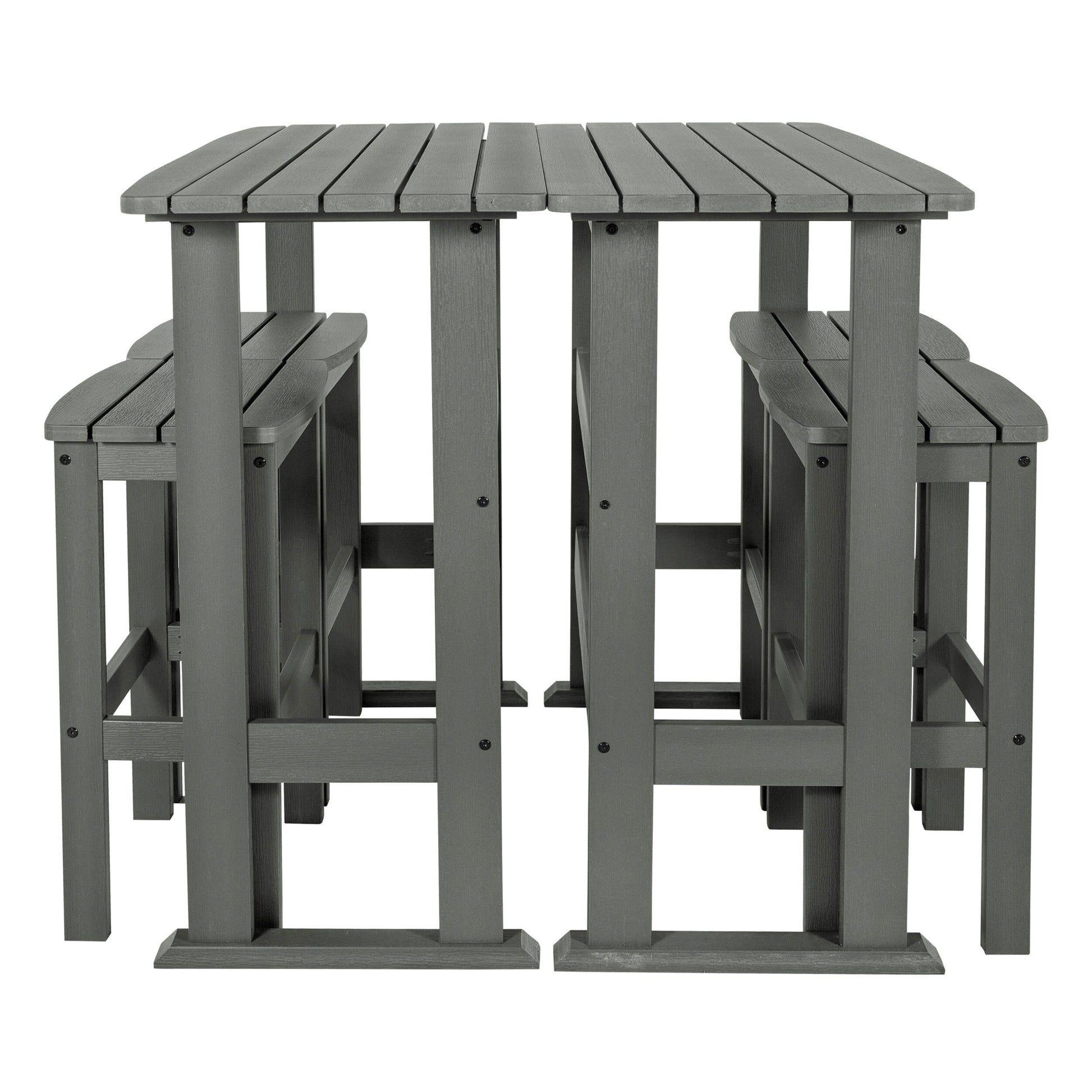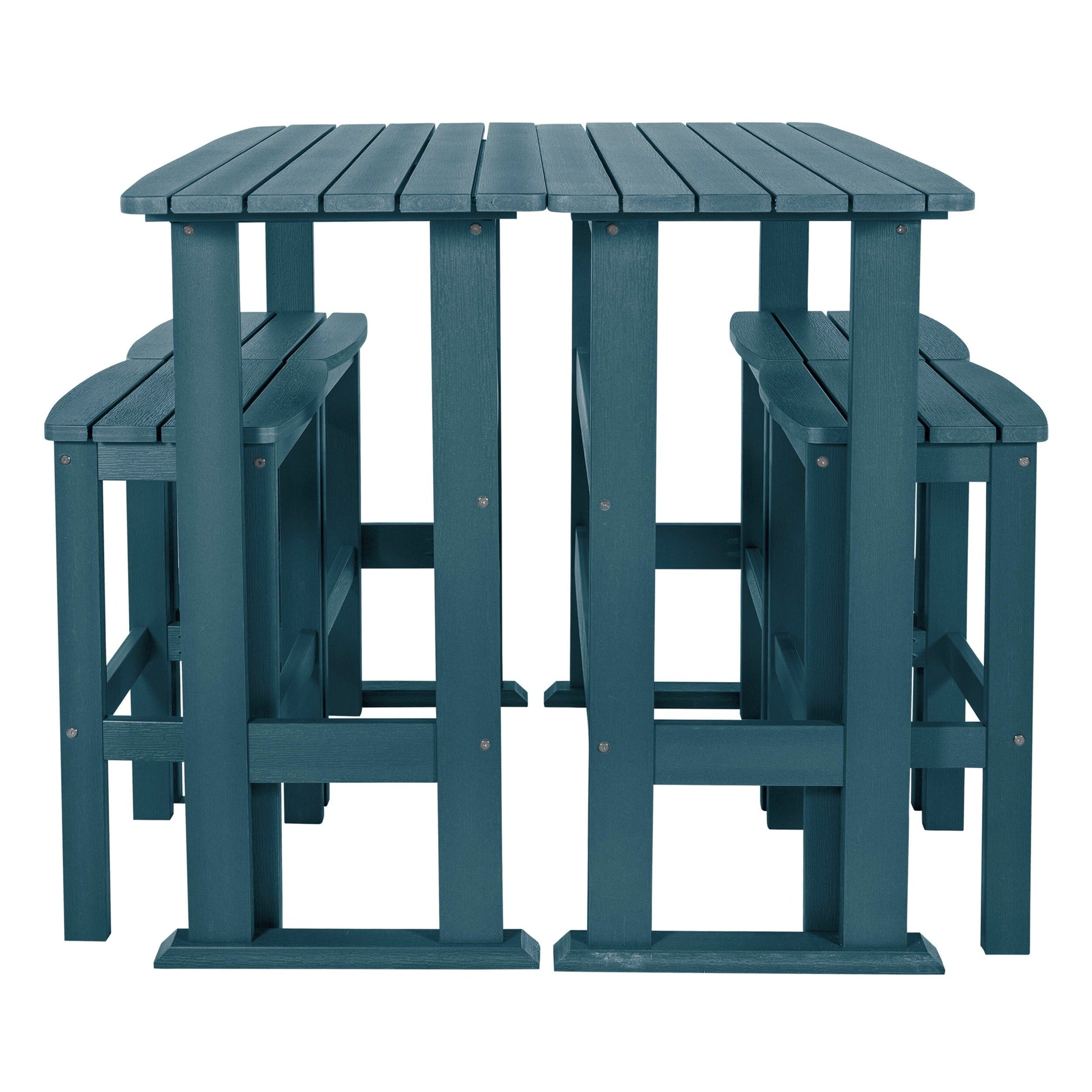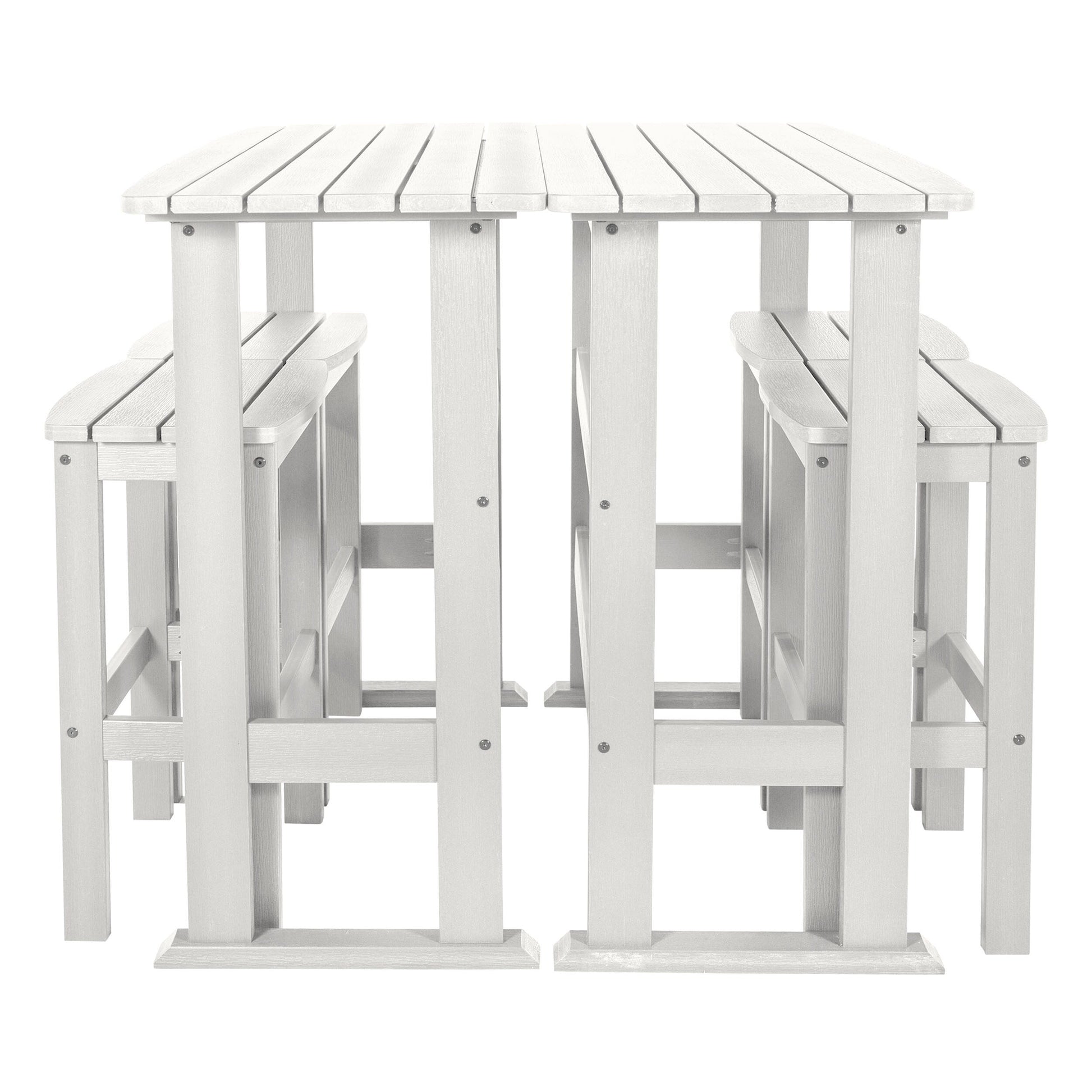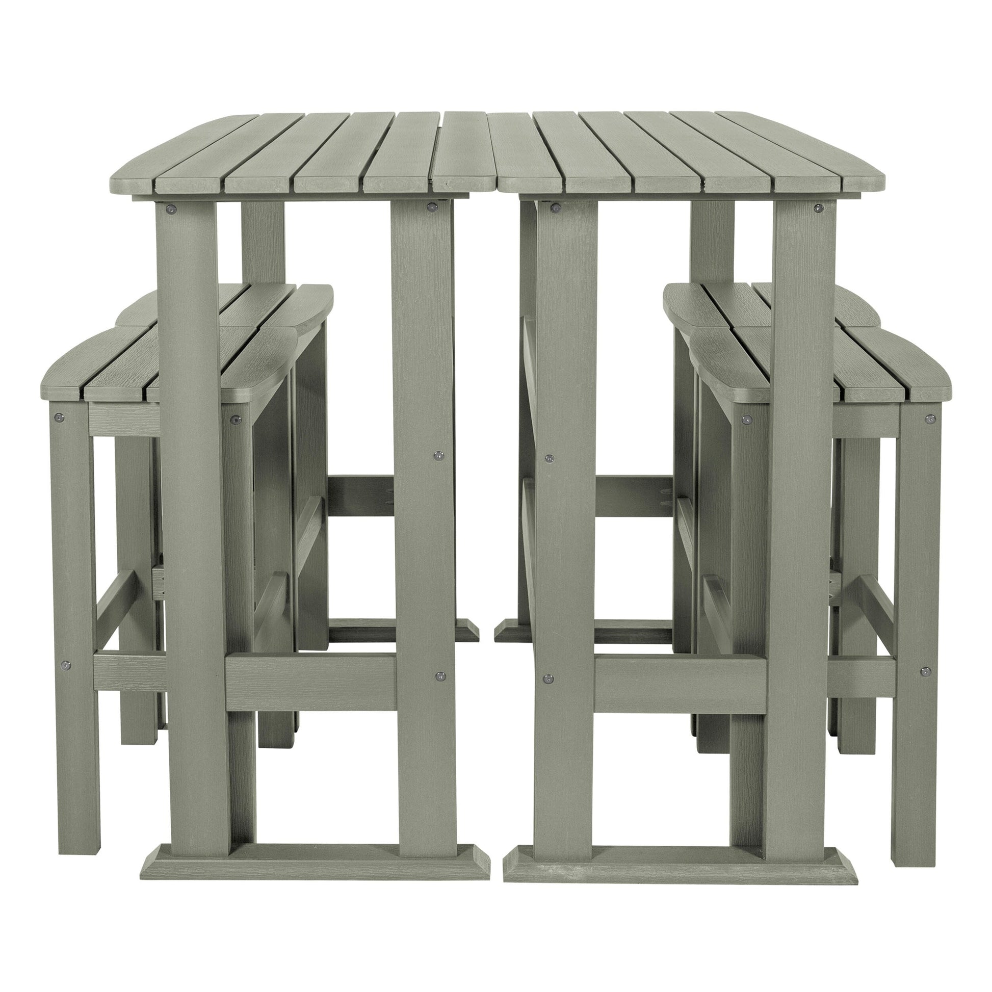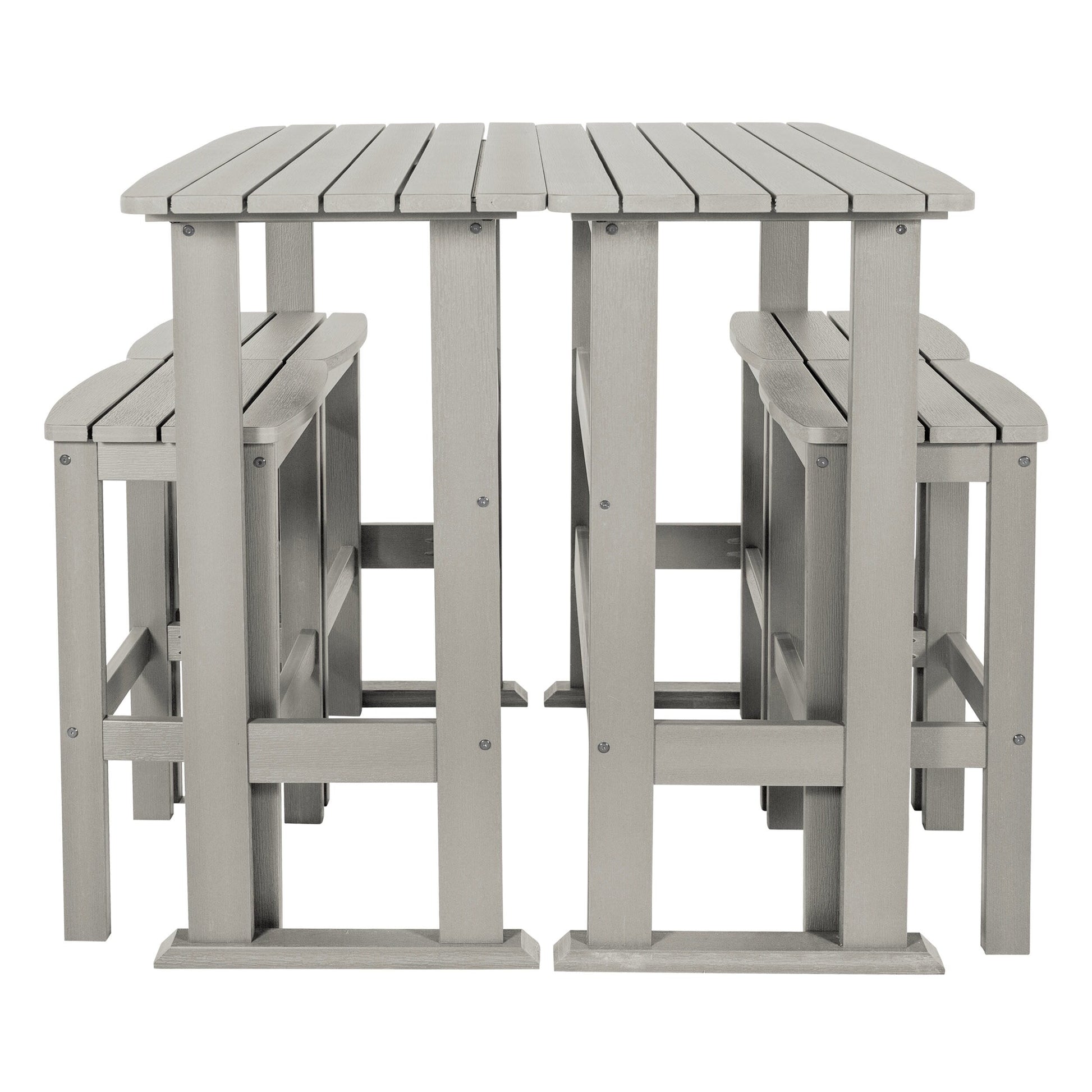 This outdoor dining set is perfect for enjoying a relaxed dinner during the week or a leisurely Sunday brunch on your porch or patio. It consists of two bar-height dining tables and four bar-height stools, all adorned with a slatted design that imparts a coastal ambiance to your outdoor space. Each table is constructed with trestle-style bases, providing ample surface area for dishes and decorative items. The armless stools feature built-in support bars, offering a comfortable footrest, and the added advantage of easy storage under the table when not in use for added convenience. Moreover, this dining set is designed to withstand the elements, making it suitable for year-round outdoor use.?