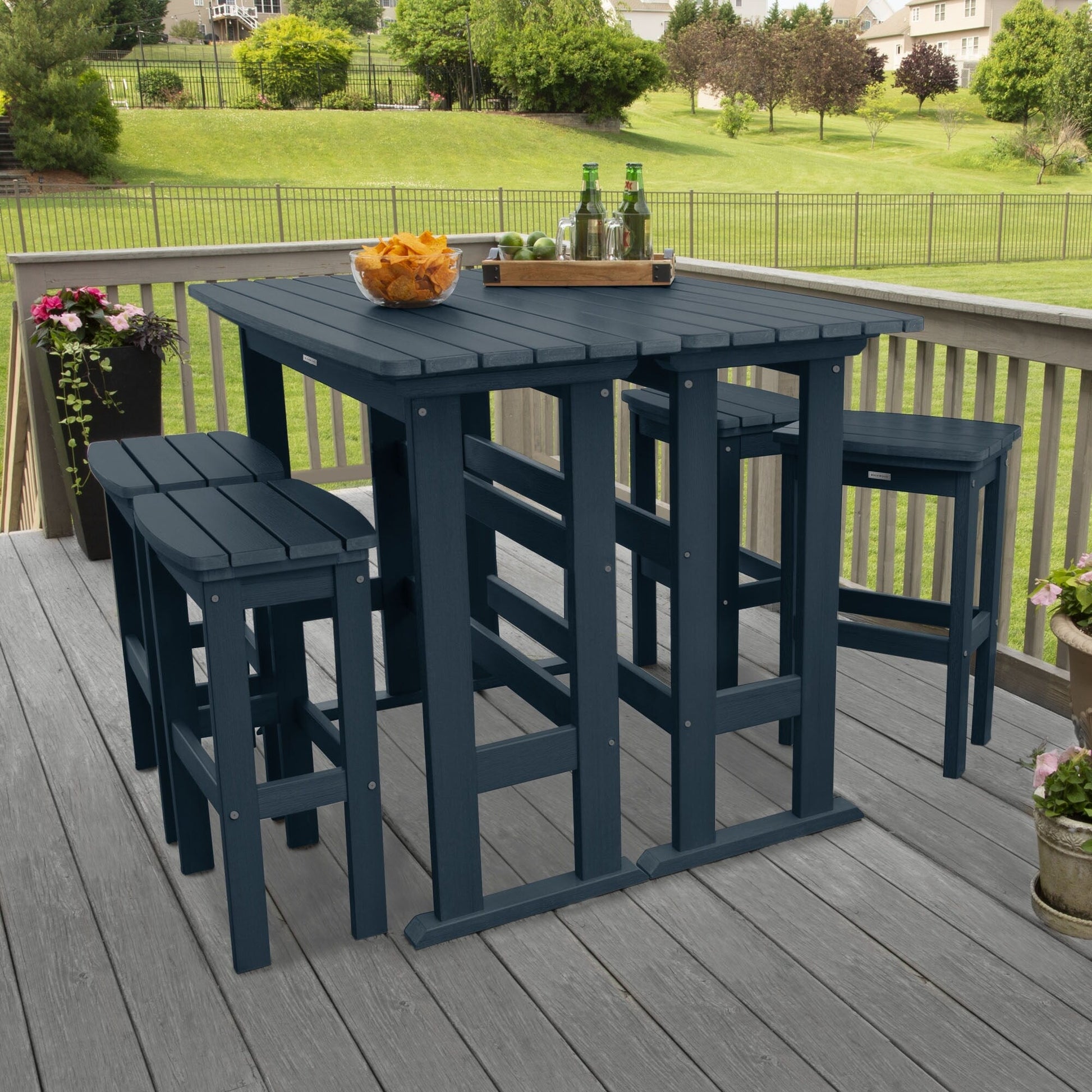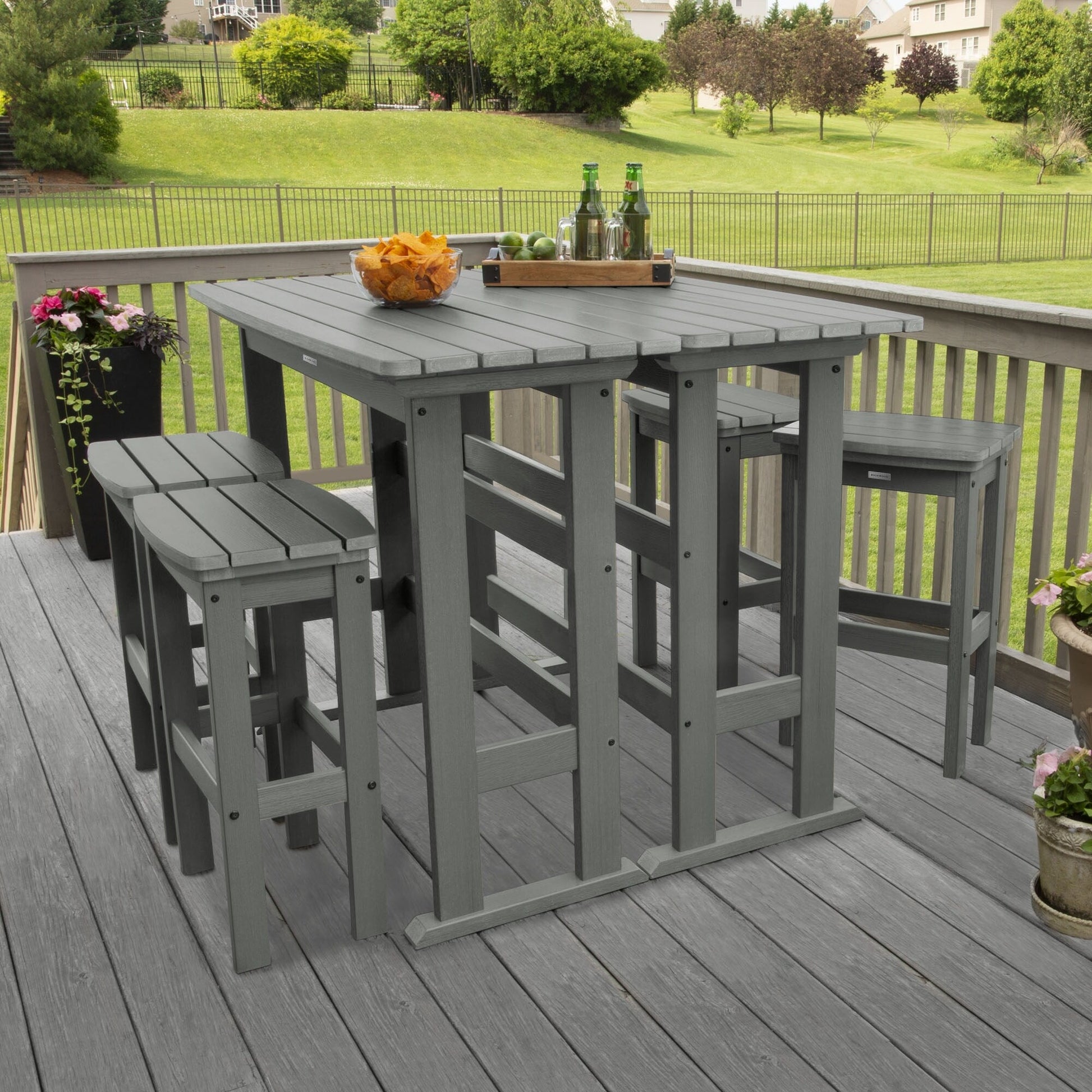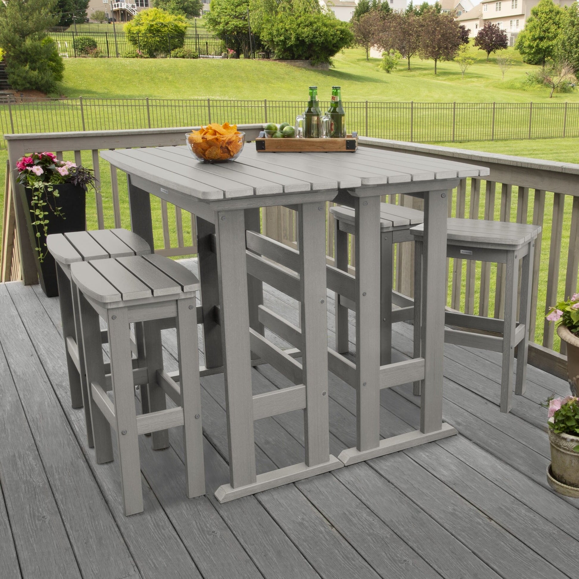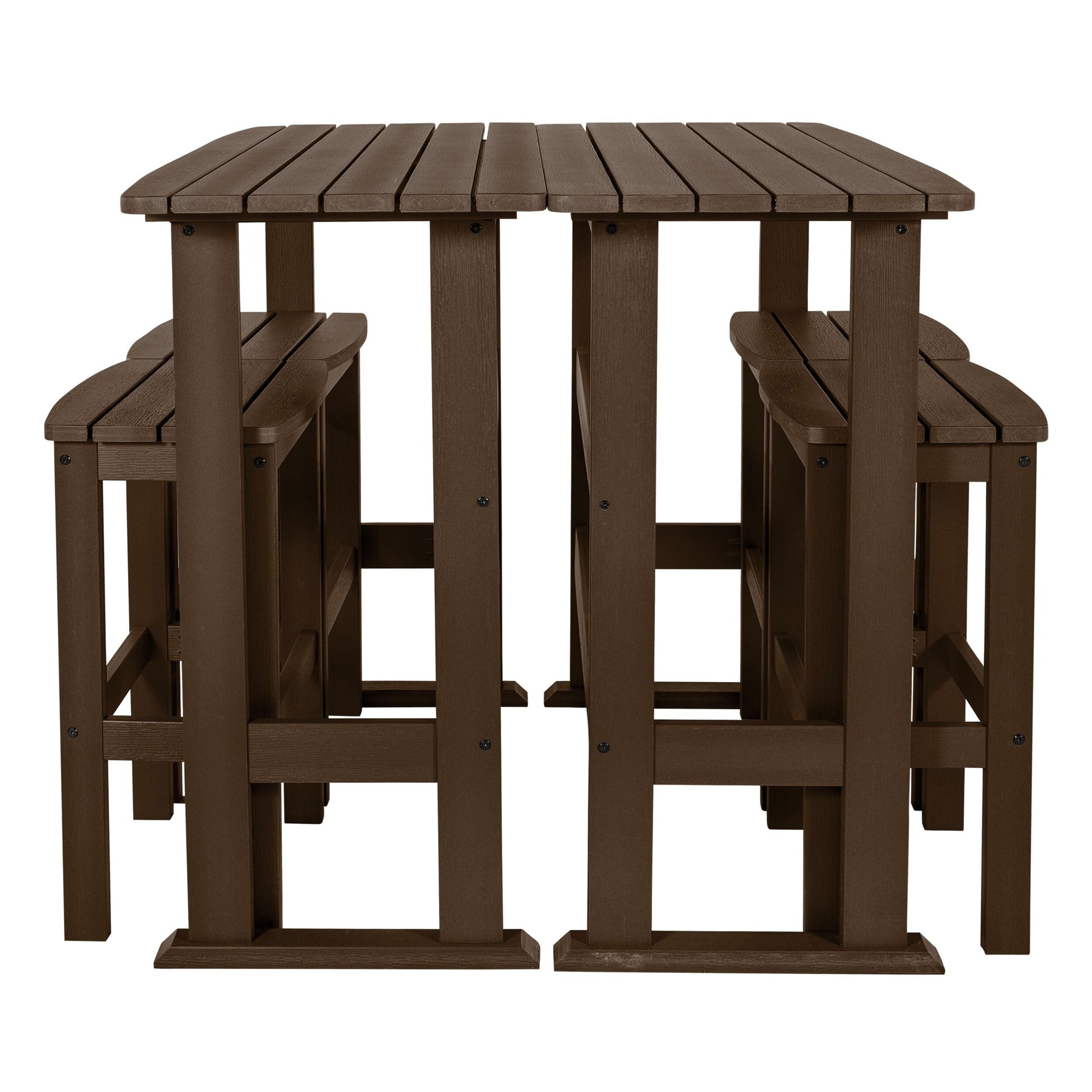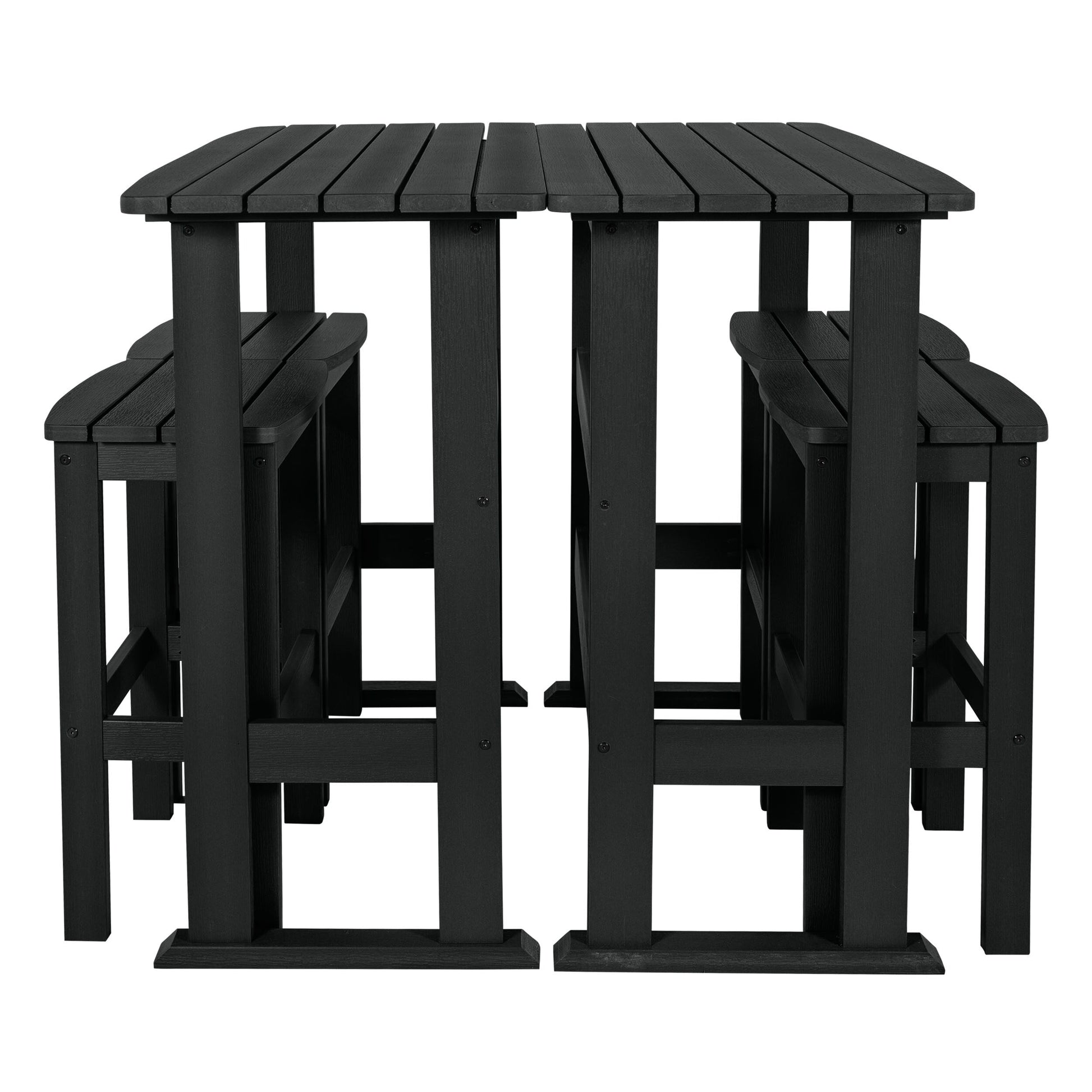 This outdoor dining set is perfect for enjoying a relaxed dinner during the week or a leisurely Sunday brunch on your porch or patio. It consists of two bar-height dining tables and four bar-height stools, all adorned with a slatted design that imparts a coastal ambiance to your outdoor space. Each table is constructed with trestle-style bases, providing ample surface area for dishes and decorative items. The armless stools feature built-in support bars, offering a comfortable footrest, and the added advantage of easy storage under the table when not in use for added convenience. Moreover, this dining set is designed to withstand the elements, making it suitable for year-round outdoor use.?