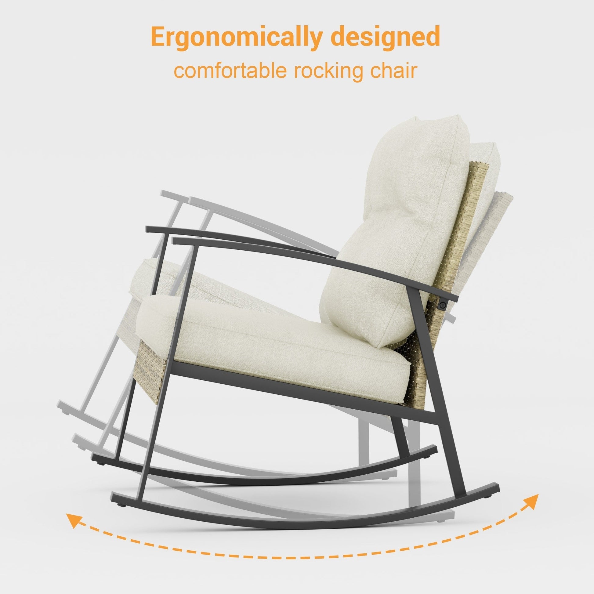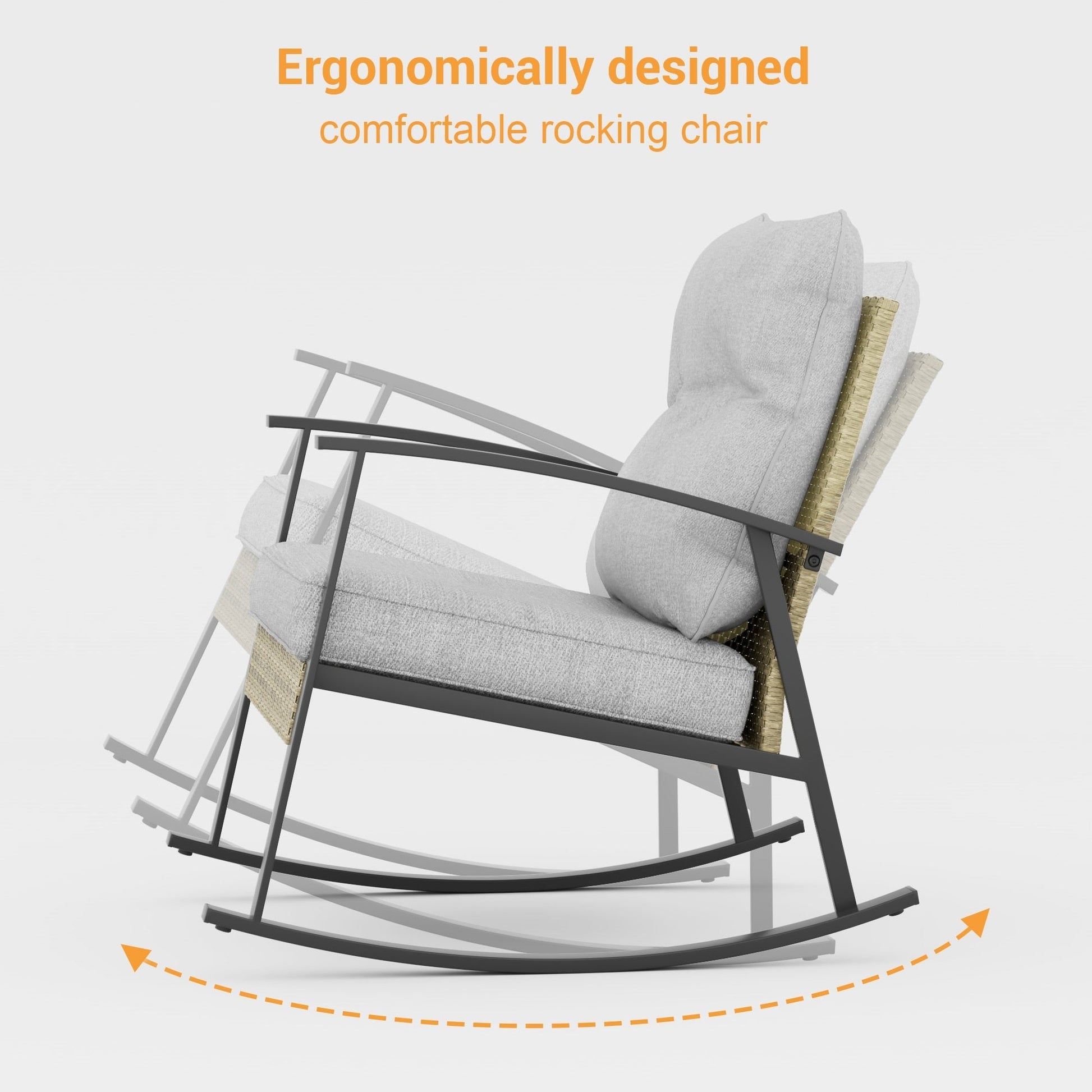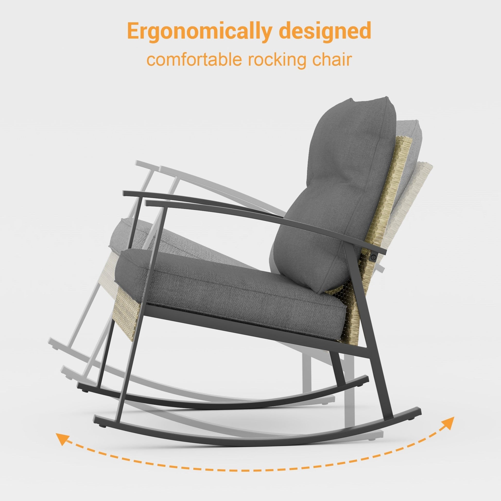 Do you still struggle to find the right place to drink and talk with friends? You need this set of sturdy rocking chairs, crafted from powder-coated steel with a maximum load capacity of 250 lbs. The tempered glass table is perfect for holding your wine glasses, snacks, and favorite books, while the widened and thickened sponge cushions provide ultimate relaxation. ?