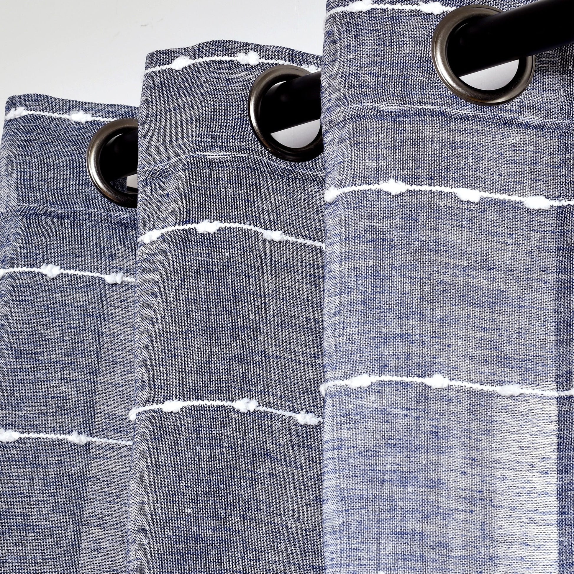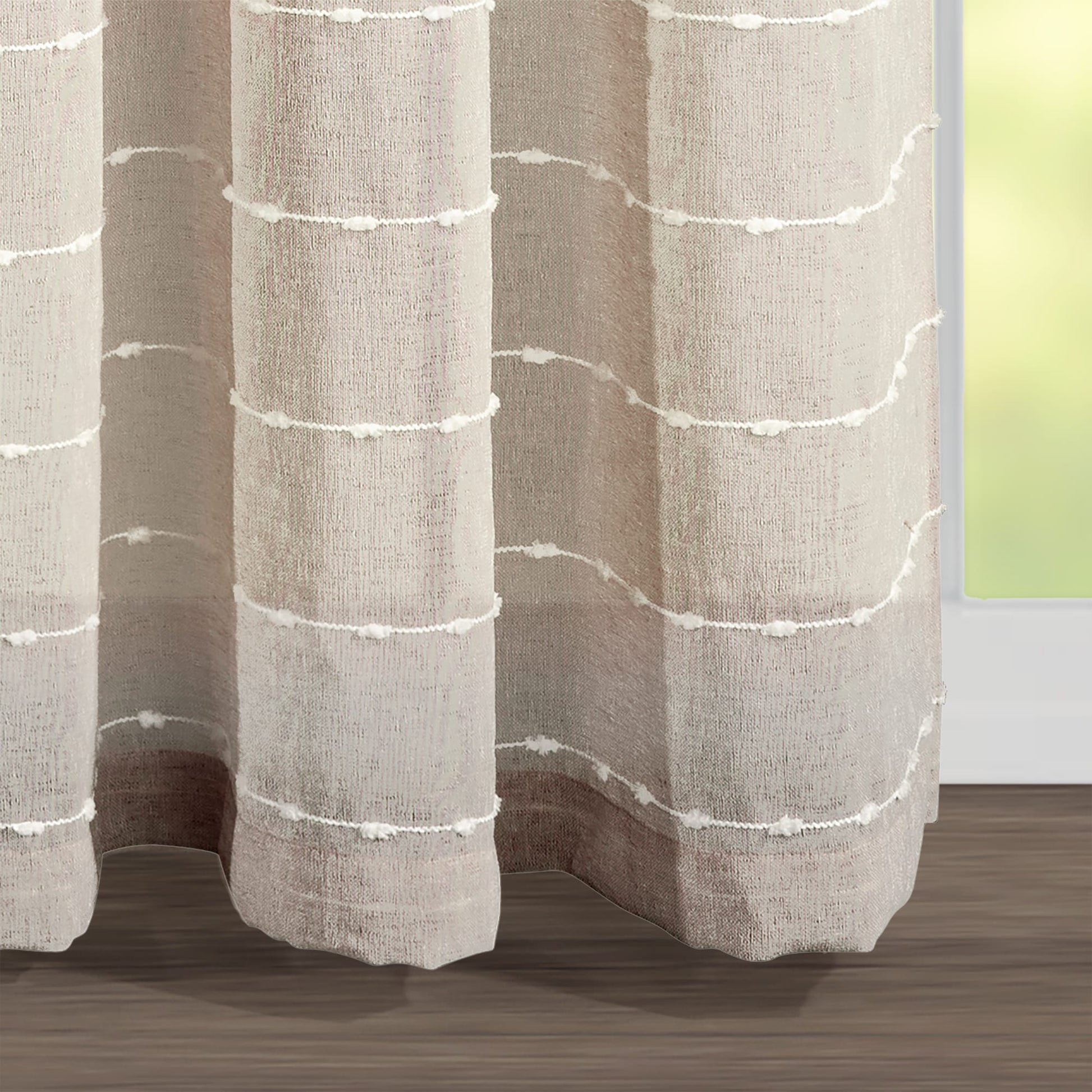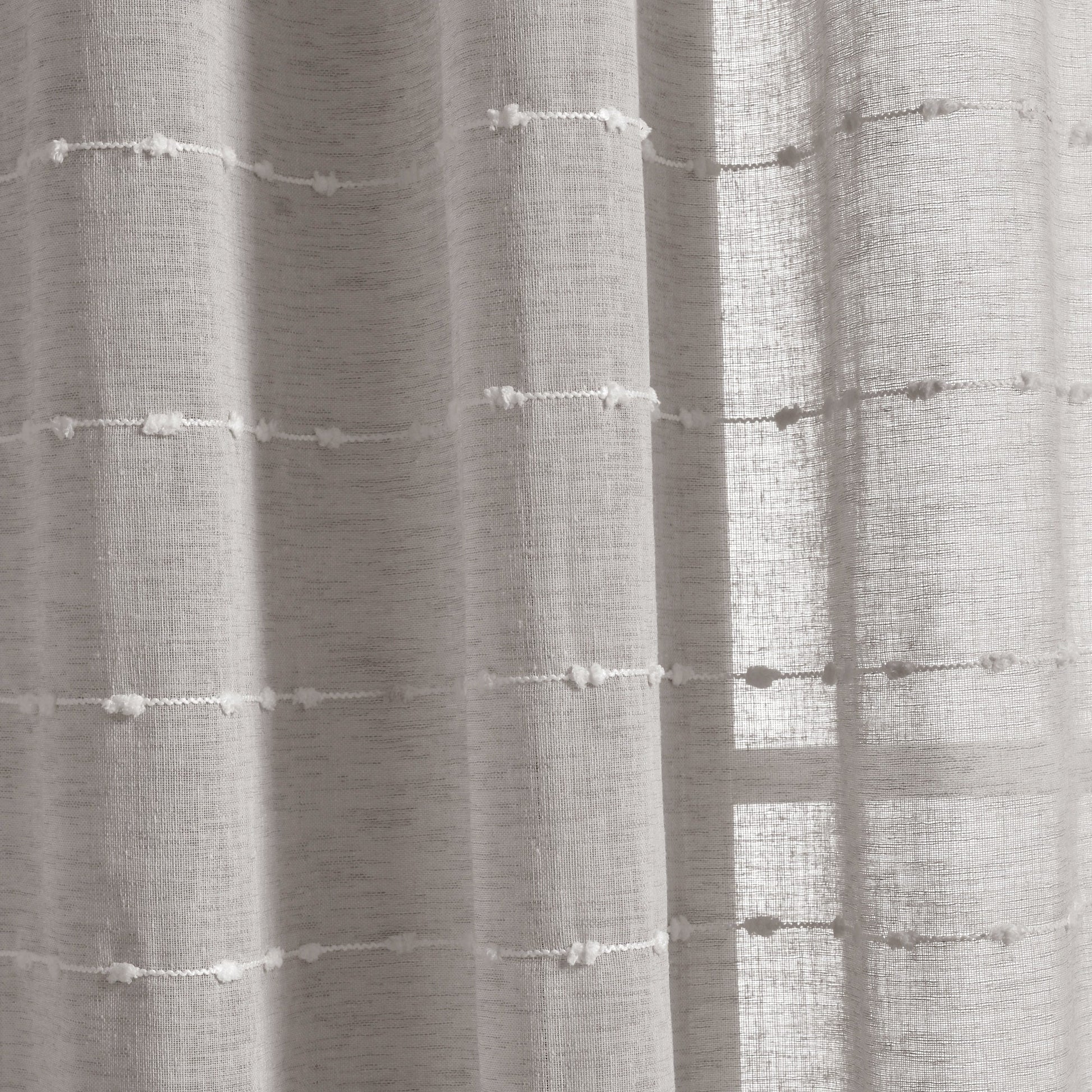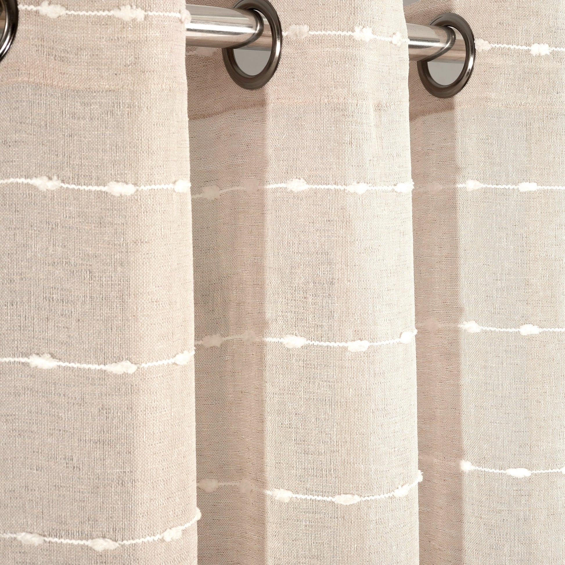 Let your living room bask in a serene and sophisticated ambiance with these Lush Decor Farmhouse Textured Grommet Sheer Window Curtain Panels. These curtains are made of 100% polyester, ensuring their endurance and longevity. The dotted stripe patterns add a transitional charm to these sheer curtains that let ample light in while providing privacy.